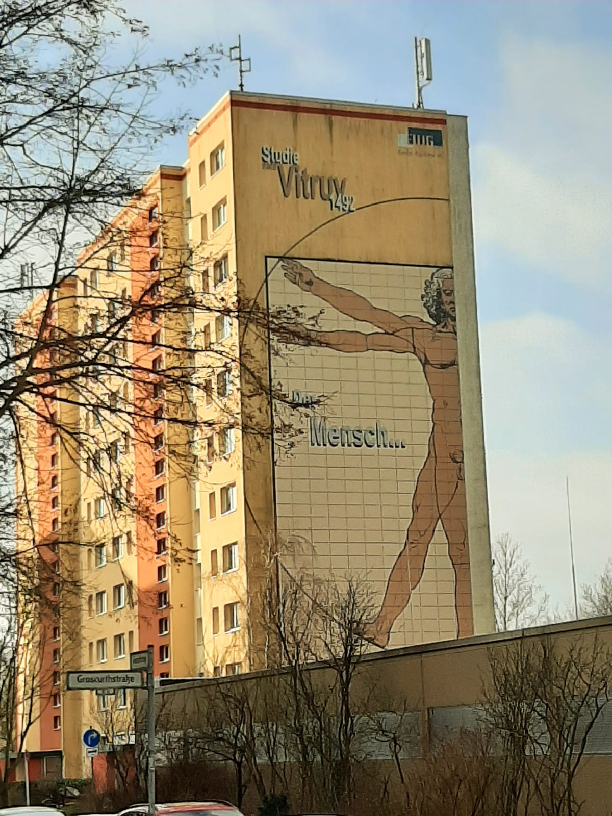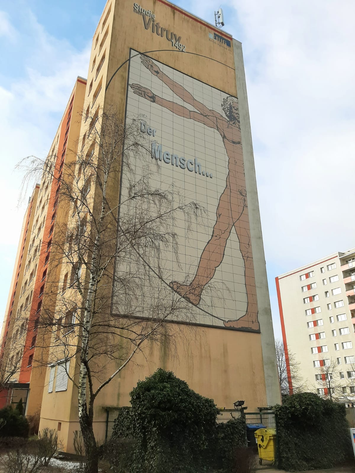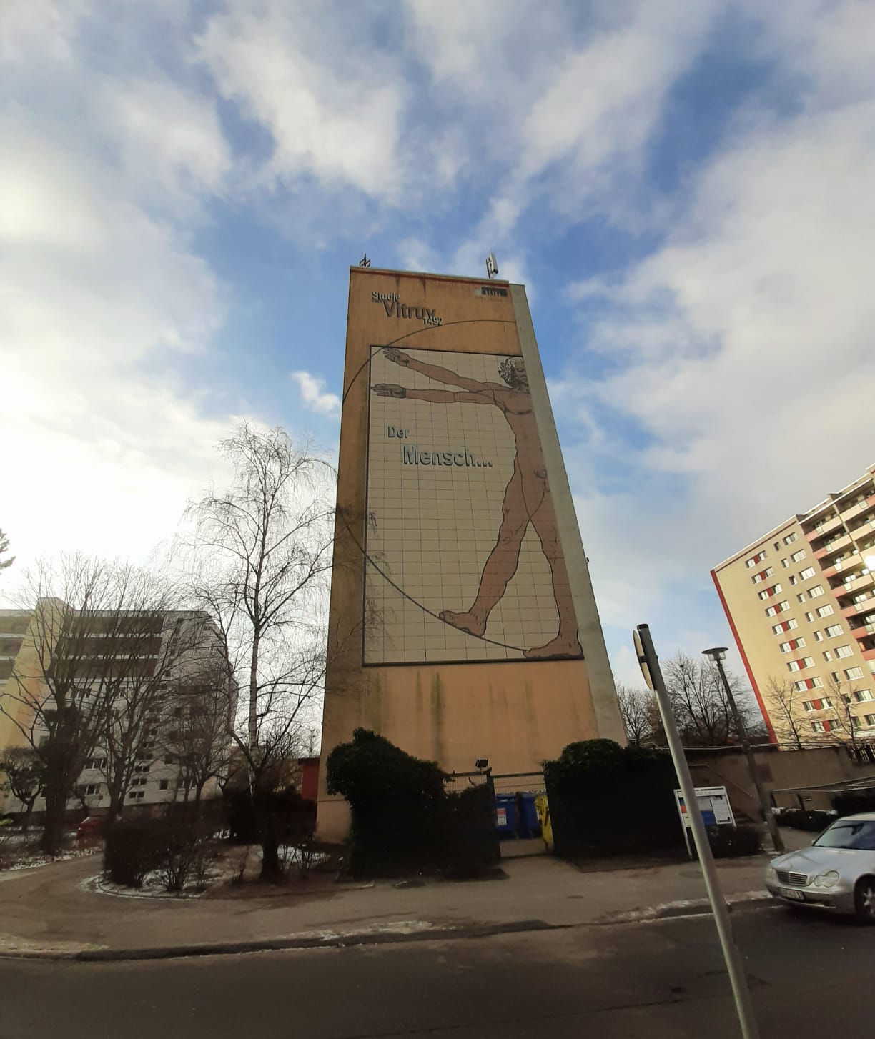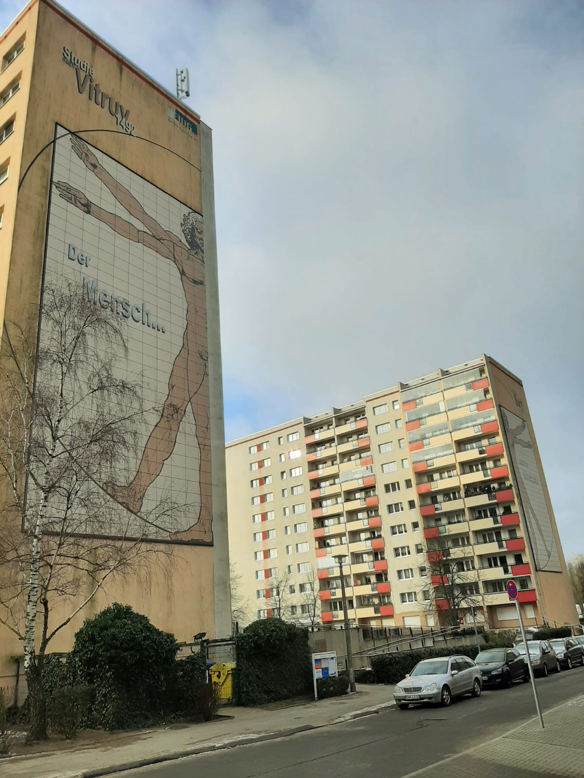 This mural is part of a double wall painting created in 2005 by the housing cooperative EWG Pankow, the Erste Wohnungsgenossenschaft Berlin-Pankow. The combined sentece says „Der Mensch steht im Mittelpunkt“, which means in English „The Human Being is in the Center“. Here is the right part, check out as well the corresponding second mural at Walter Friedrich 3.