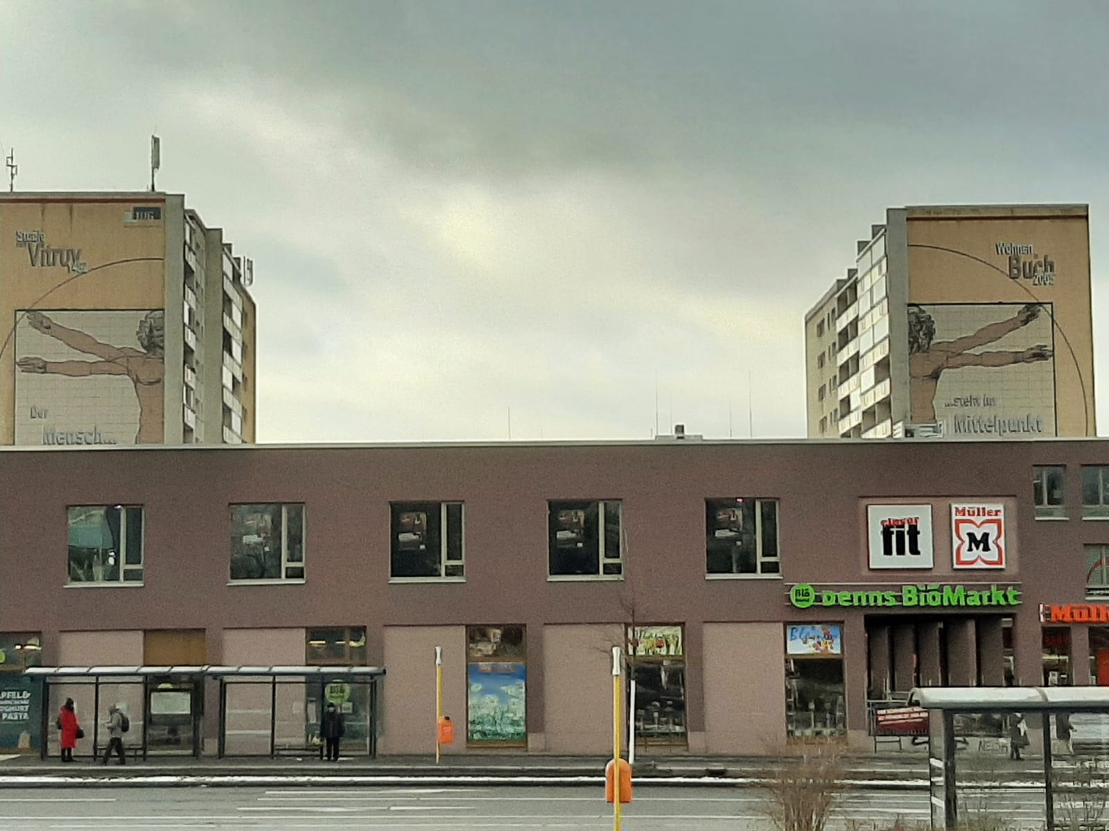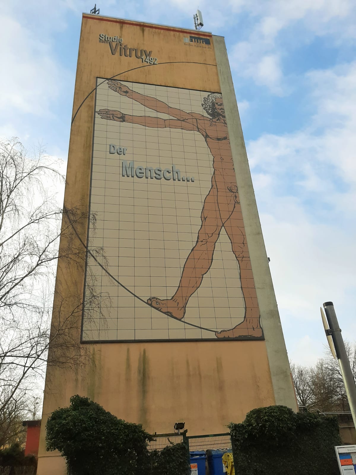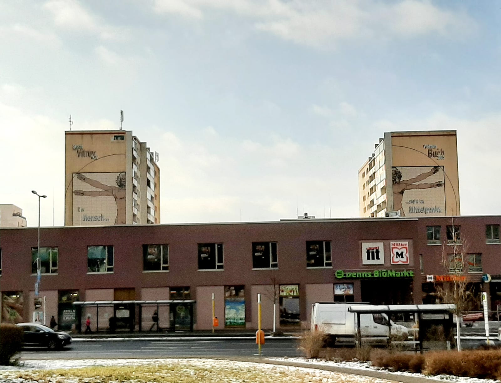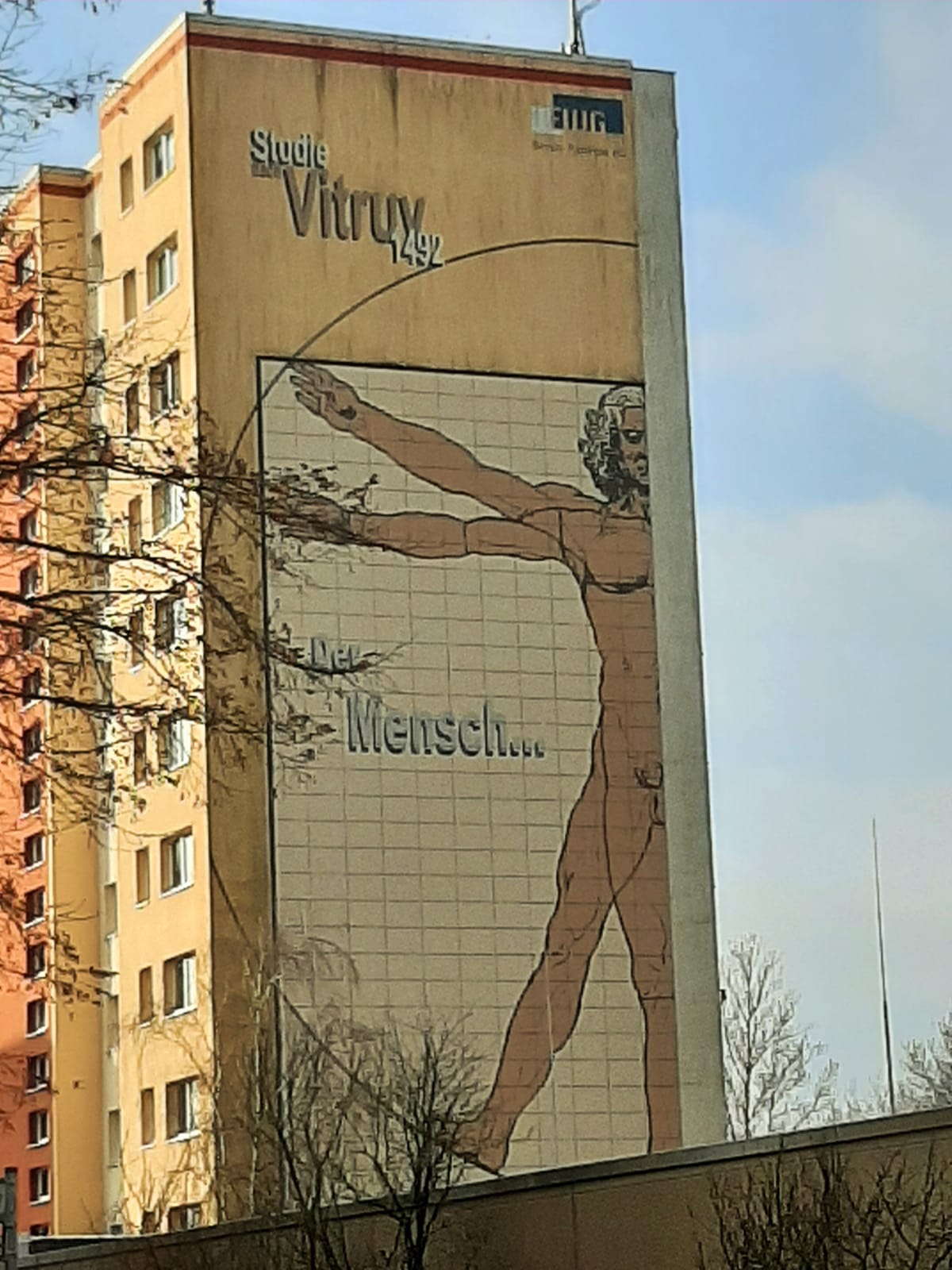 This mural is part of a double wall painting created in 2005 by the housing cooperative EWG Pankow, the Erste Wohnungsgenossenschaft Berlin-Pankow. The combined sentece says „Der Mensch steht im Mittelpunkt“, which means in English „The Human Being is in the Center“. Here is the right part, check out as well the corresponding second mural at Walter Friedrich 3.