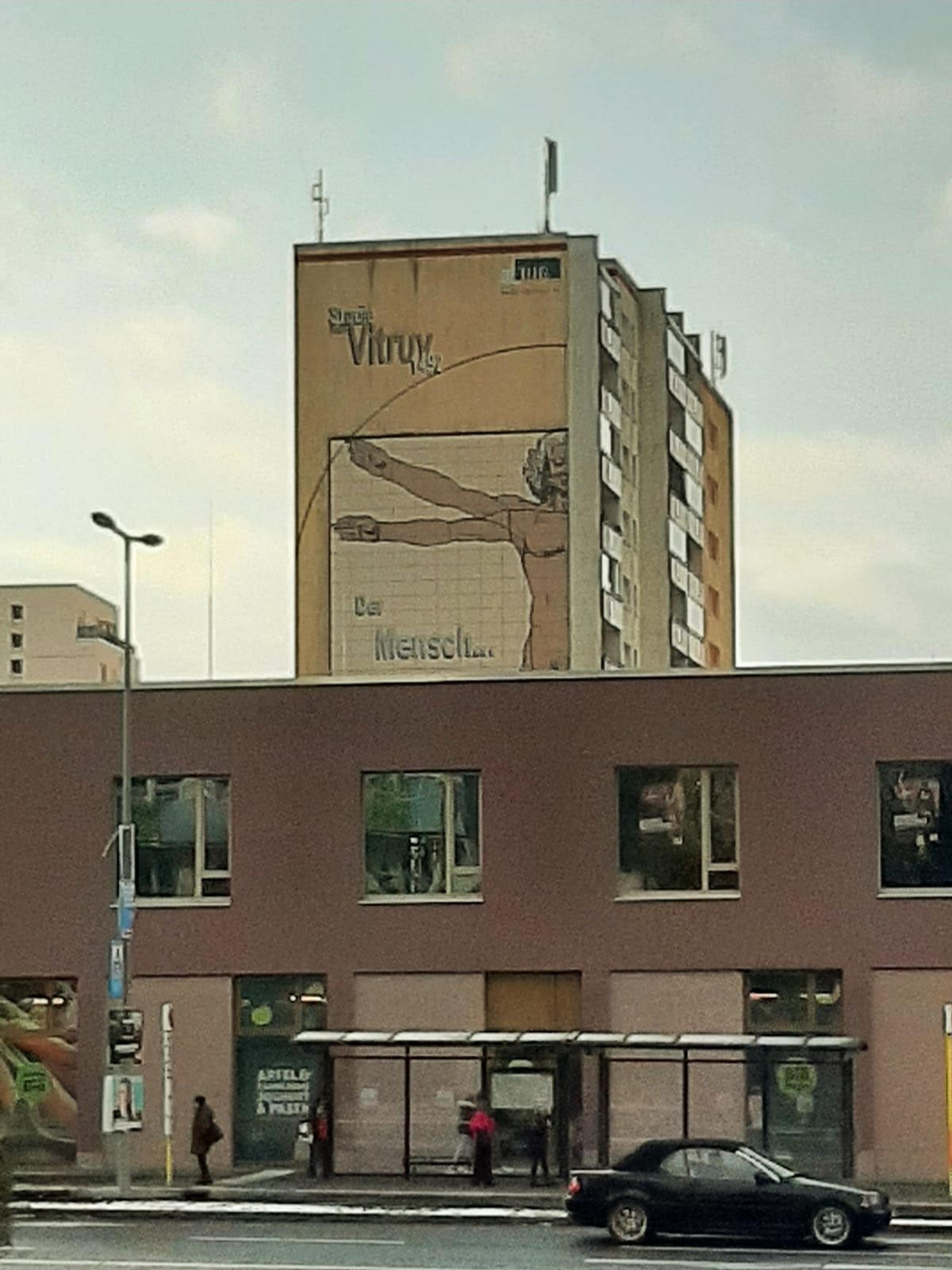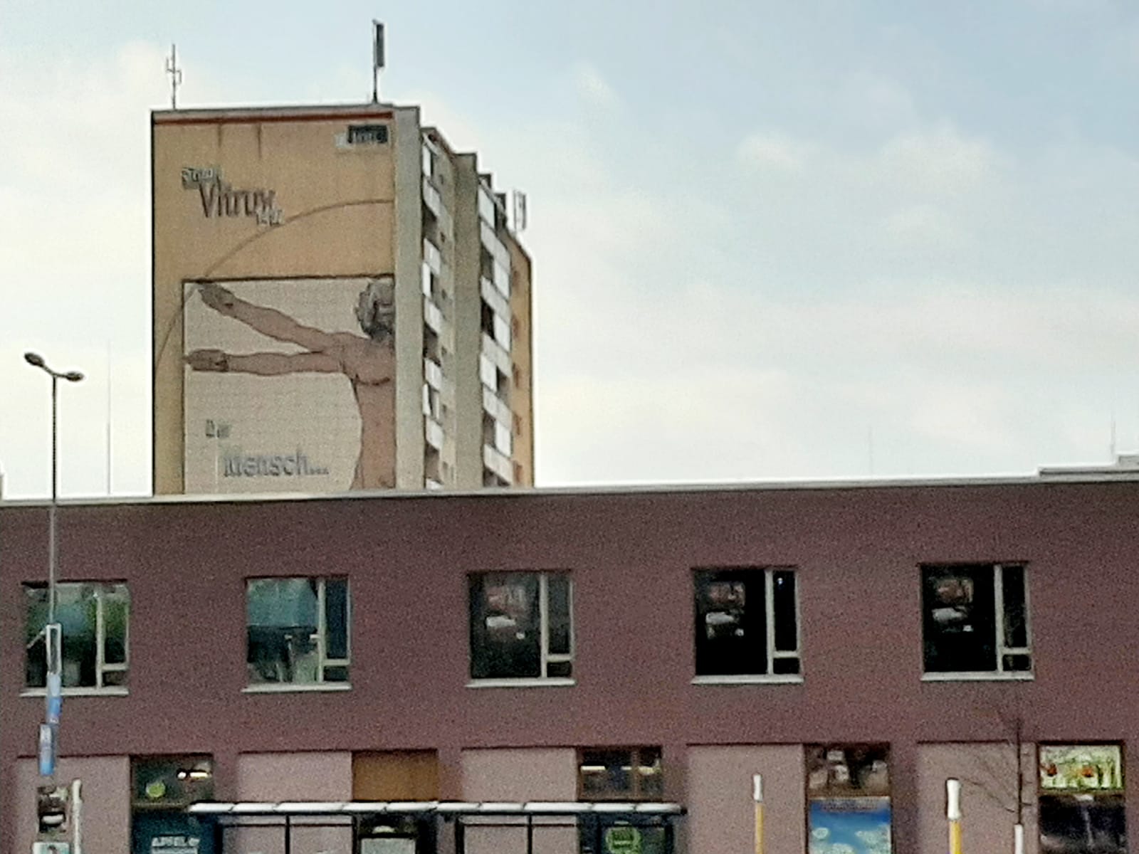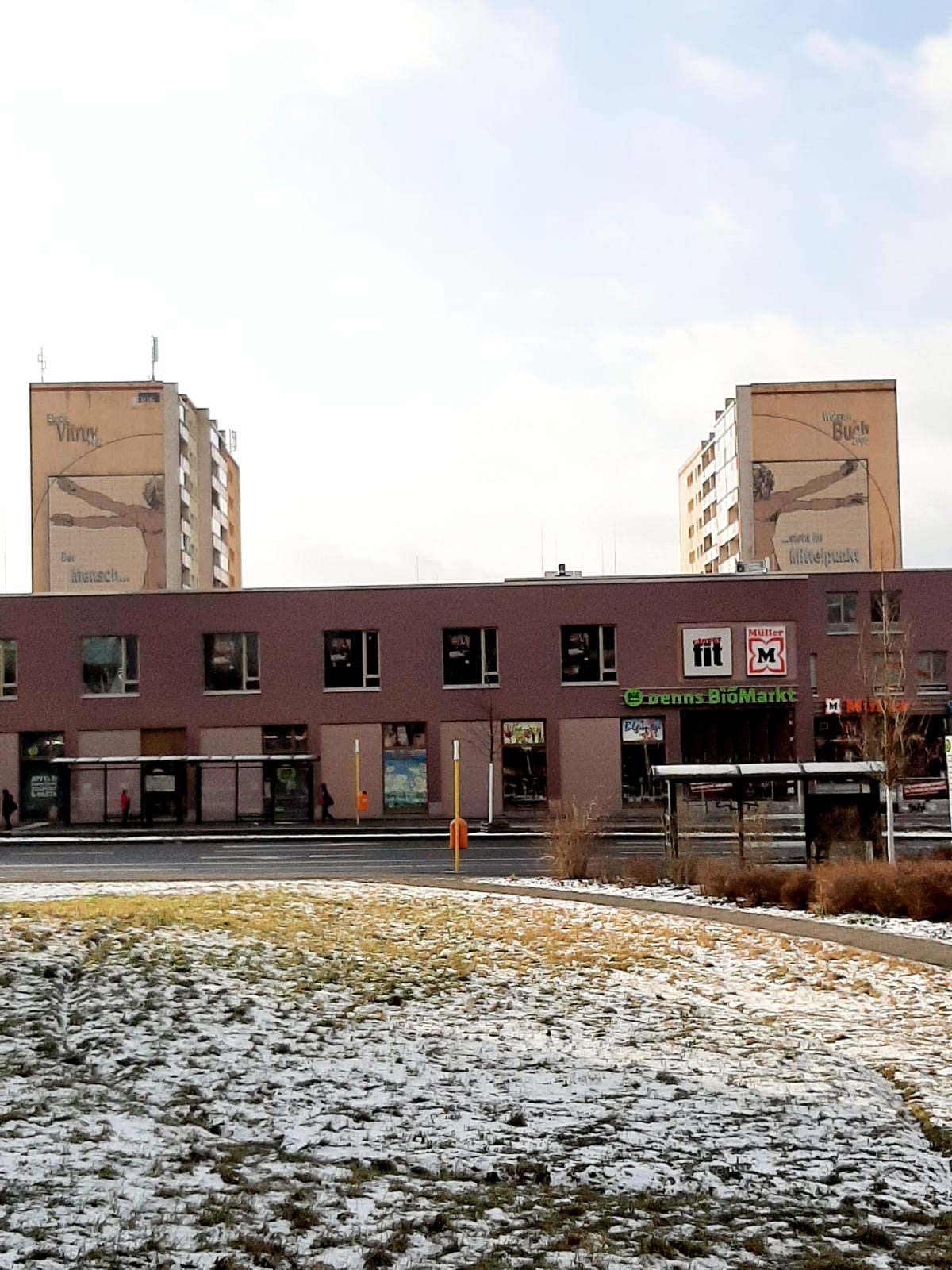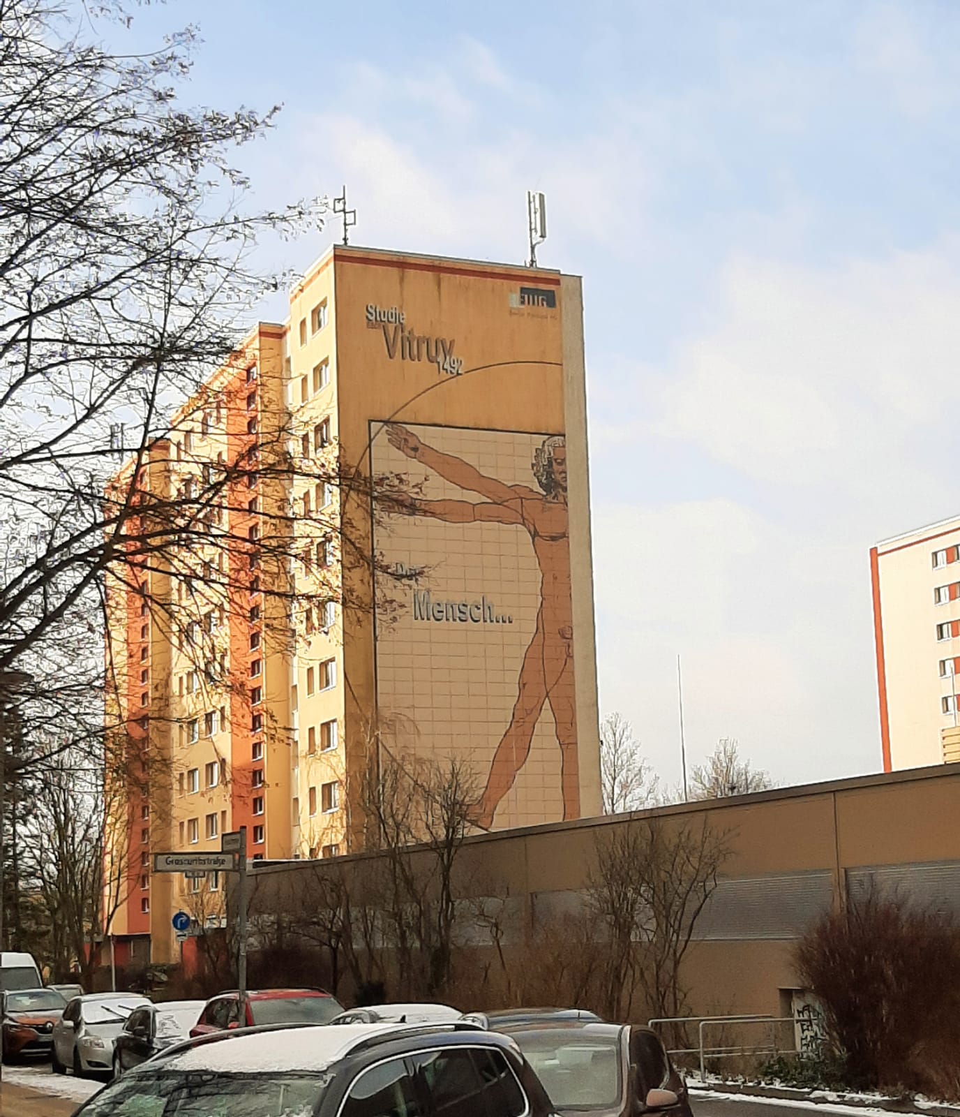 This mural is part of a double wall painting created in 2005 by the housing cooperative EWG Pankow, the Erste Wohnungsgenossenschaft Berlin-Pankow. The combined sentece says „Der Mensch steht im Mittelpunkt“, which means in English „The Human Being is in the Center“. Here is the right part, check out as well the corresponding second mural at Walter Friedrich 3.
