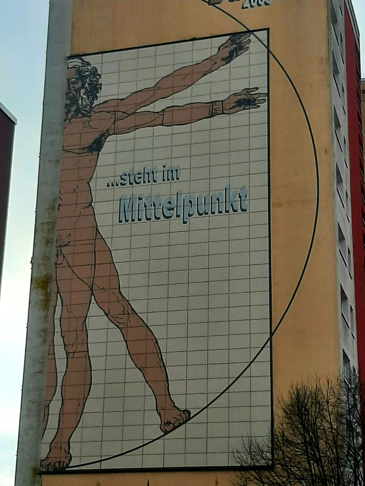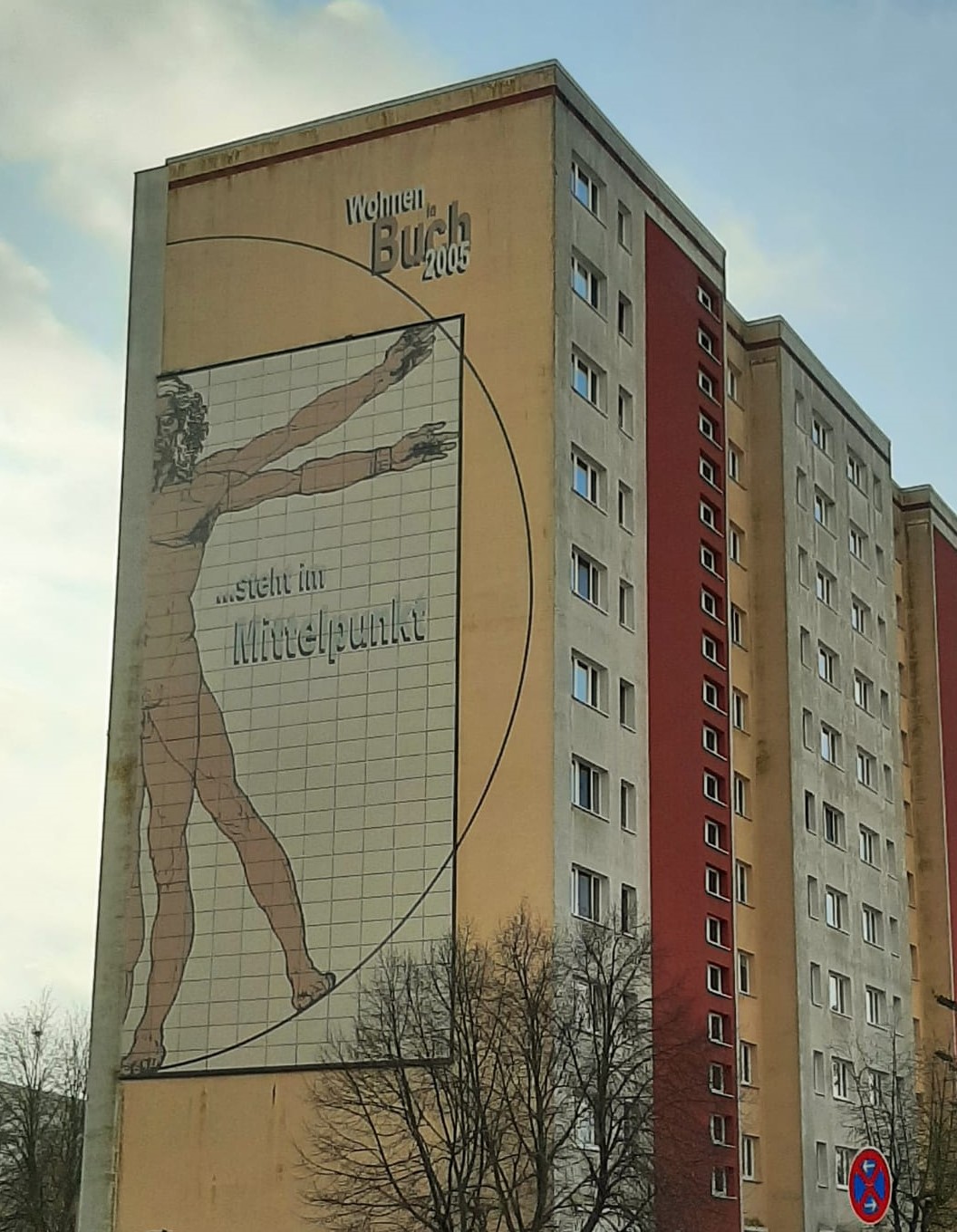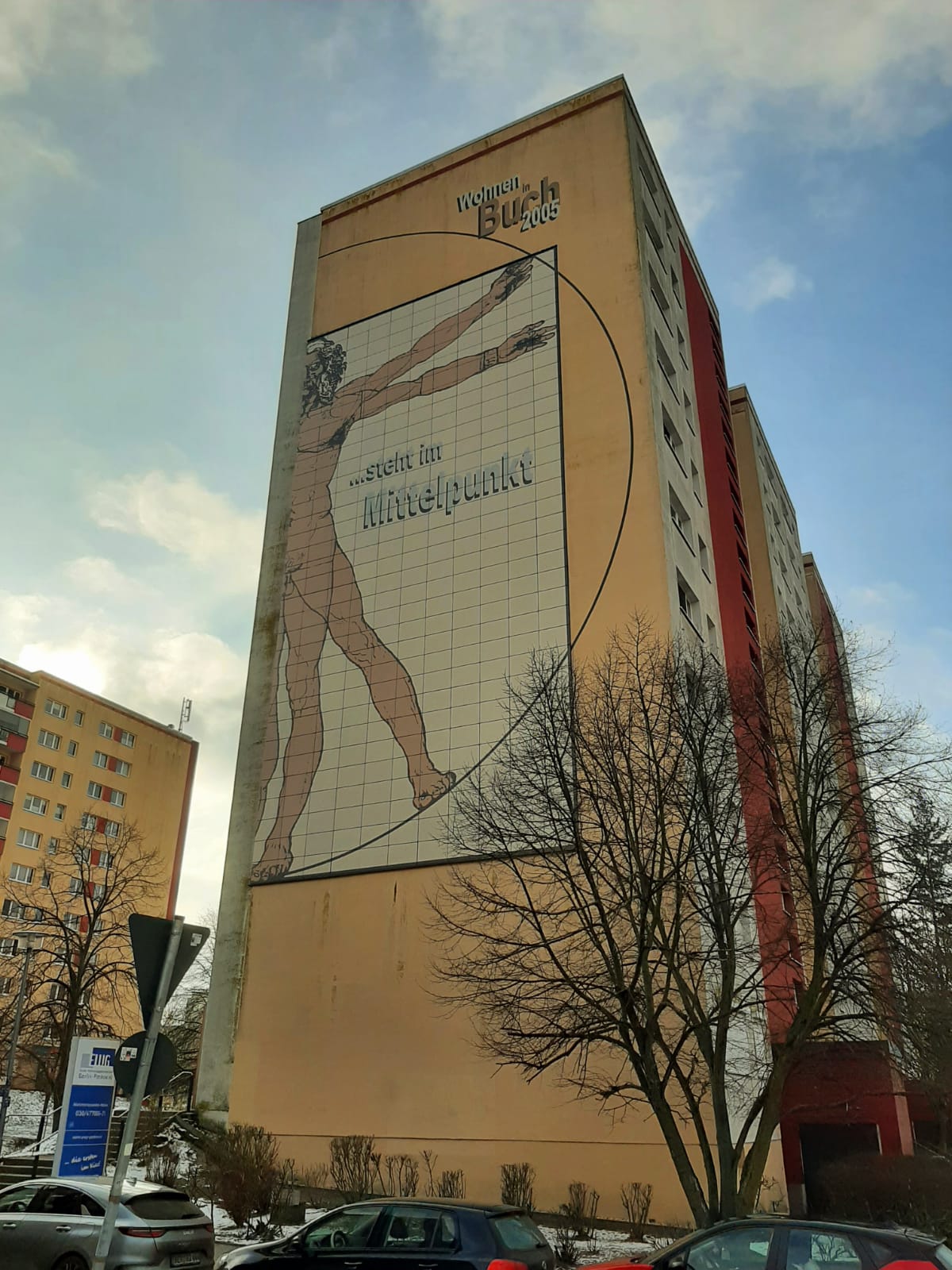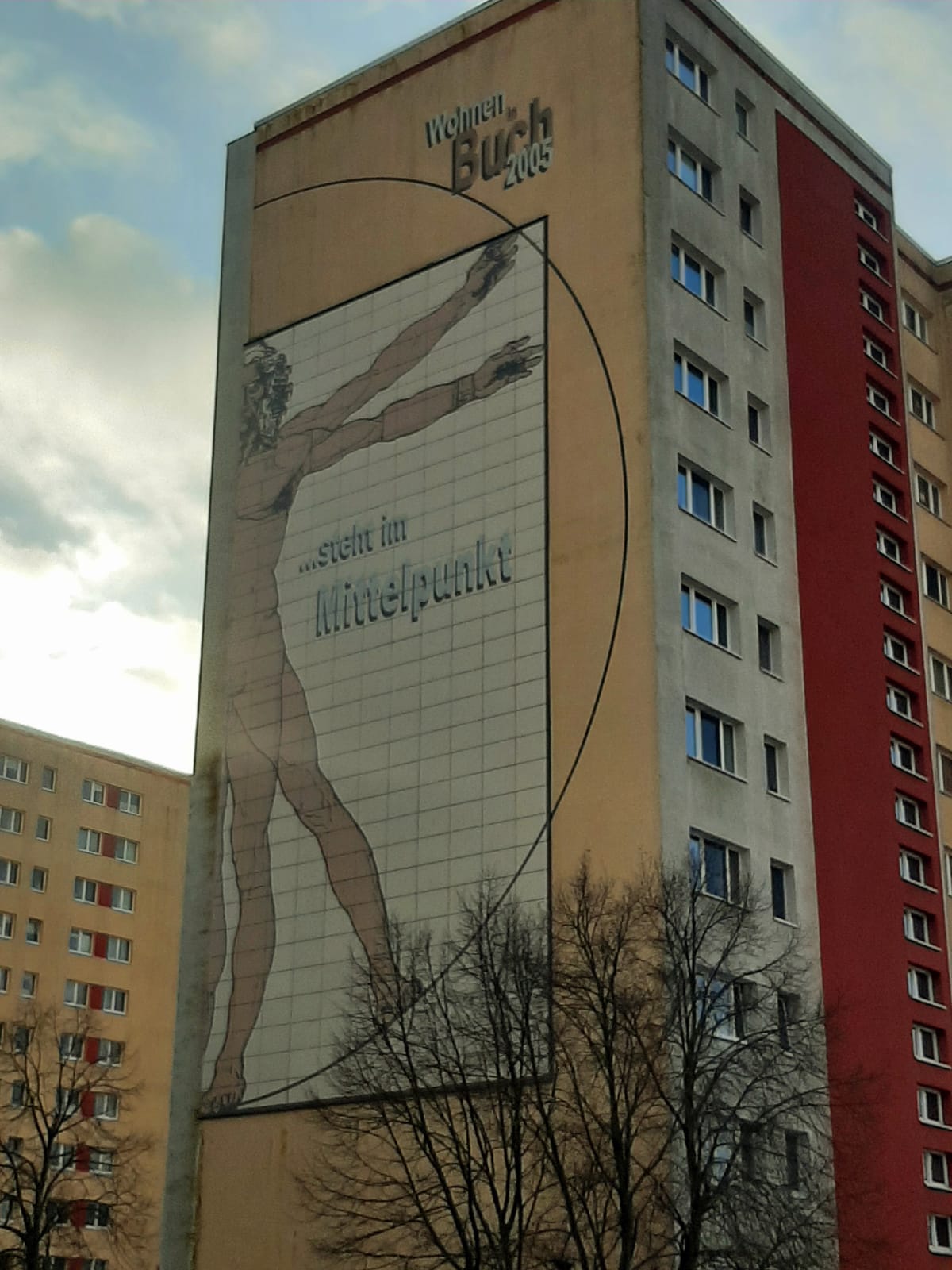 This mural is part of a double wall painting created in 2005 by the housing cooperative EWG Pankow, the Erste Wohnungsgenossenschaft Berlin-Pankow. The combined sentece says „Der Mensch steht im Mittelpunkt“, which means in English „The Human Being is in the Center“. Here is the right part, check out as well the corresponding second mural at Groscurth 2.
