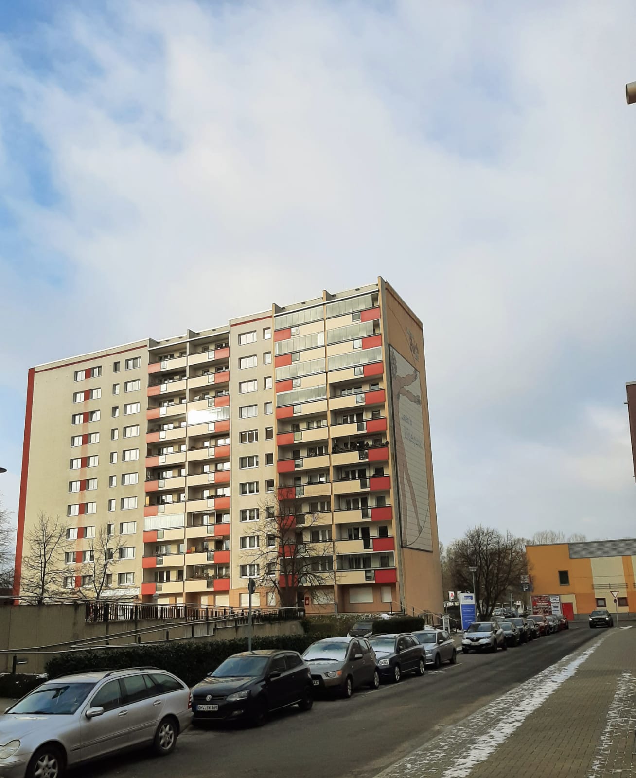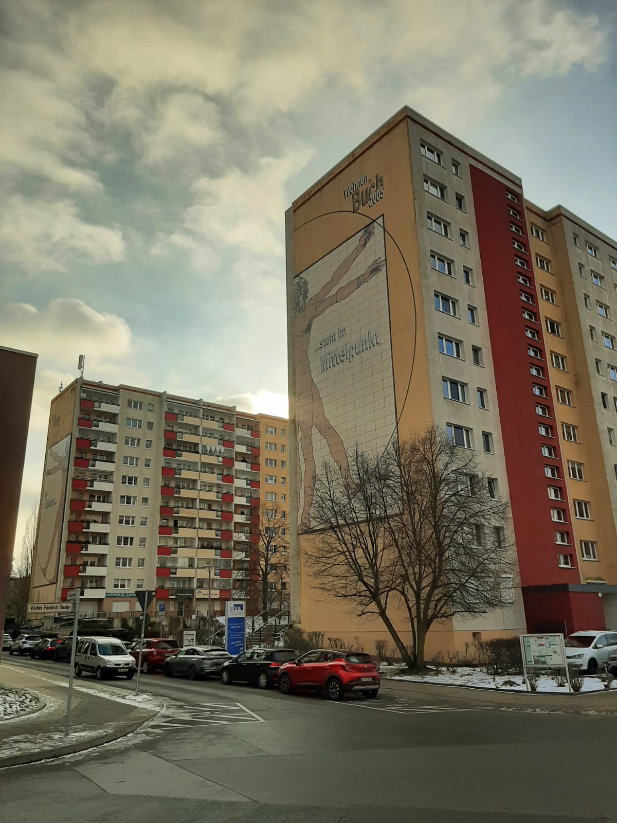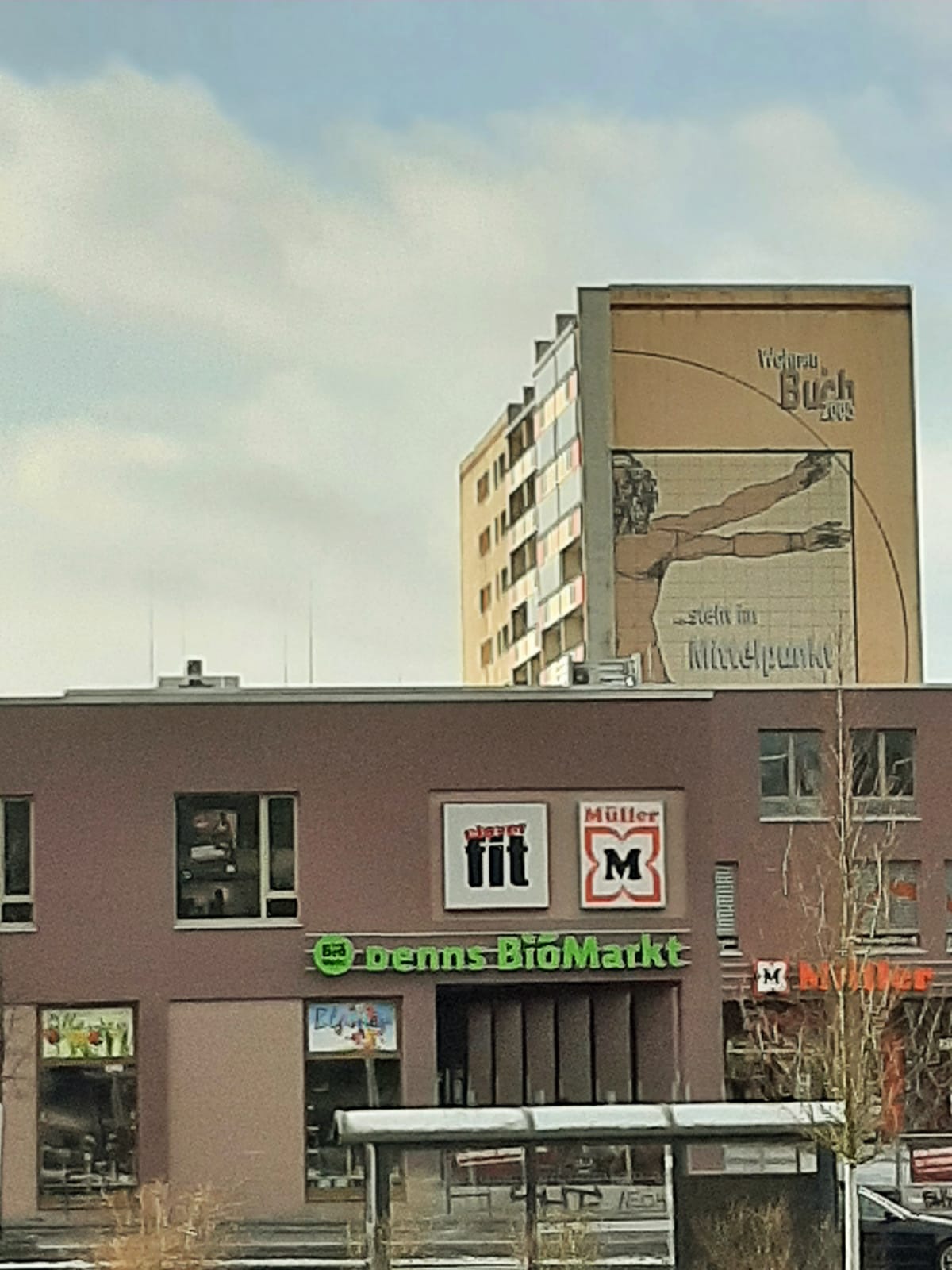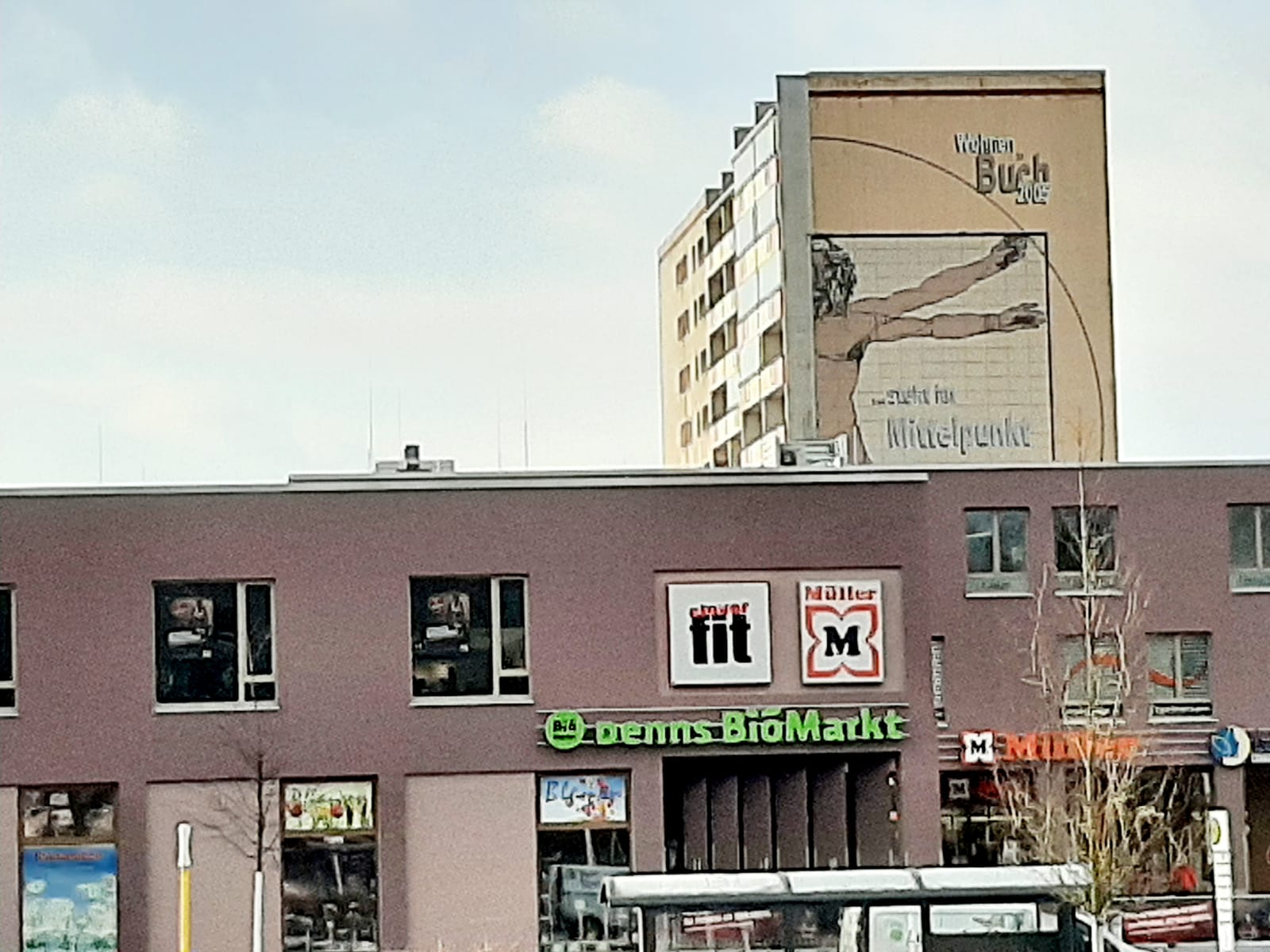 This mural is part of a double wall painting created in 2005 by the housing cooperative EWG Pankow, the Erste Wohnungsgenossenschaft Berlin-Pankow. The combined sentece says „Der Mensch steht im Mittelpunkt“, which means in English „The Human Being is in the Center“. Here is the right part, check out as well the corresponding second mural at Groscurth 2.