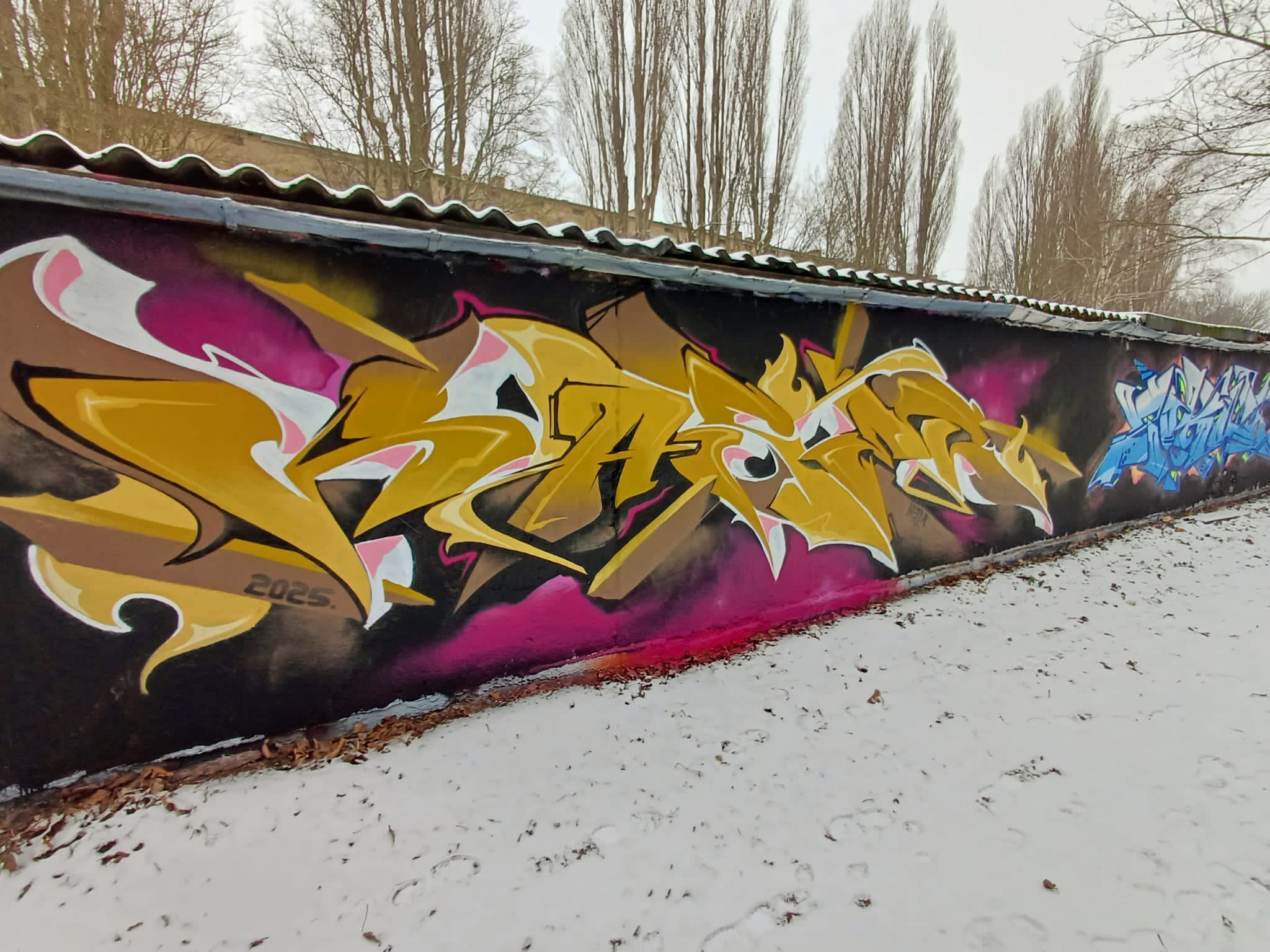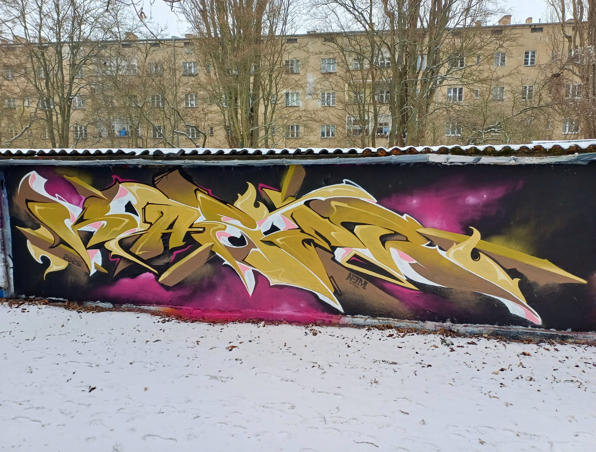 The graffiti on the left is from ZORN, the little Reaper with the balloon is from BLACK SKULL, the Donald on the right is from unknown and the graffiti was made by DZUM