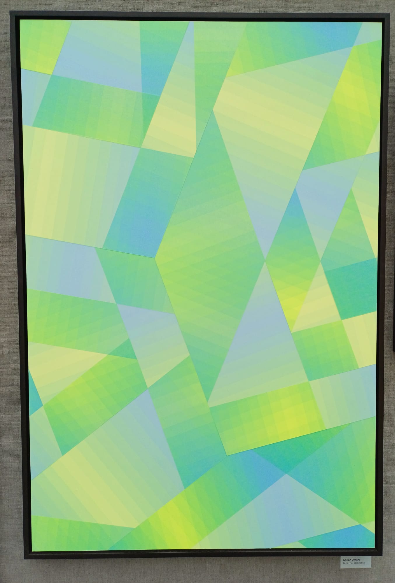 This great artwork was made together with NICOLAS LAWIN. Both are members of the TAPE THAT collective. For the tape art creation titled ‘Ripped Urbanity’, the artists exclusively used adhesive materials, such as foils and paper tapes. The mural thrives on high contrast and the combination of both artists’ styles. Organic and colourful forms are juxtaposed with geometric, urban structures which create depth and a dynamic impression in the space through different levels. – FKKB
