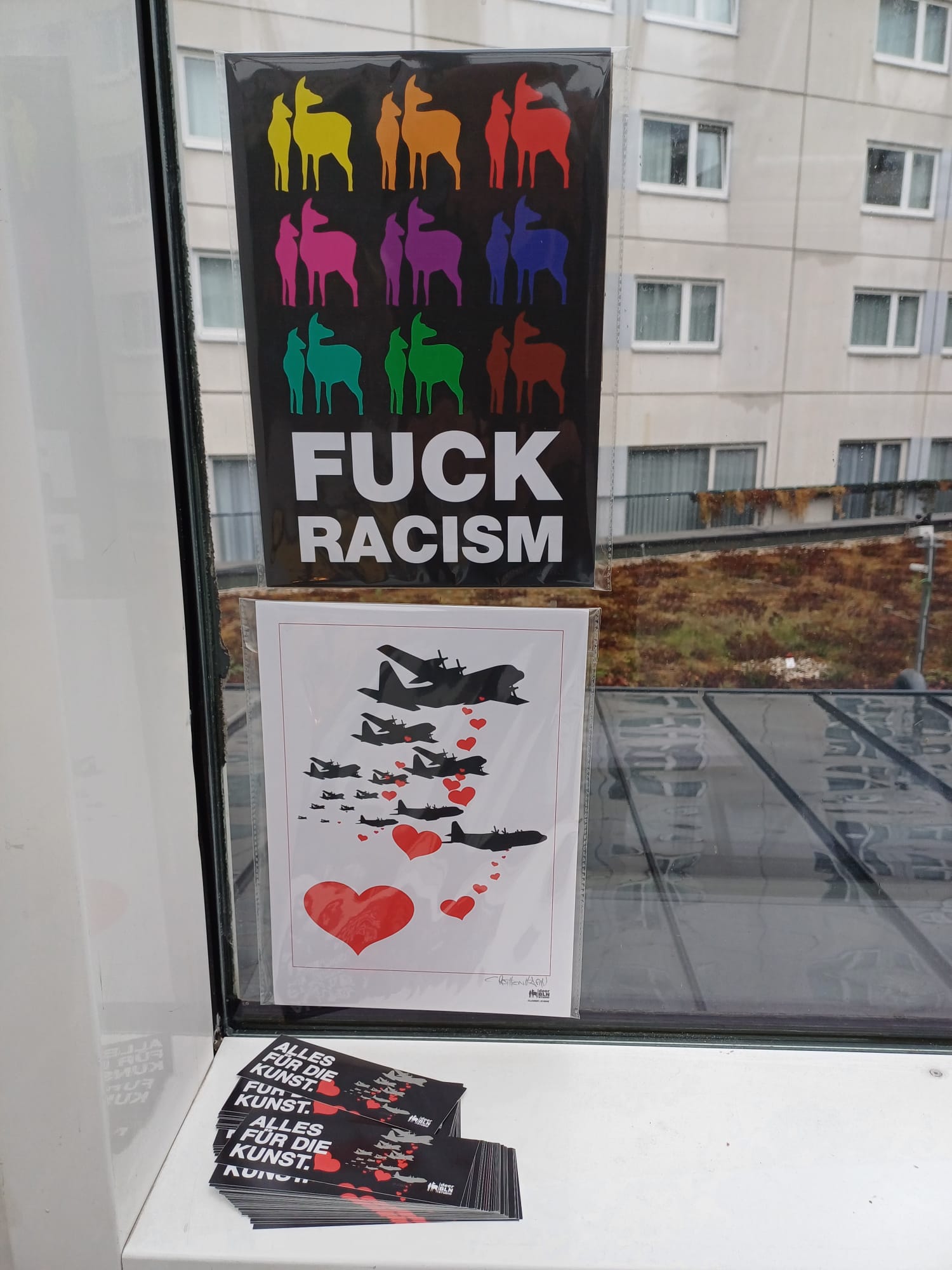 On December 7th 2023, the fantastic exhibition „Xmas Chaos Group Show“ opened and great framed canvas or print artworks were presented on the walls. On the photo below, the works in the first row from left to right are made by STEHPAN MEISSNER, RENE MEYER, DEER BERLIN, PISA 73 and again RENE MEYER. The works in the second row are from STEHPAN MEISSNER, THE OLIFANTS, YAT, SOMARI and PHILIP WALLISFURTH.