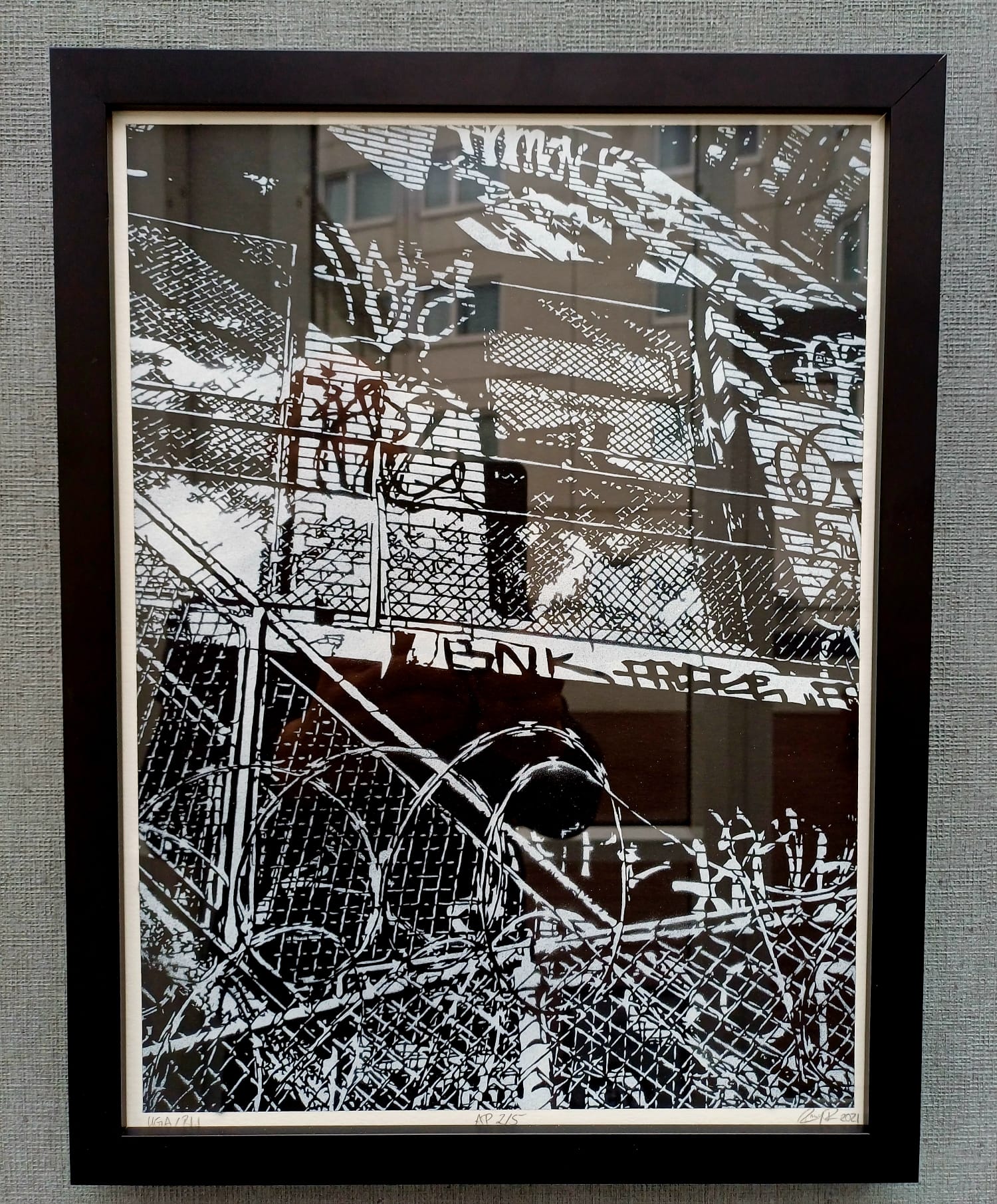RENE MEYER aka RMYR is a renowned visual artist based in Leipzig, Germany. He specializes in creating intricate stencils of industrial architecture and cityscapes. All of his complex, multi-layered stencils are carefully hand-cut, allowing him to experiment with different concepts and combinations. With each work he creates, he aims to inspire and intrigue the audience, inviting them to explore the beauty and detail of stencil art. – FKKB