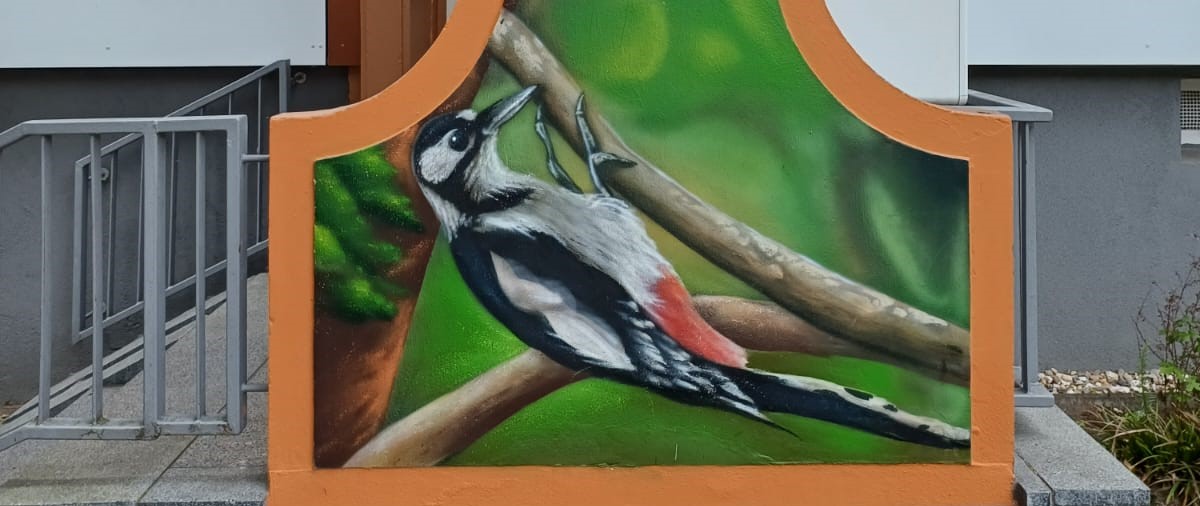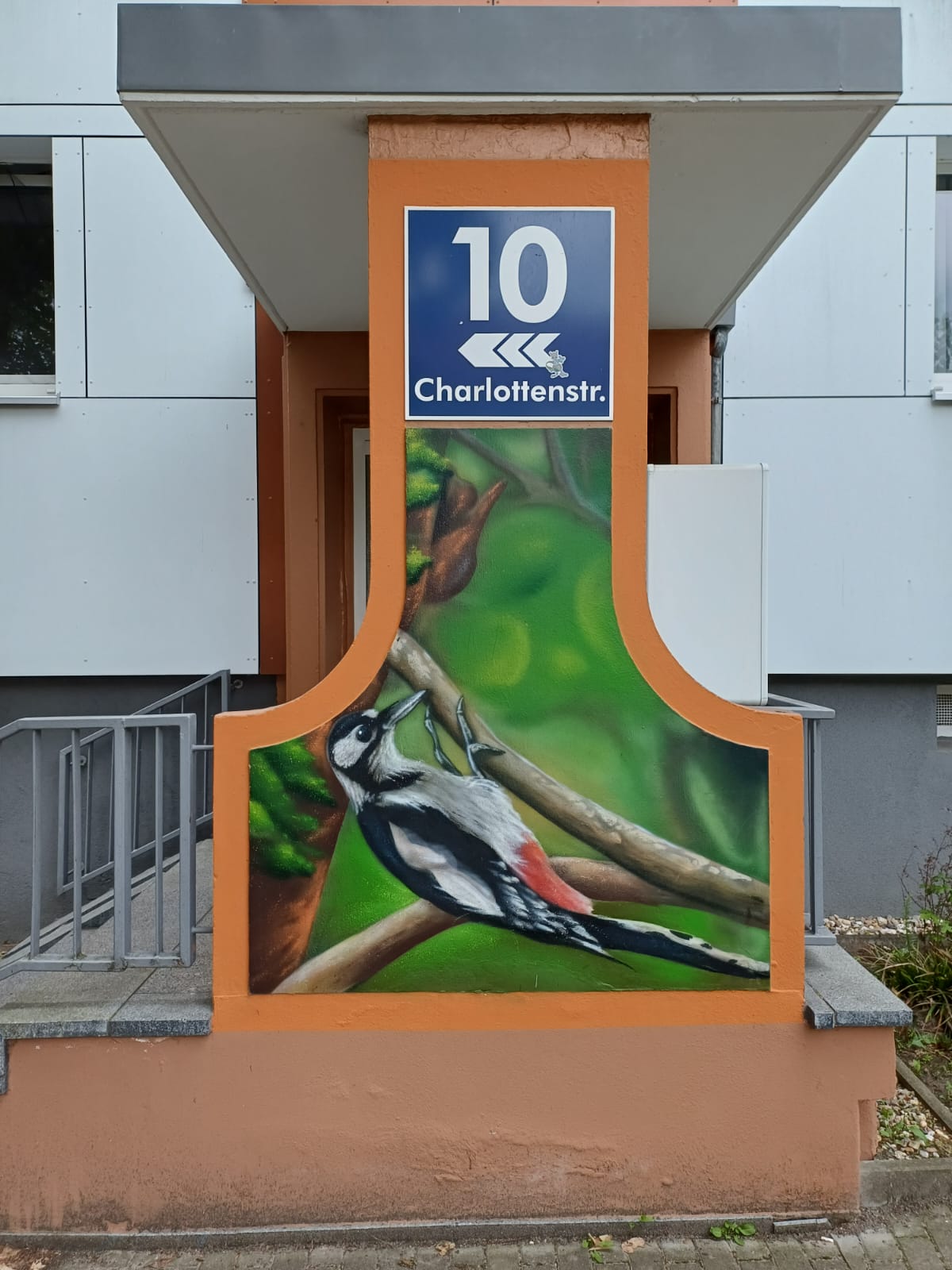 This artwork is part of a series of animals created by DAVID GIERSCH with his art agency TRUE COLOR ARTS on the houses on Charlottenstrasse from numbers 2 to 20. Check out as well the Squirrel at number 2, the Hedgehog at number 4, the Swan at number 6, the Badger at numer 8, the Woodpecker at numer 10, the Deer at numer 12, the Owl at number 14, the Rabbit at numer 16, the Eagle at number 18 and the Fox at number 20.