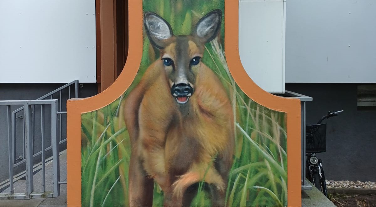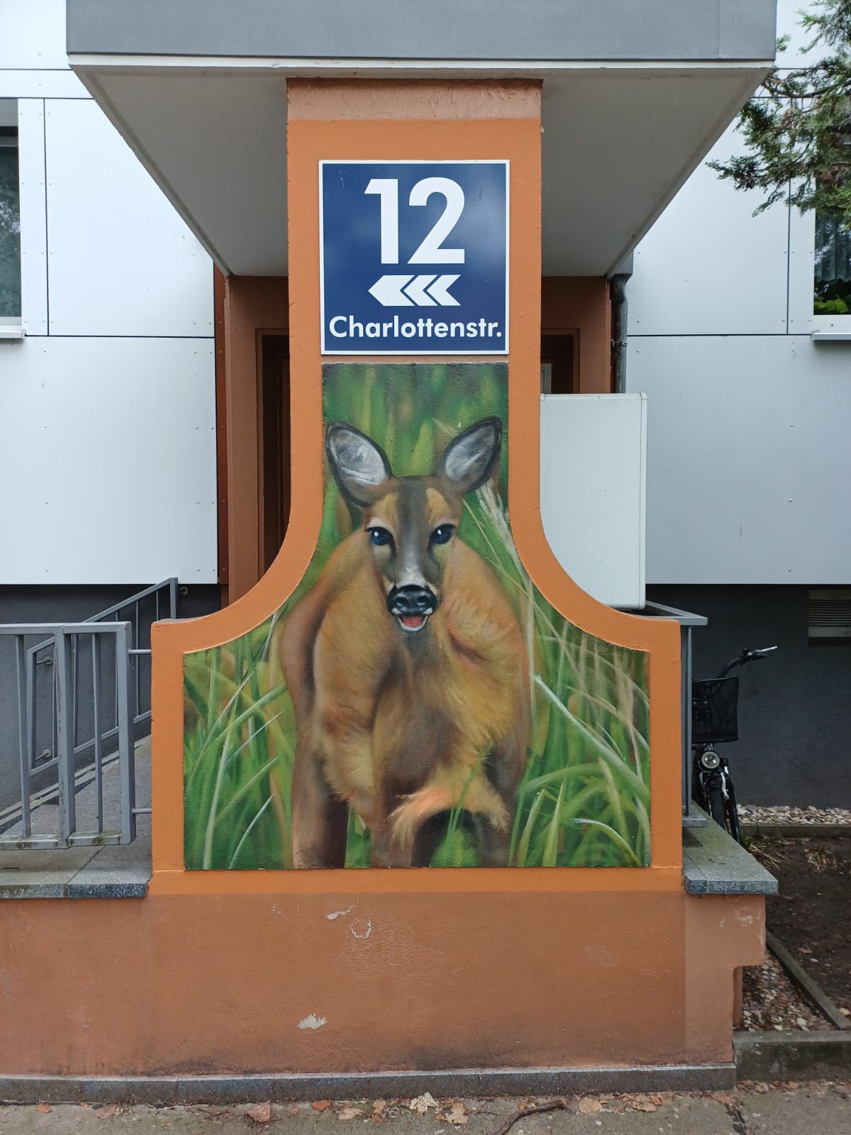 This artwork is part of a series of animals created by DAVID GIERSCH with his art agency TRUE COLOR ARTS on the houses on Charlottenstrasse from numbers 2 to 20. Check out as well the Squirrel at number 2, the Hedgehog at number 4, the Swan at number 6, the Badger at numer 8, the Woodpecker at numer 10, the Owl at number 14, the Rabbit at numer 16, the Eagle at number 18 and the Fox at number 20.