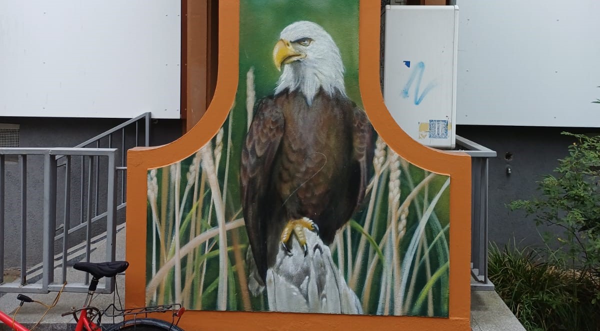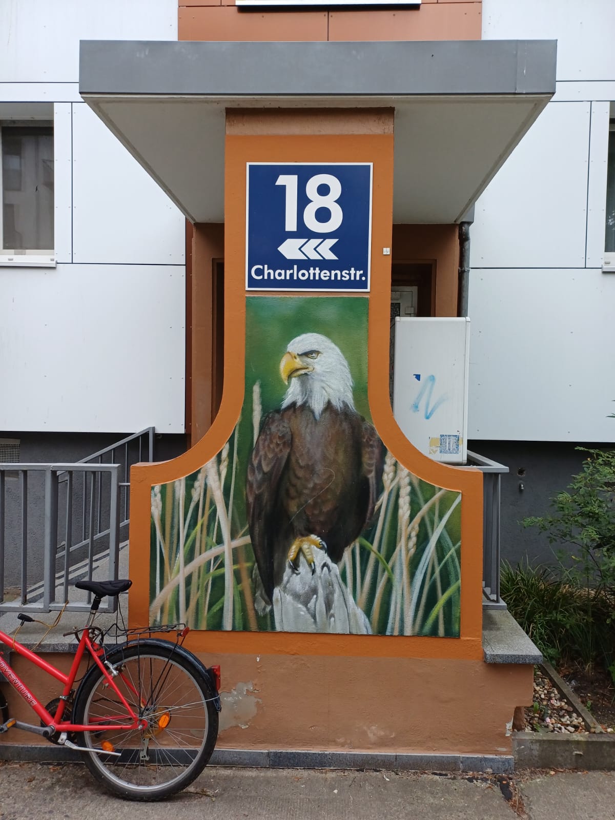 This artwork is part of a series of animals created by DAVID GIERSCH with his art agency TRUE COLOR ARTS on the houses on Charlottenstrasse from numbers 2 to 20. Check out as well the Squirrel at number 2, the Hedgehog at number 4, the Swan at number 6, the Badger at numer 8, the Woodpecker at numer 10, the Deer at numer 12, the Owl at number 14, the Rabbit at numer 16 and the Fox at number 20.