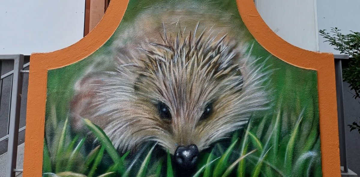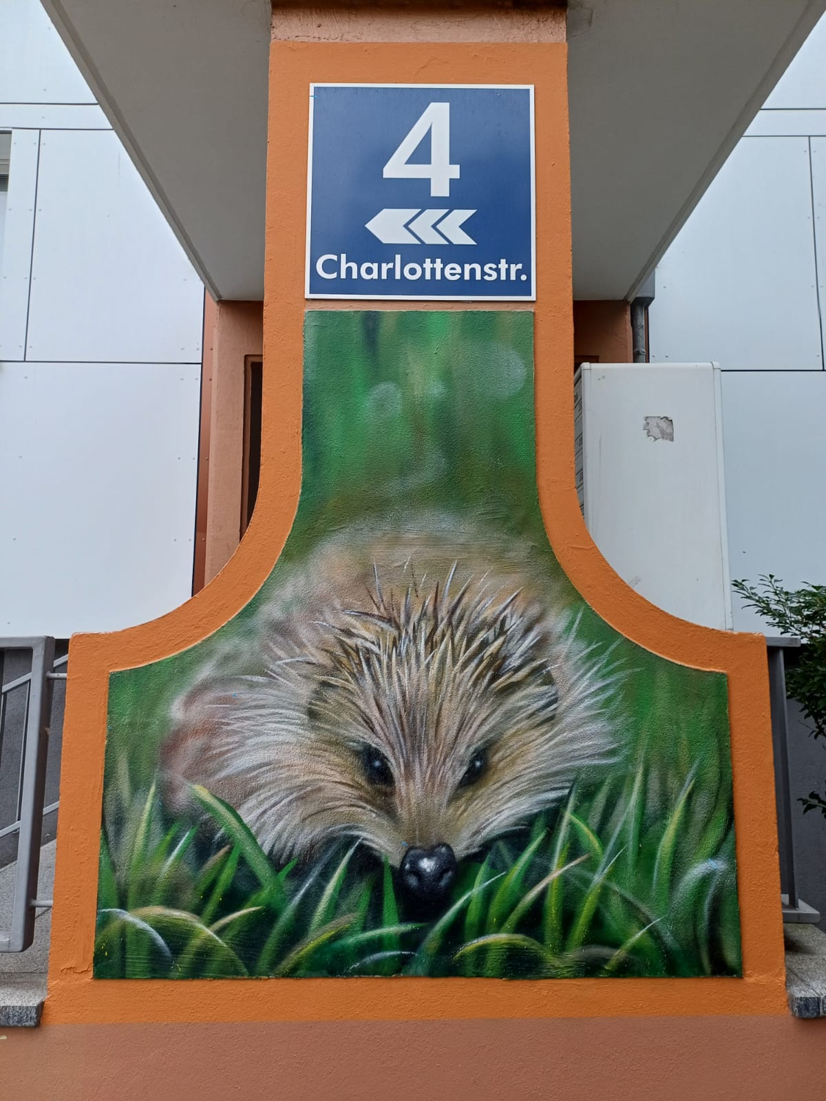 This artwork is part of a series of animals created by DAVID GIERSCH with his art agency TRUE COLOR ARTS on the houses on Charlottenstrasse from numbers 2 to 20. Check out as well the Squirrel at number 2, the Swan at number 6, the Badger at numer 8, the Woodpecker at numer 10, the Deer at numer 12, the Owl at number 14, the Rabbit at numer 16, the Eagle at number 18 and the Fox at number 20.