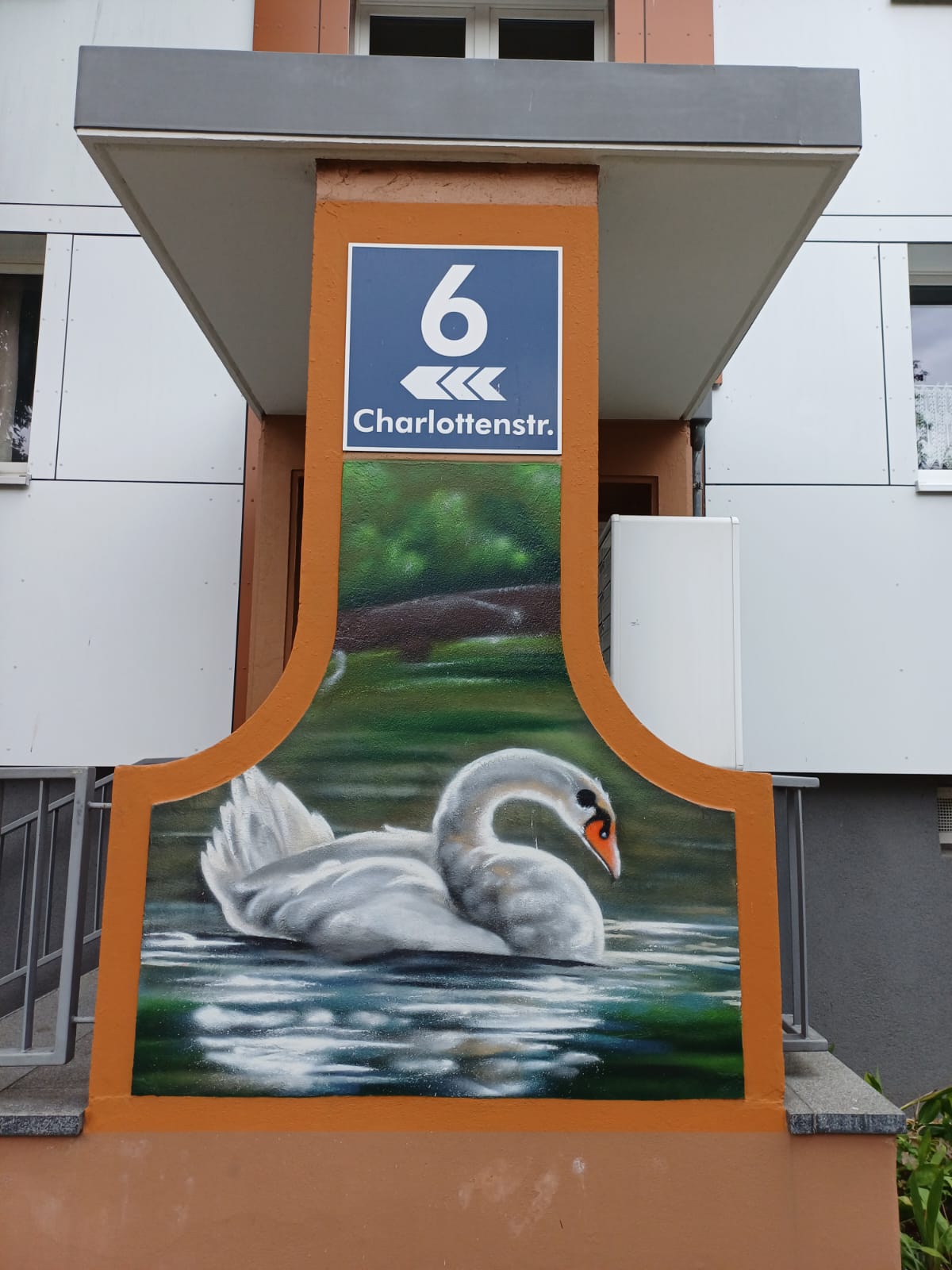 This artwork is part of a series of animals created by DAVID GIERSCH with his art agency TRUE COLOR ARTS on the houses on Charlottenstrasse from numbers 2 to 20. Check out as well the Squirrel at number 2, the Hedgehog at number 4, the Badger at numer 8, the Woodpecker at numer 10, the Deer at numer 12, the Owl at number 14, the Rabbit at numer 16, the Eagle at number 18 and the Fox at number 20.