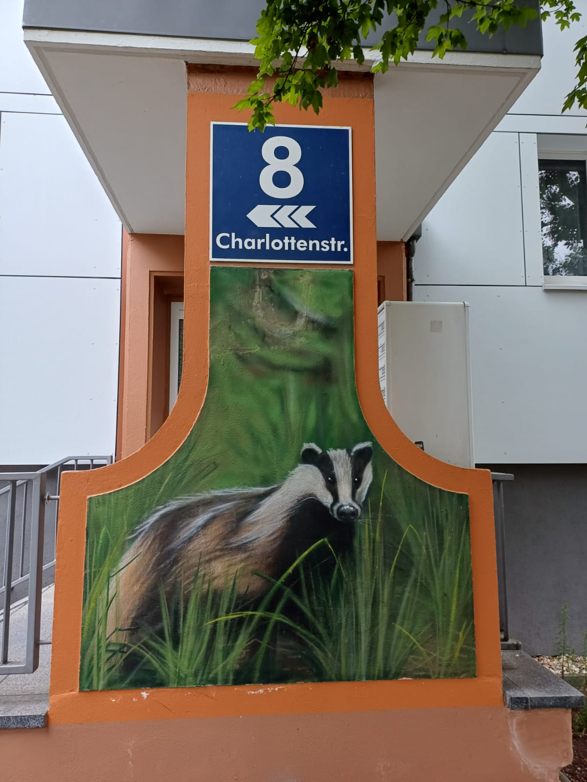 This artwork is part of a series of animals created by DAVID GIERSCH with his art agency TRUE COLOR ARTS on the houses on Charlottenstrasse from numbers 2 to 20. Check out as well the Squirrel at number 2, the Hedgehog at number 4, the Swan at number 6, the Woodpecker at numer 10, the Deer at numer 12, the Owl at number 14, the Rabbit at numer 16, the Eagle at number 18 and the Fox at number 20.