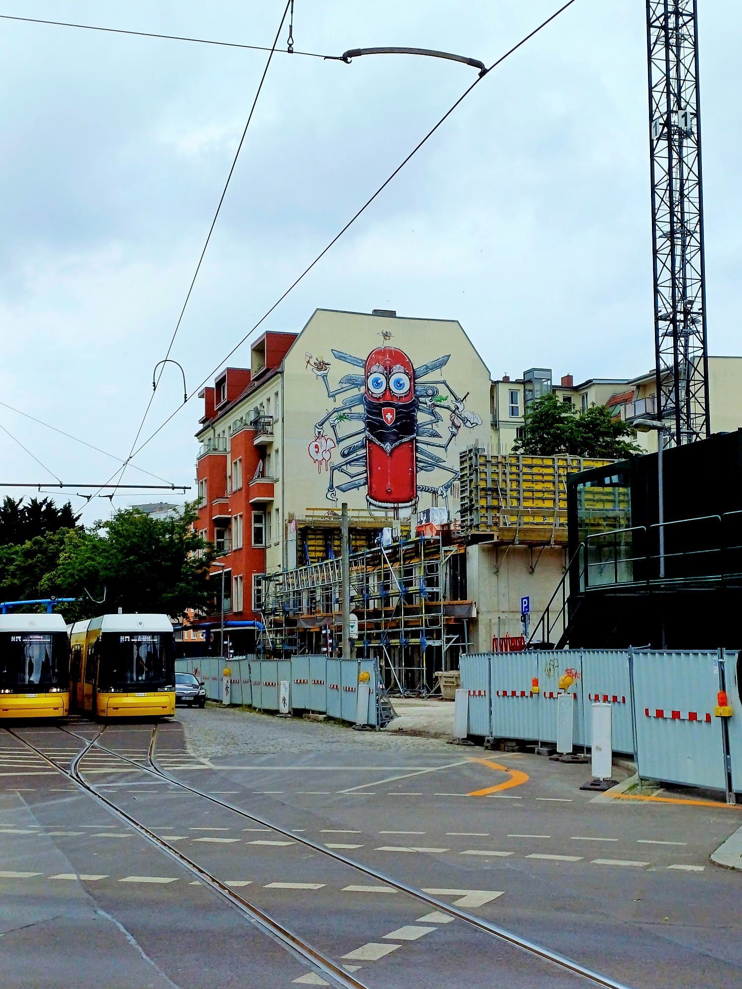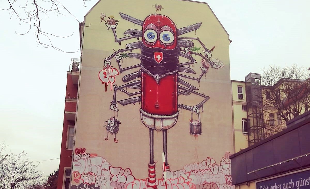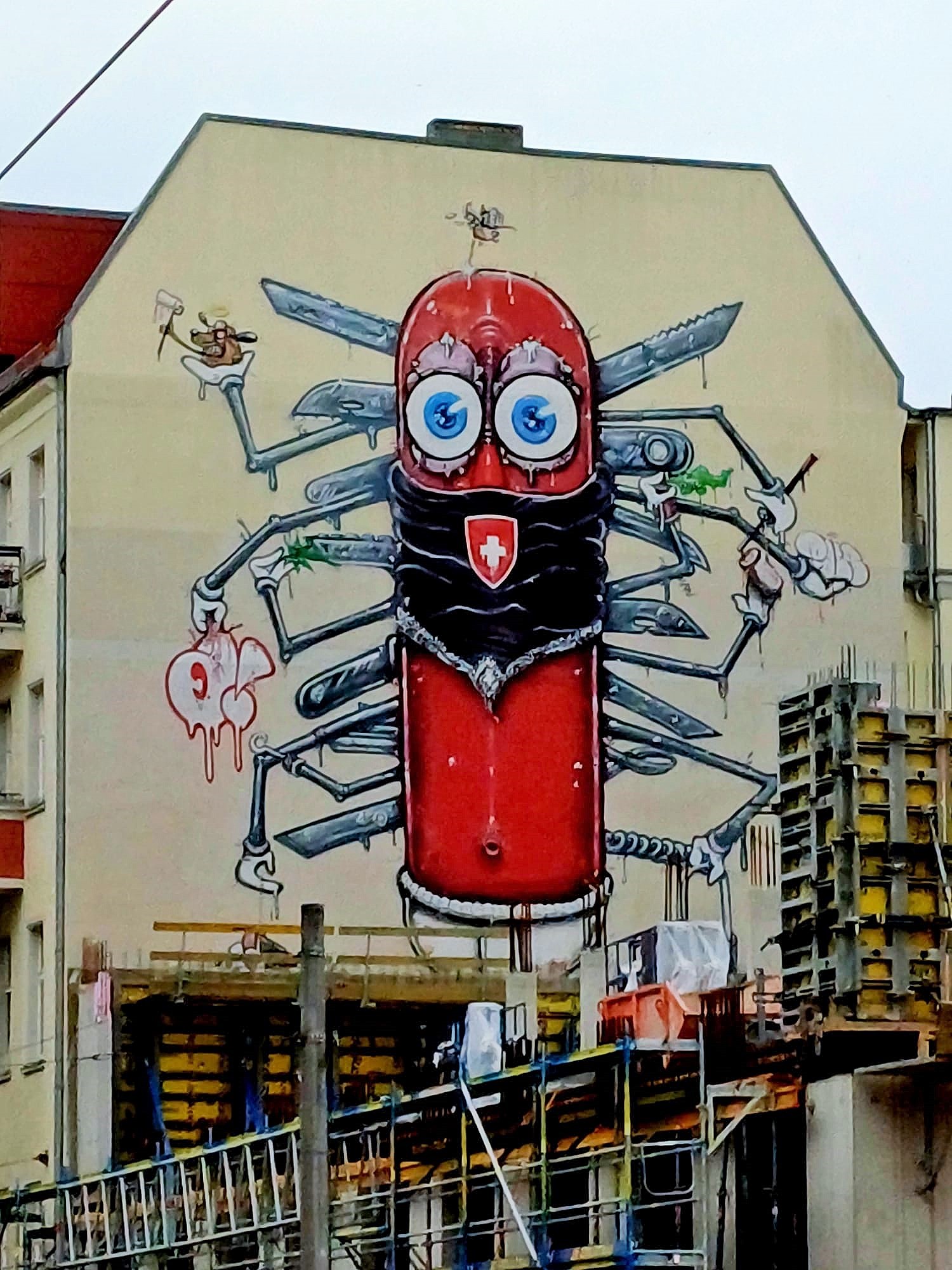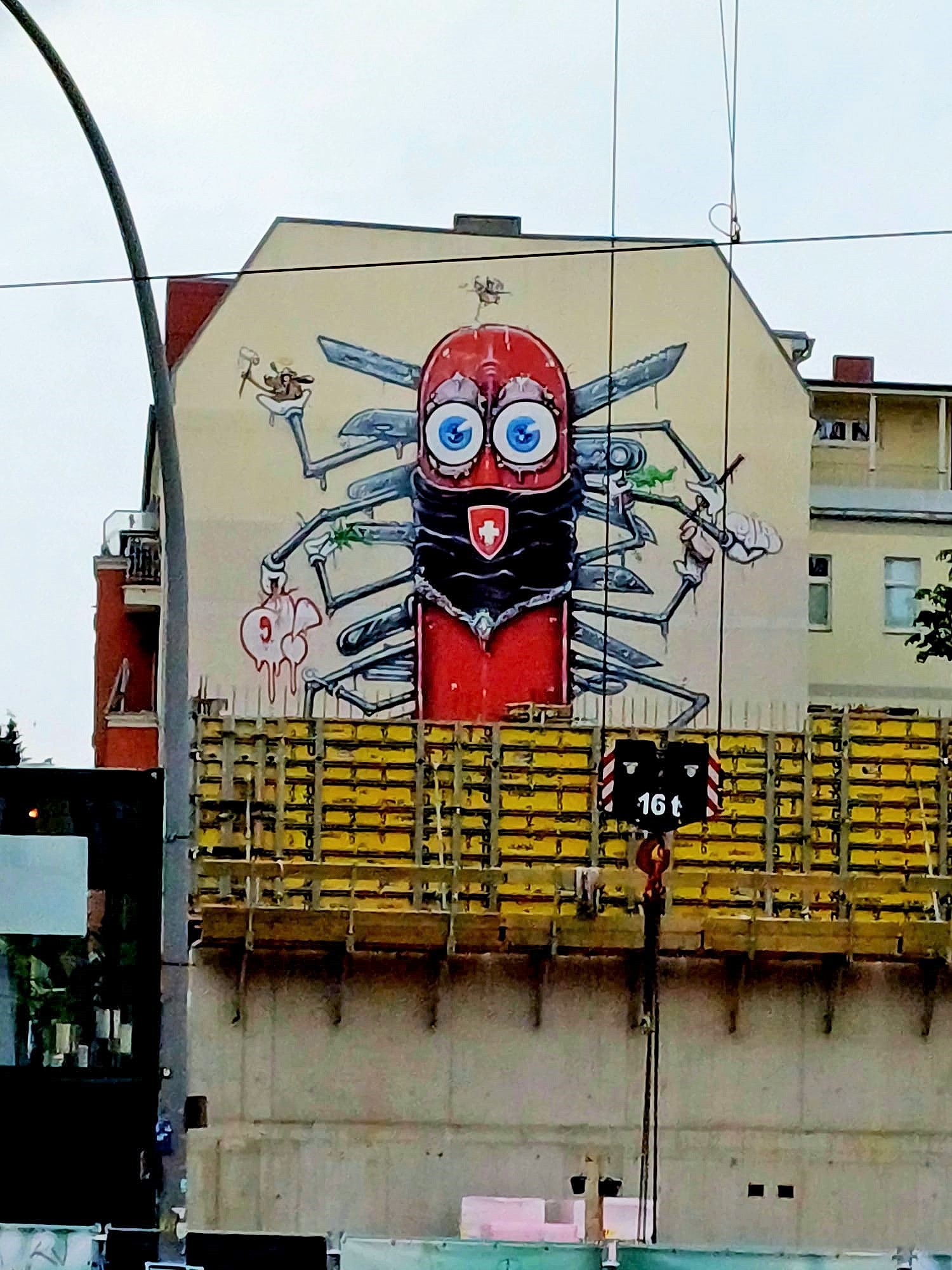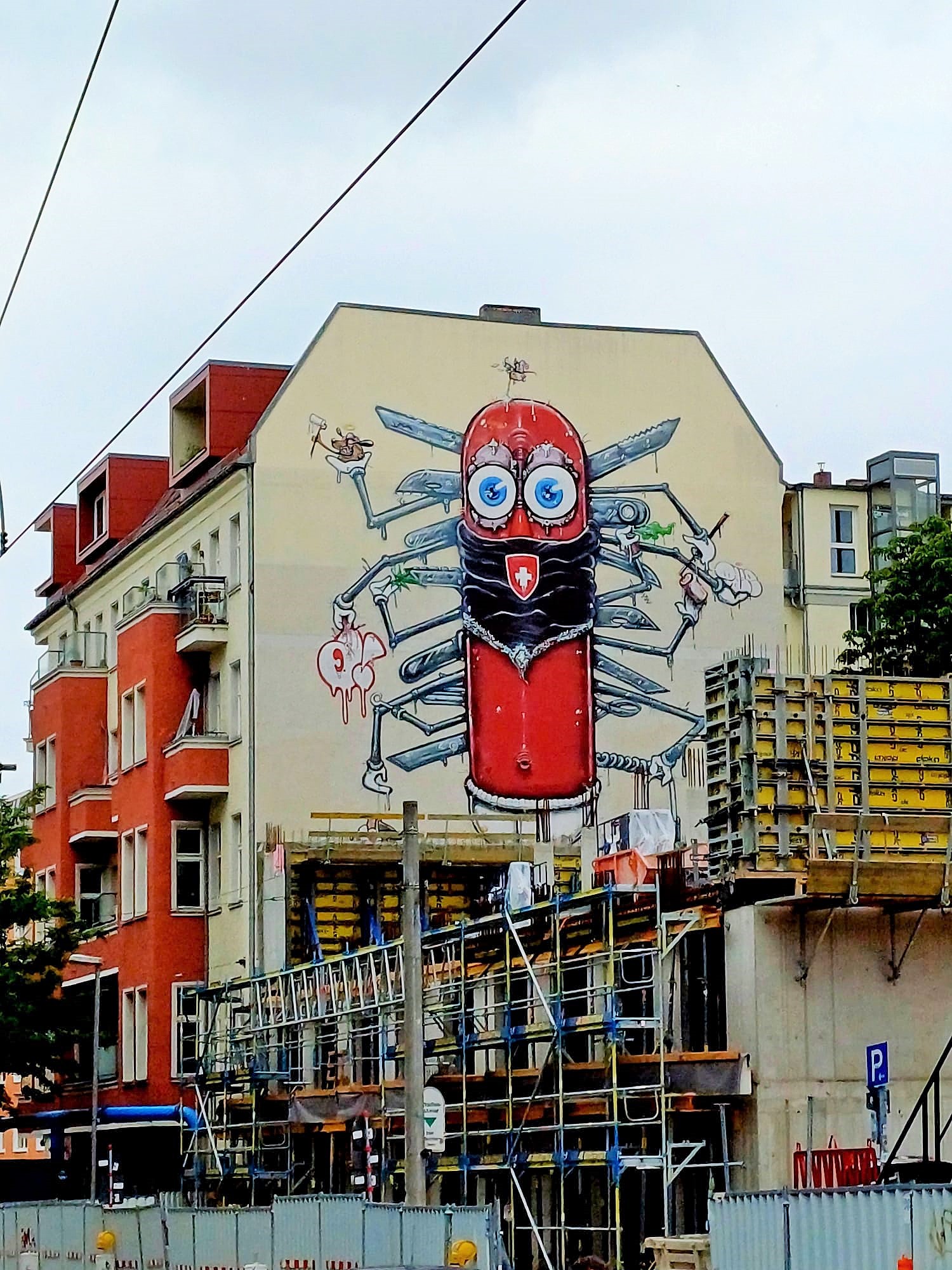 Finally in the fall of 2025 it happened… a new building was constructed right next to the existing one, and as a result, the magnificent mural by ONE TRUTH and AKTE ONE is no longer visible. But that’s the way things go; the city is changing, some places are being developed, others are falling into disrepair. And urban art, especially graffiti or street art, is inherently short-lived. A colorful impulse that you find unexpectedly and suddenly on otherwise gray facades. Instead of dreary and boring concrete walls that tend to be depressing, such works of art inspire completely different thoughts. The house, the wall, and the work may have been built over, but you can still admire photos of them here on our website and in our Vagabundler Graffitipedia Archive. All the best and rest in peace, beautiful pocket knife mural! … (but to be precise, it actually still exists, it’s just wedged between the buildings)