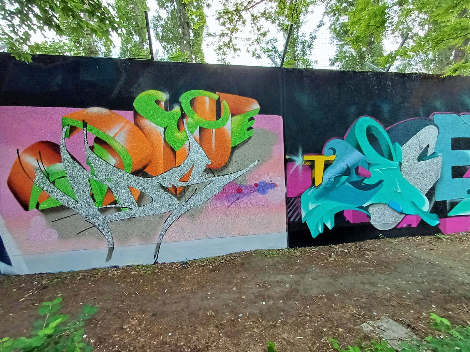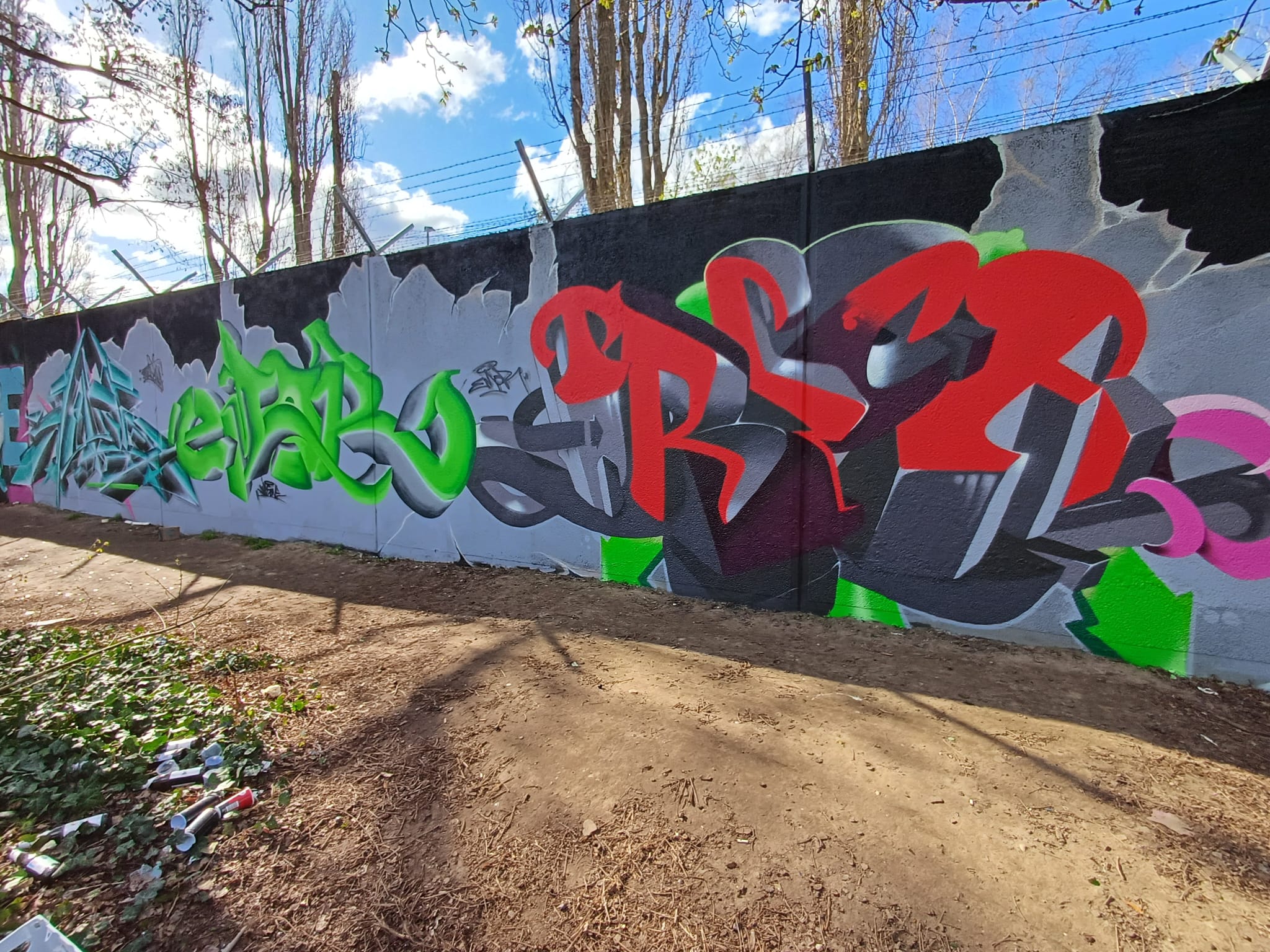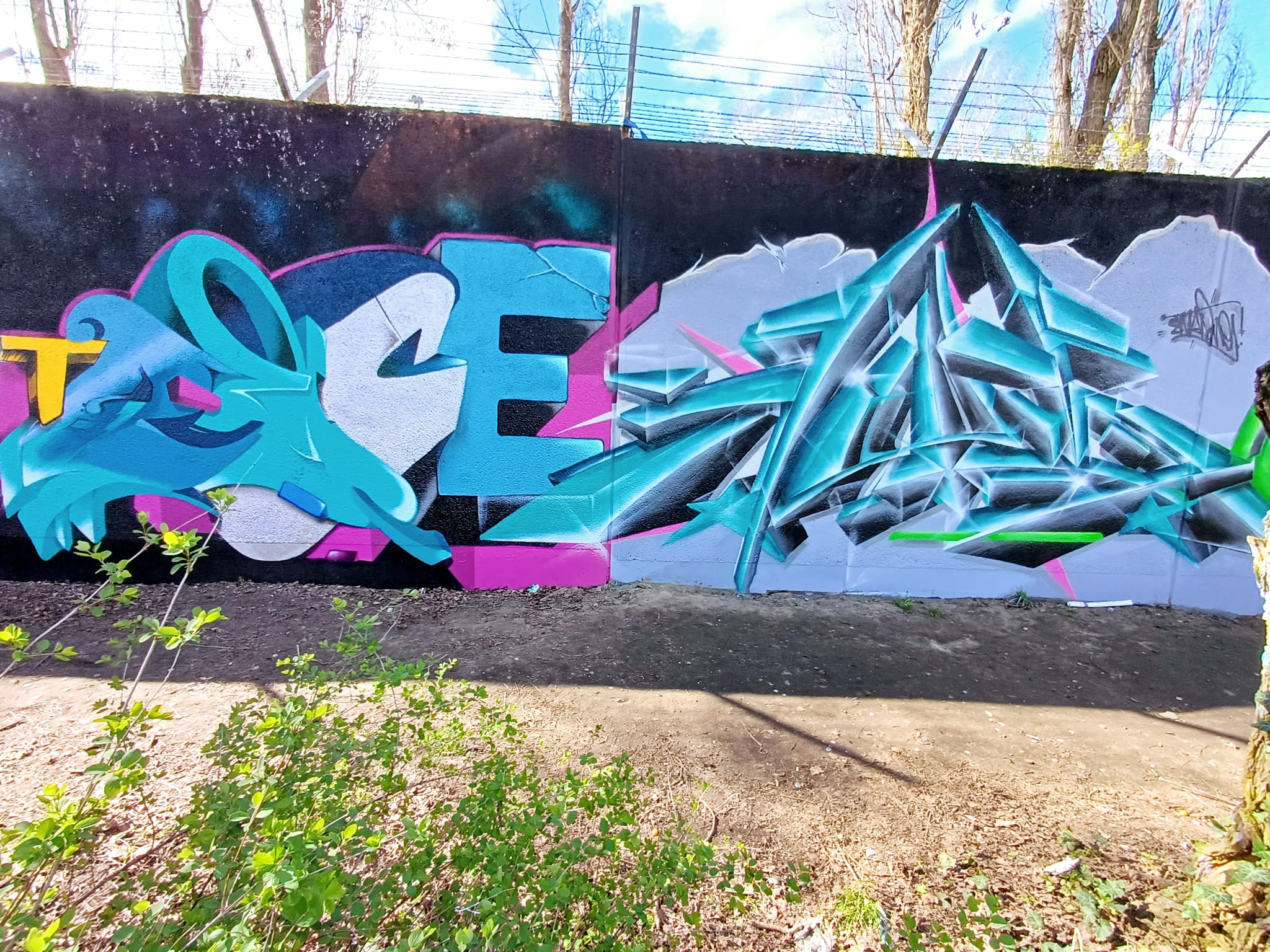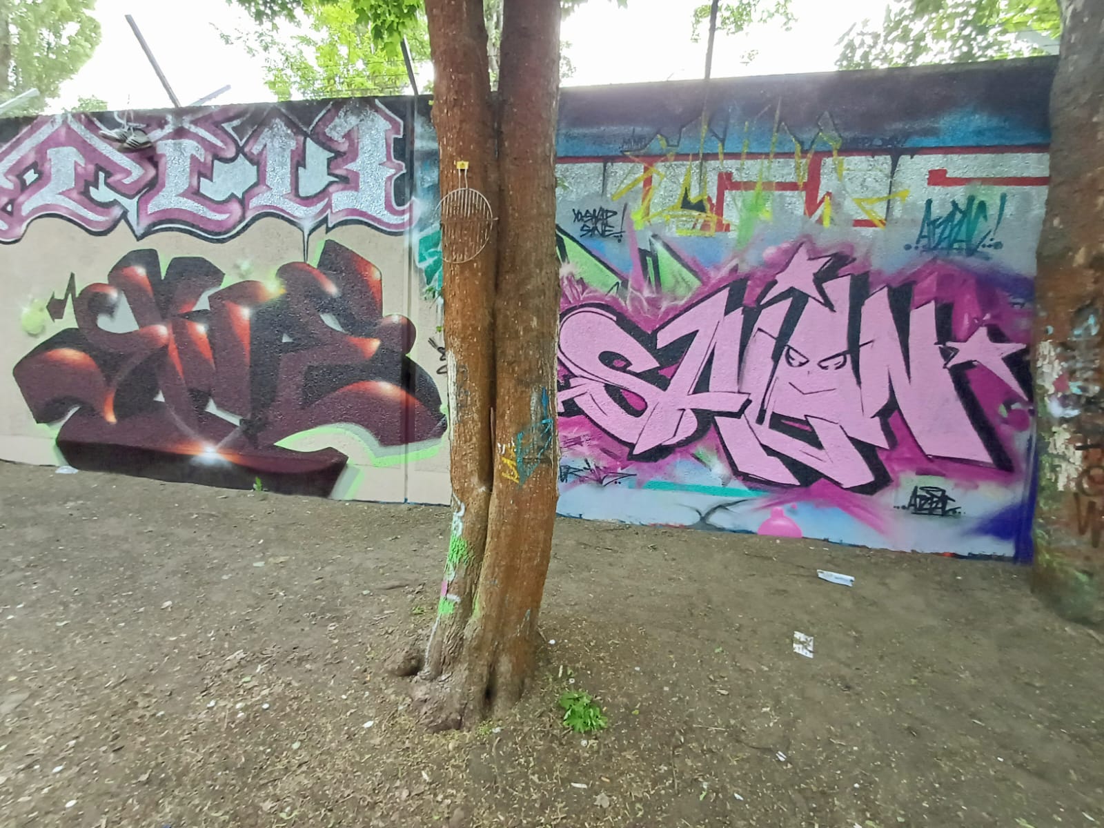 The graffiti on the left is from EMOR and the artwork on the right was made by RAMIREZ ILLICH