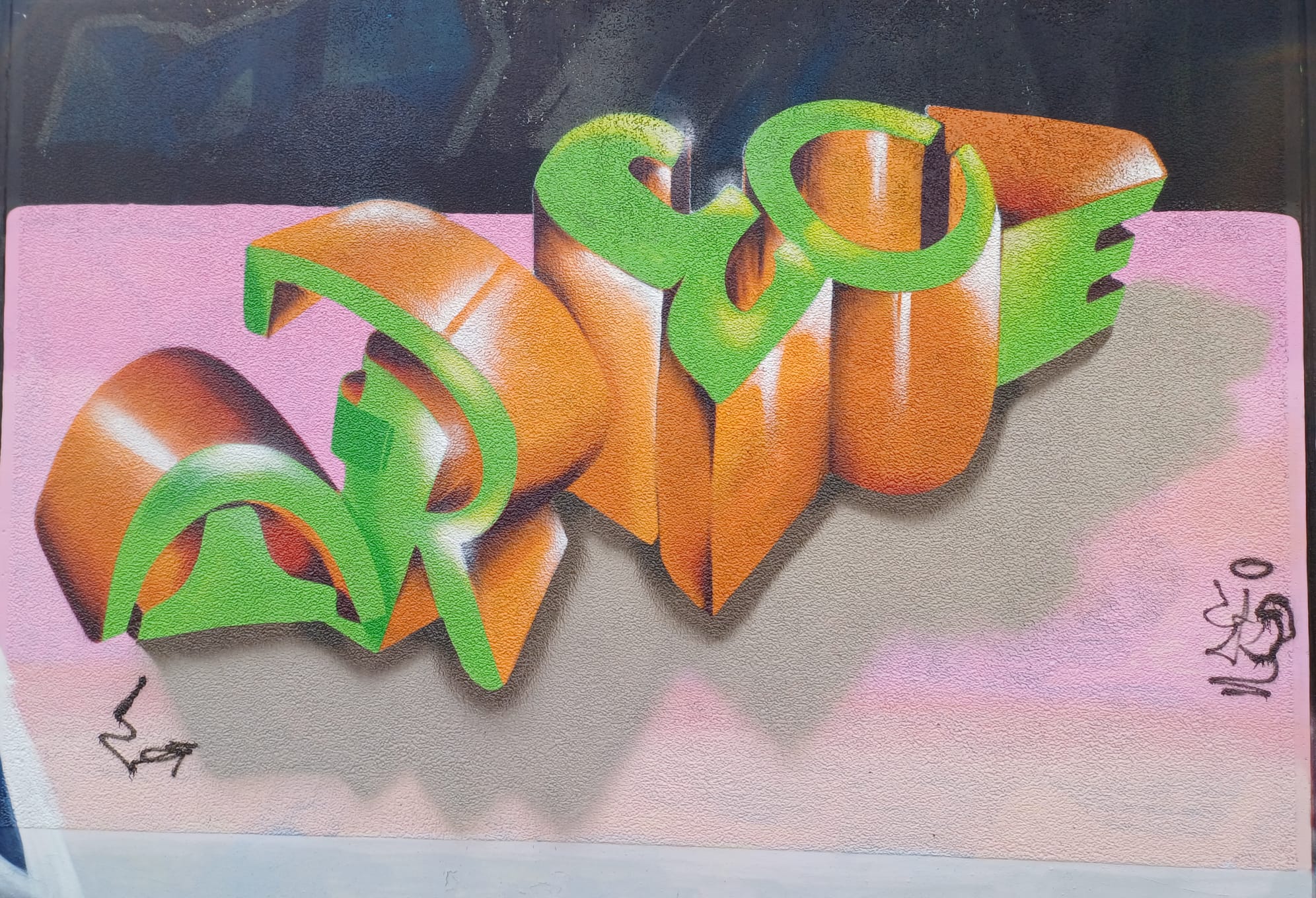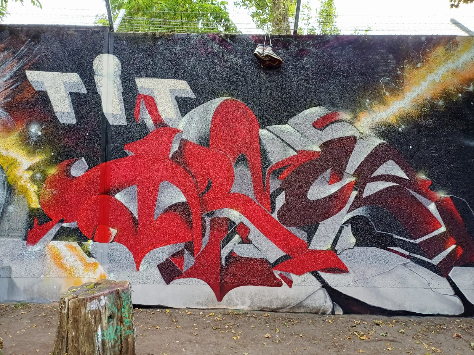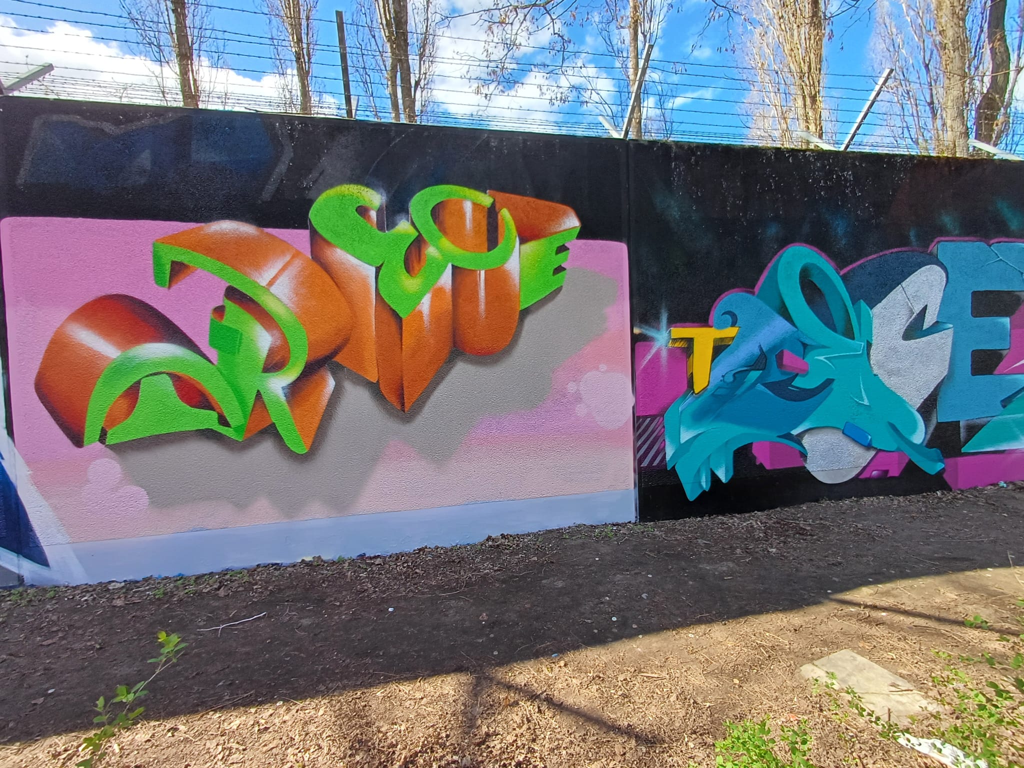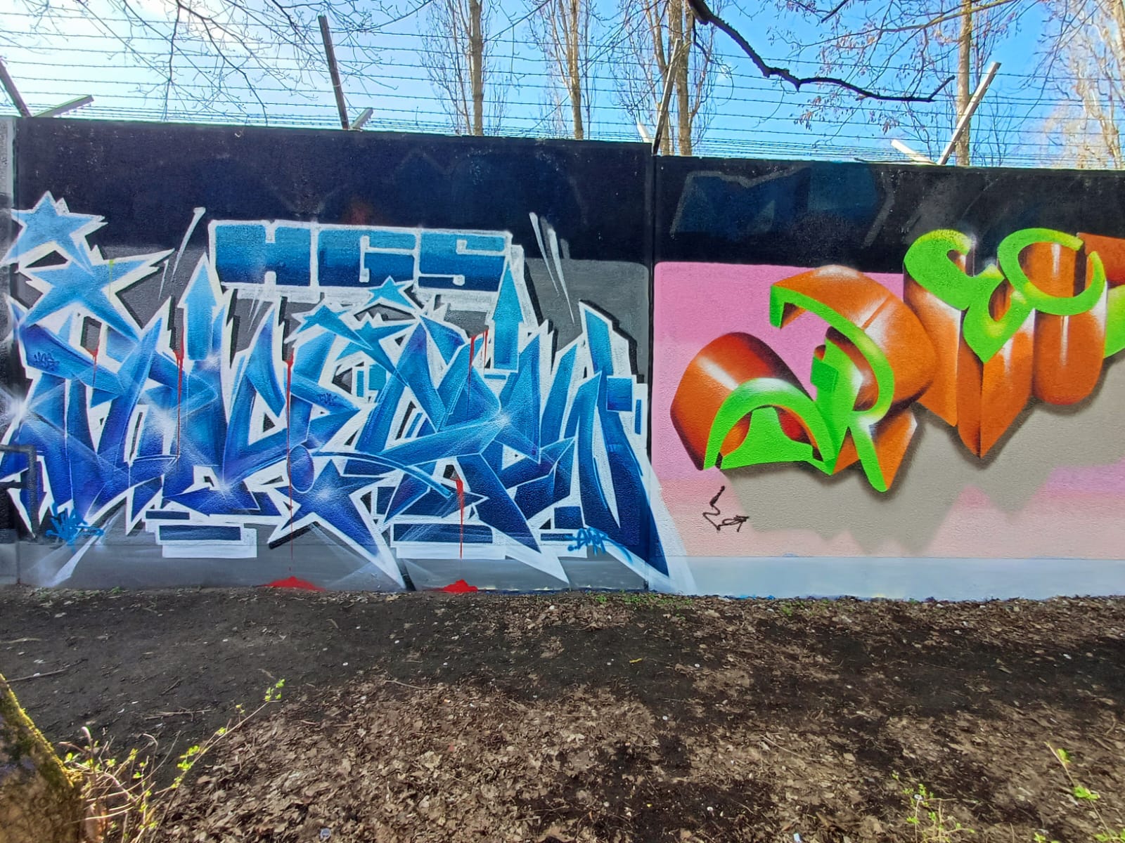 The graffiti on the left is from EMOR and the artwork on the right was made by RAMIREZ ILLICH