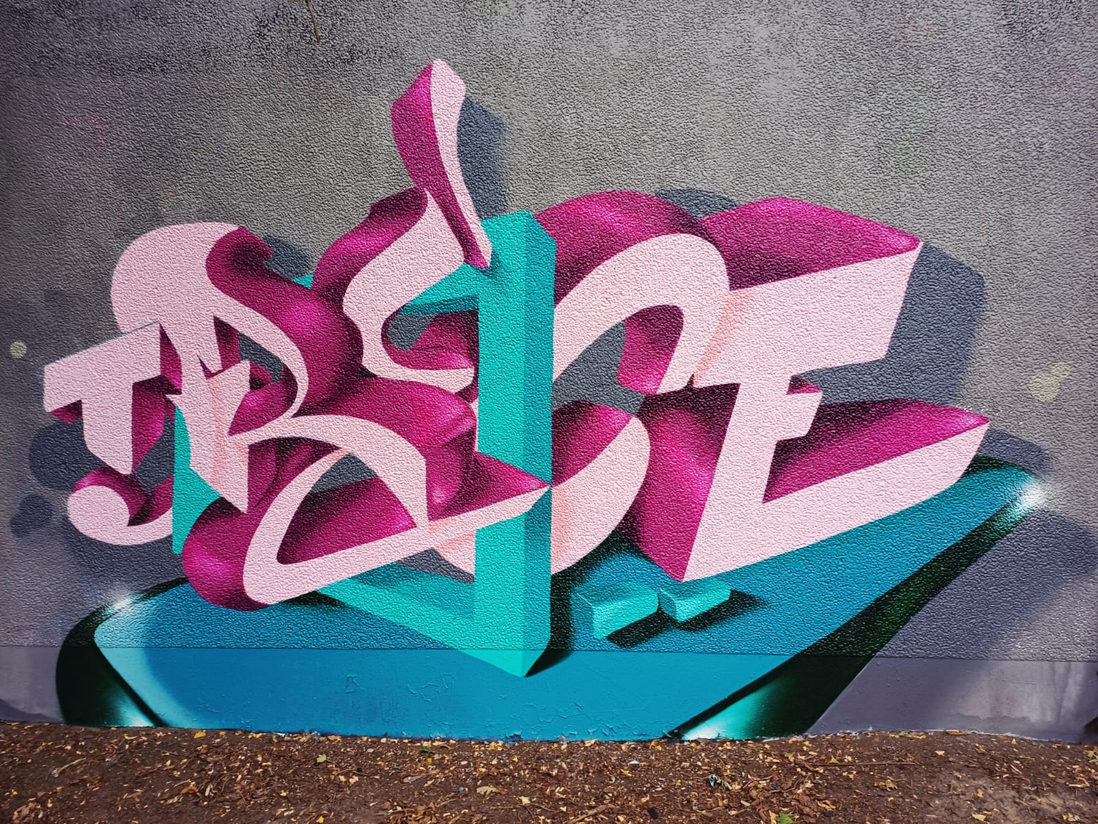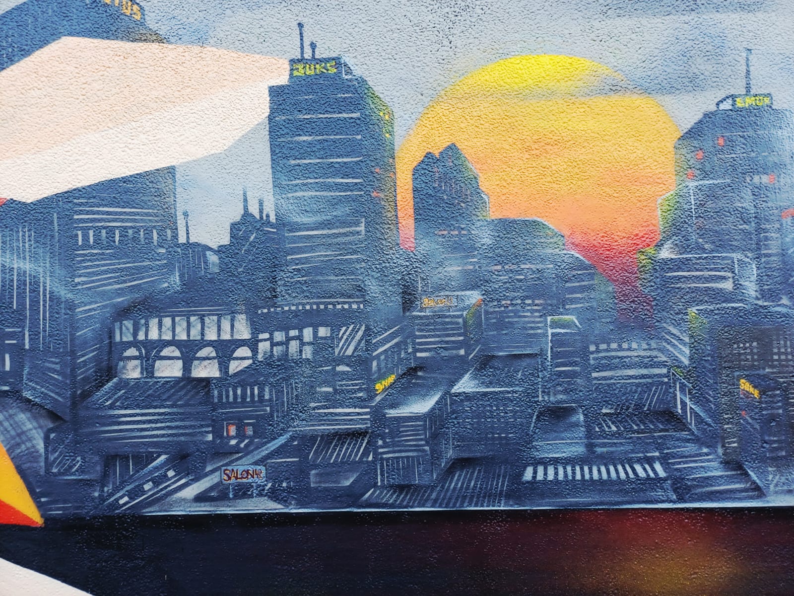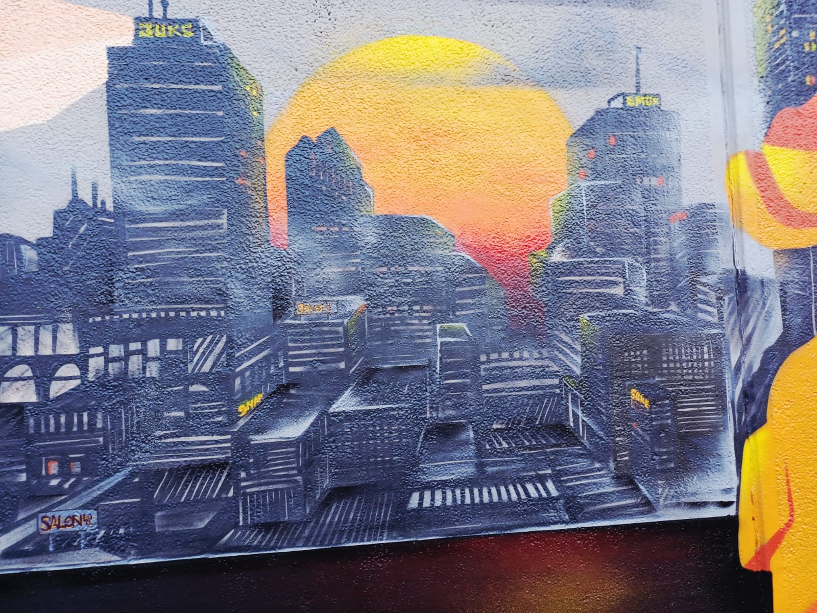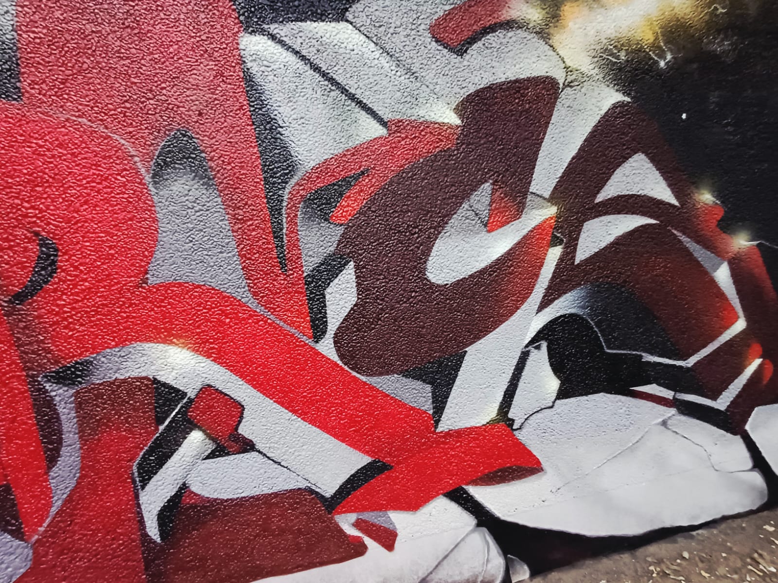 The graffiti on the left is from EMOR and the artwork on the right was made by RAMIREZ ILLICH