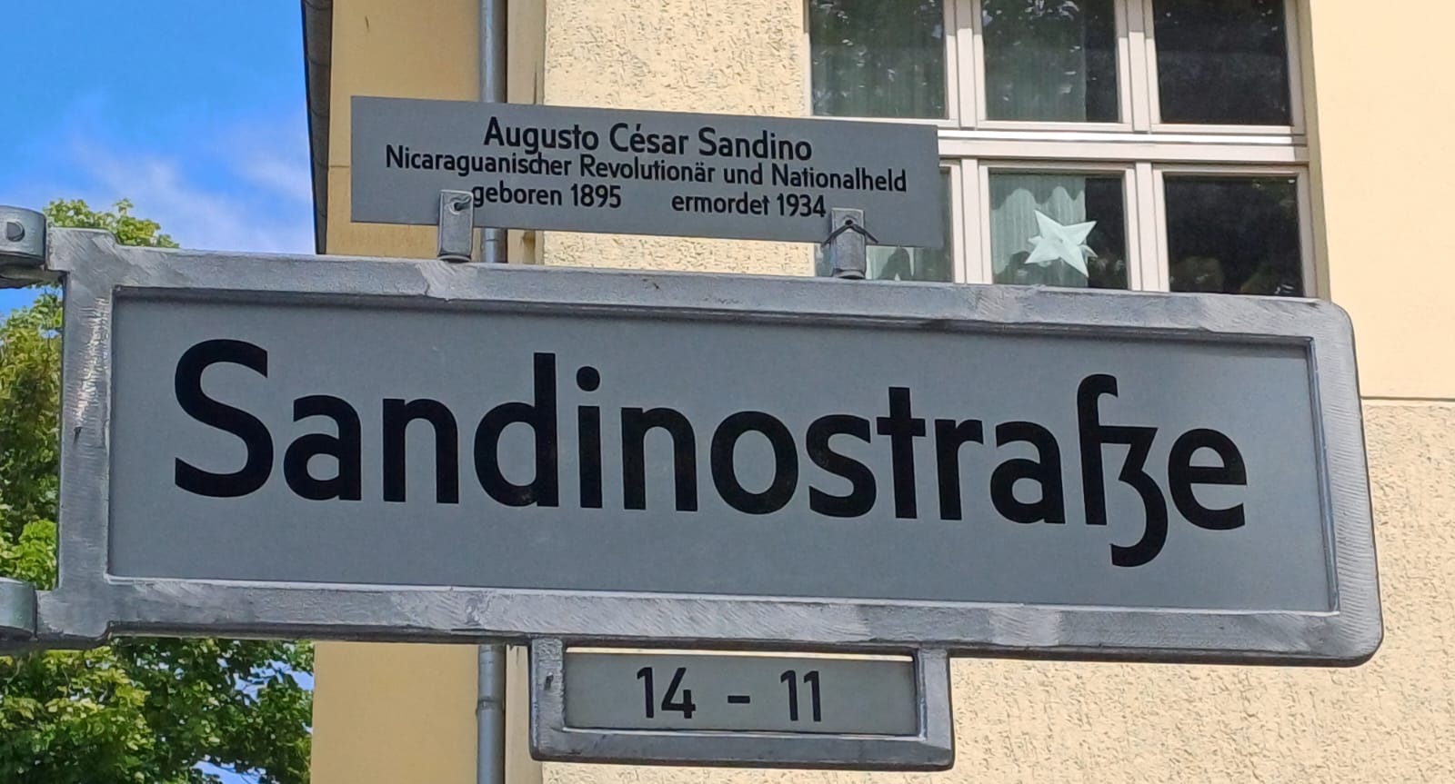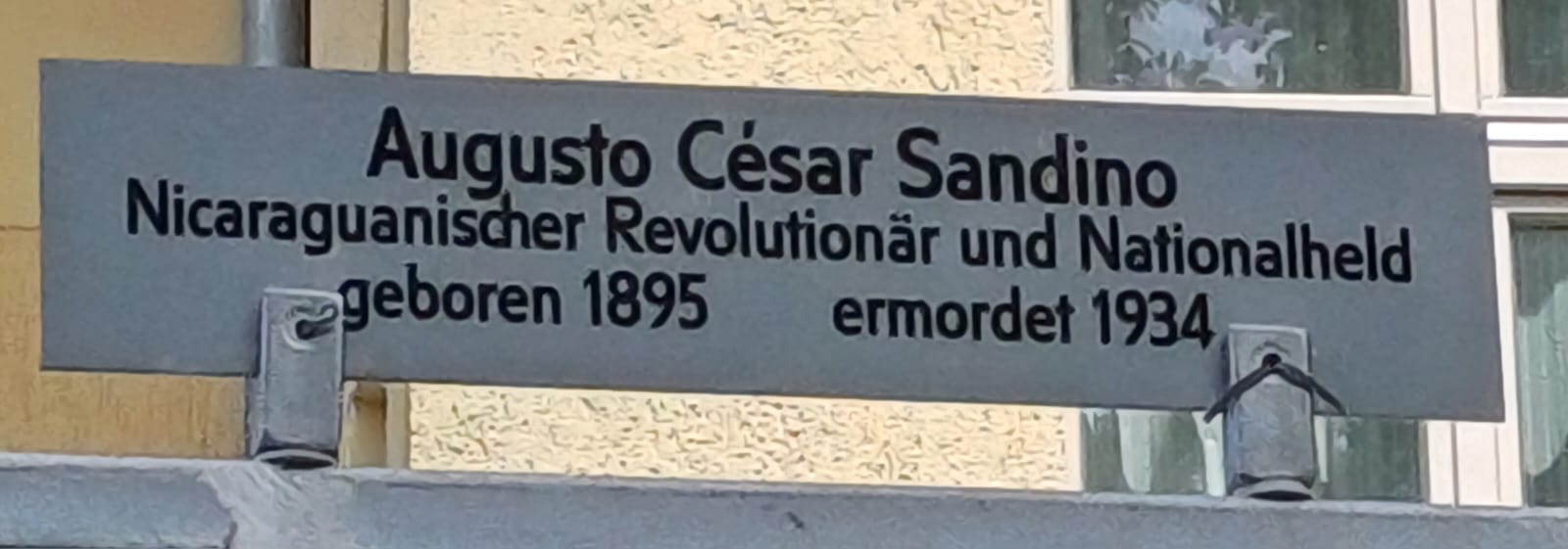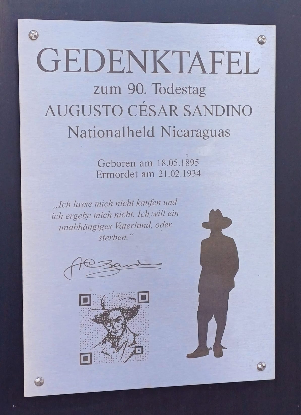 This plaque was erected on the 90th anniversary of the death of the Nicaraguan revolutionary and national hero AUGUSTO CÉSAR SANDINO in 2024. The street and the hostel were named after him in memory of his exceptional commitment. The quote „Ich lasse mich nicht kaufen und ich ergebe mich nicht. Ich will ein unabhängiges Vaterland, oder sterben“ means in English „I will not be bought and I will not surrender. I want an independent fatherland, or die“. He was born on 18th May in 1895 and was killed on 21st February 1934.