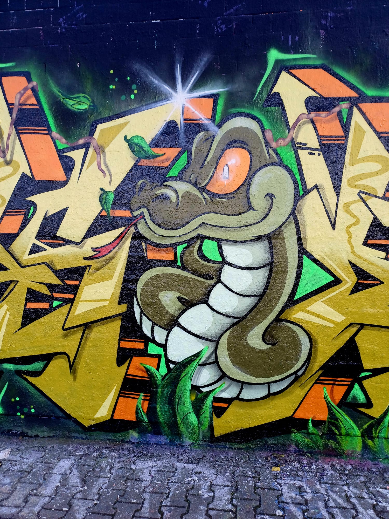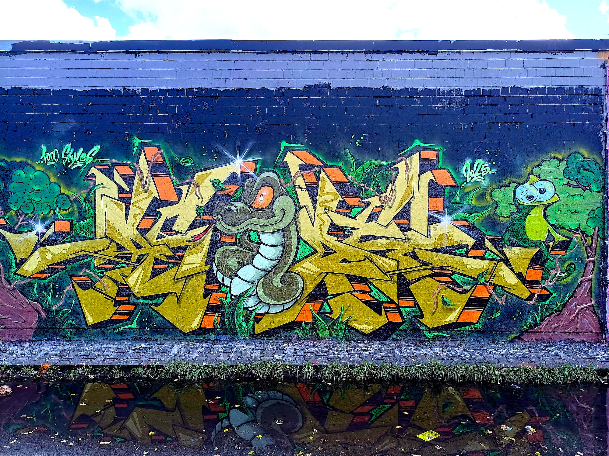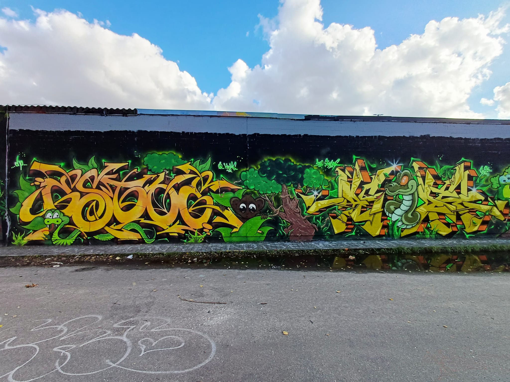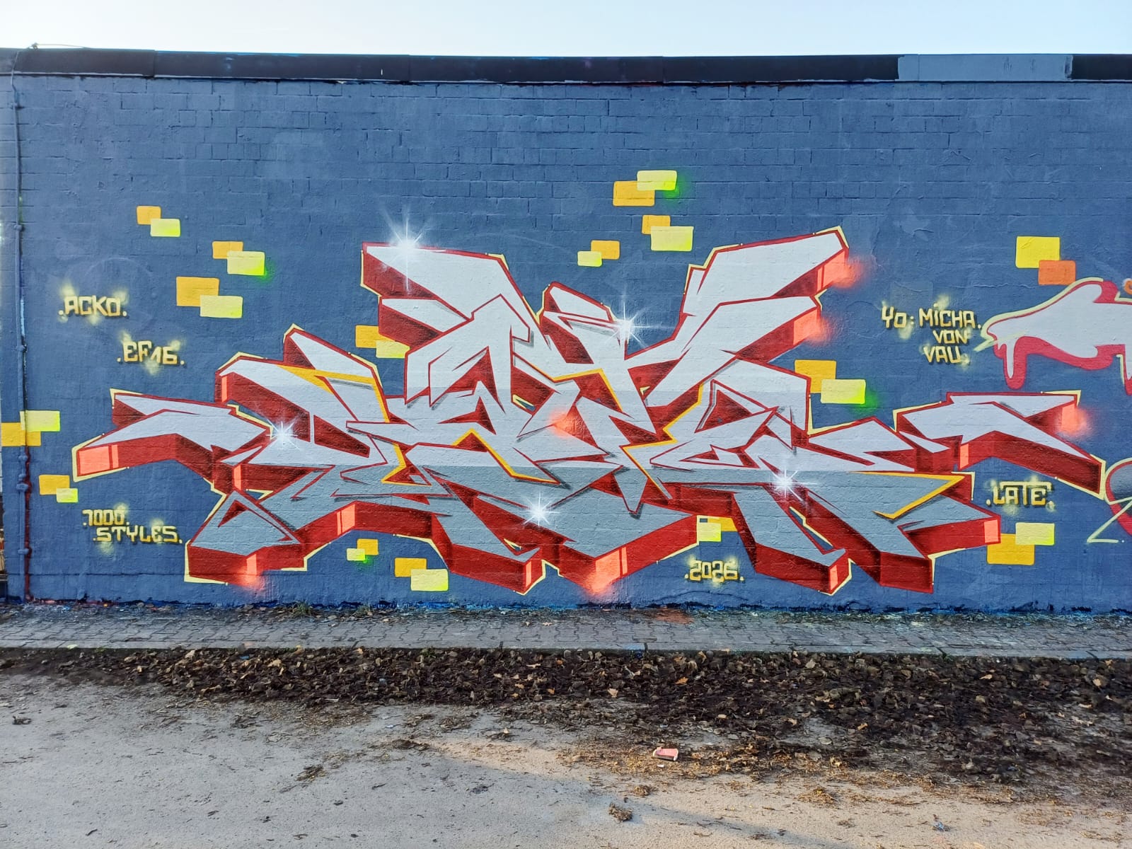 The graffiti on the left is from KAOK, the following graffiti and the little Alien were made by LEFT, the graffiti next to it is from HOOMS, the serpient was made by AUTARK and the artwork on the right is from ACKO aka LATE aka EF16 aka 1000 STYLES.