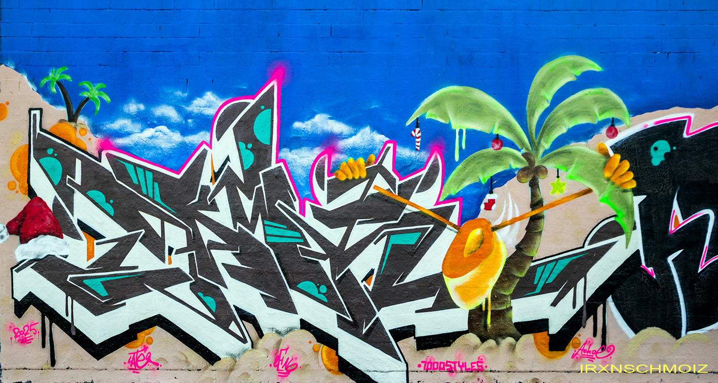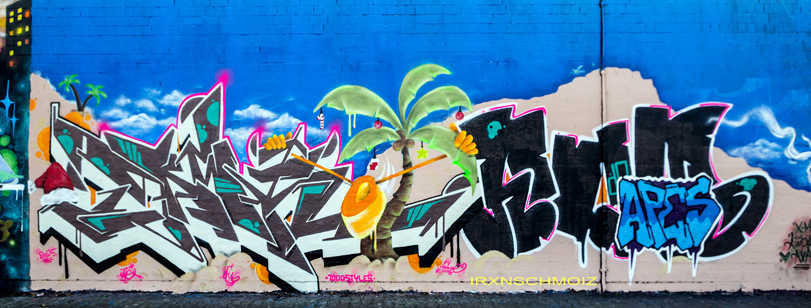 The character on the far left was made by AMPER and the graffiti on the left is from HOOMS