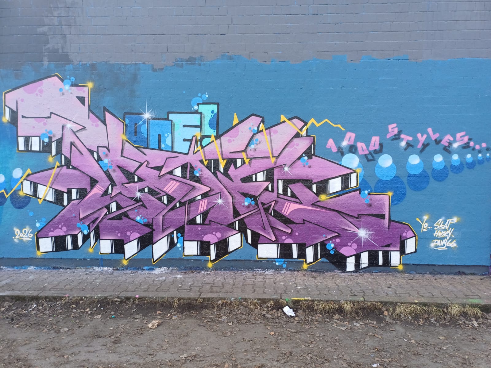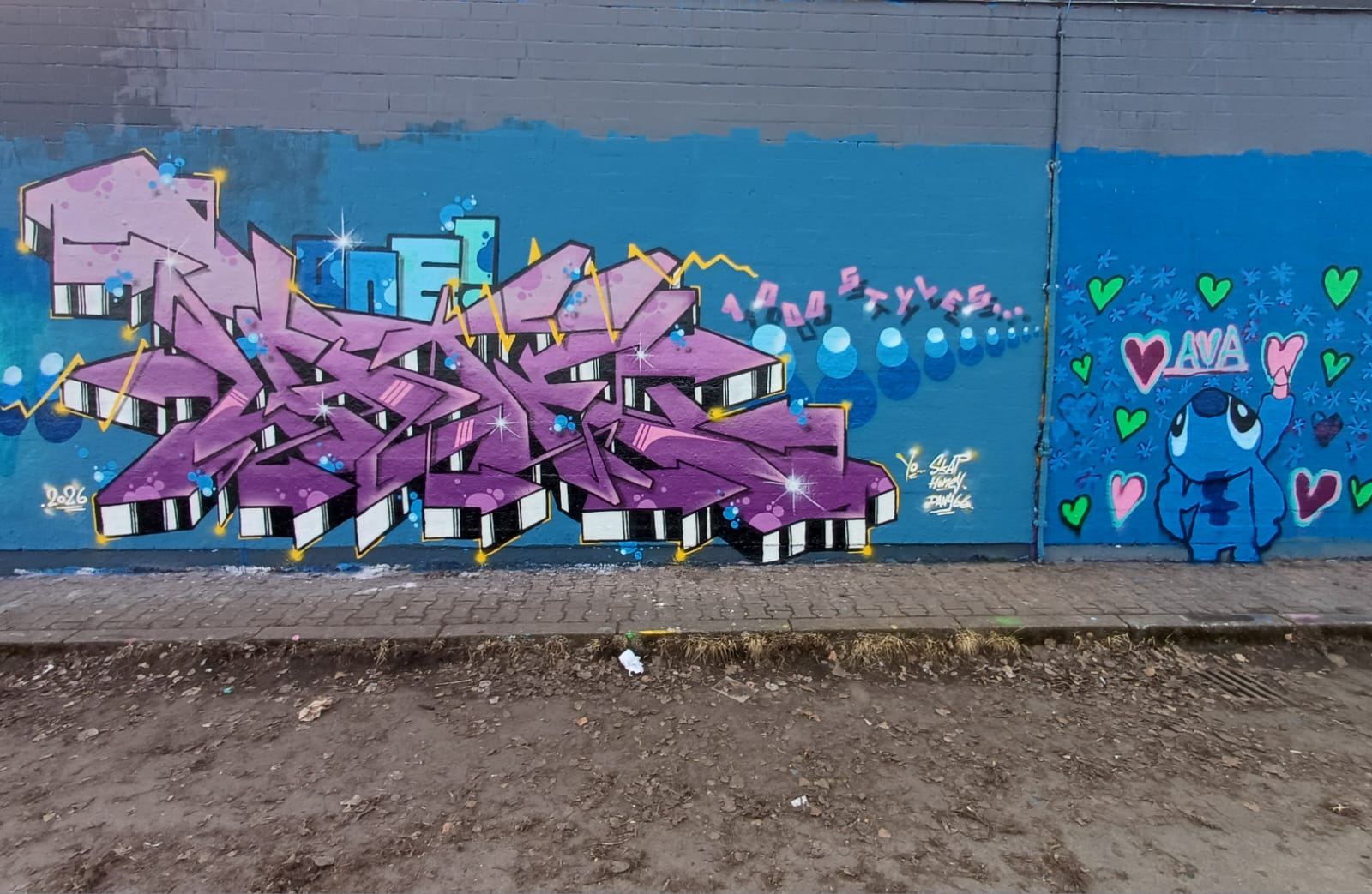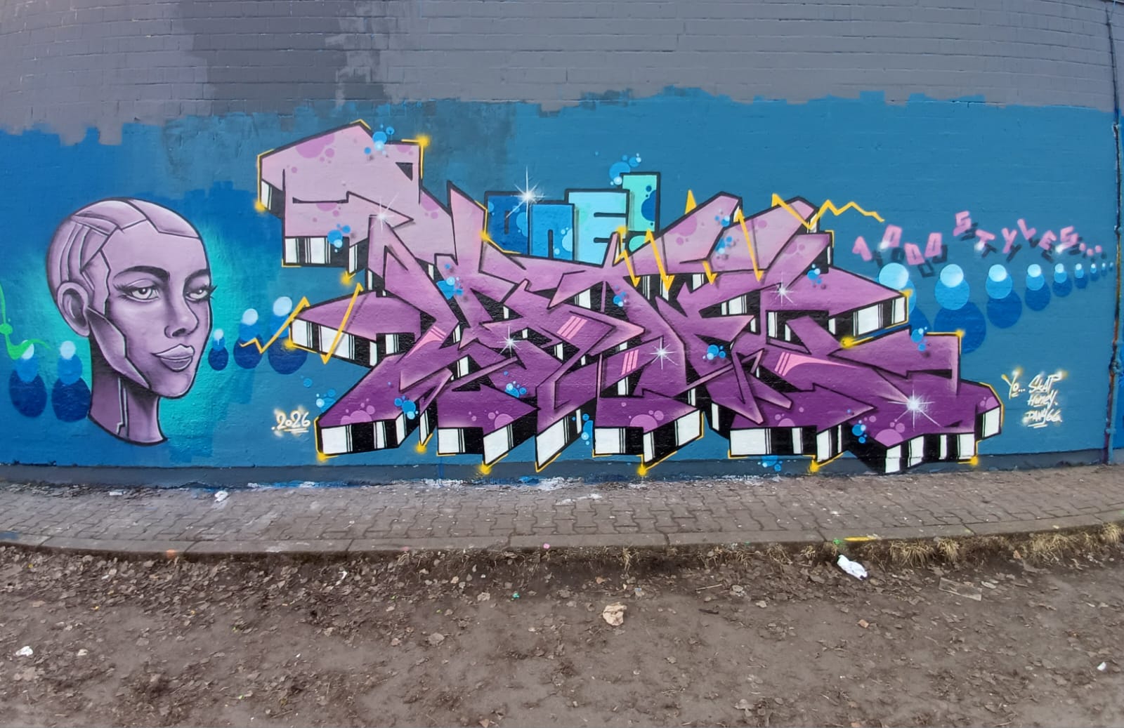 This awesome graffiti wall was painted during the Father’s Day Jam on 26th May 2022. In between there is an artwork integrated into the wall by HOOMS and LEFT which they created at a previous spray session. The artworks from left to right were made by REK 53, SOUND, SAMK, MYA, HOOMS & LEFT (from previous event), HOOMS, AMSPEAR PEEKOPS, LEFT, ACKO.