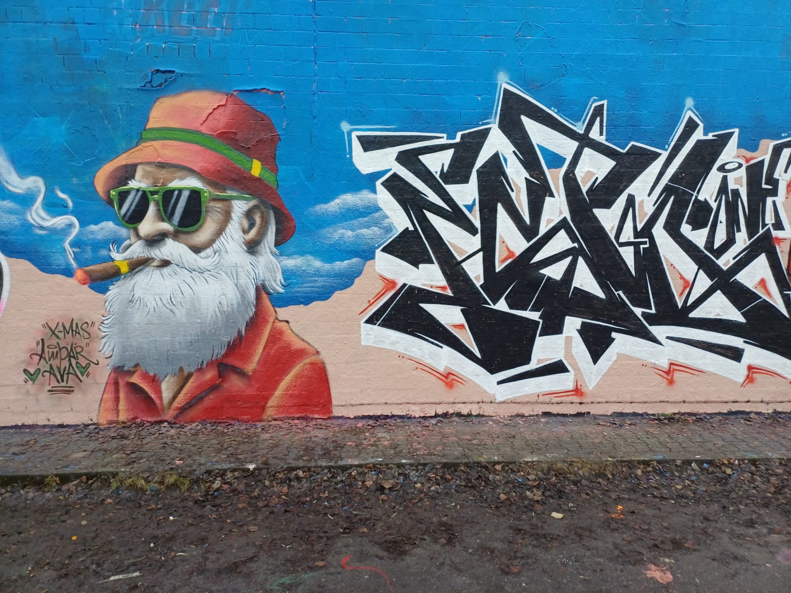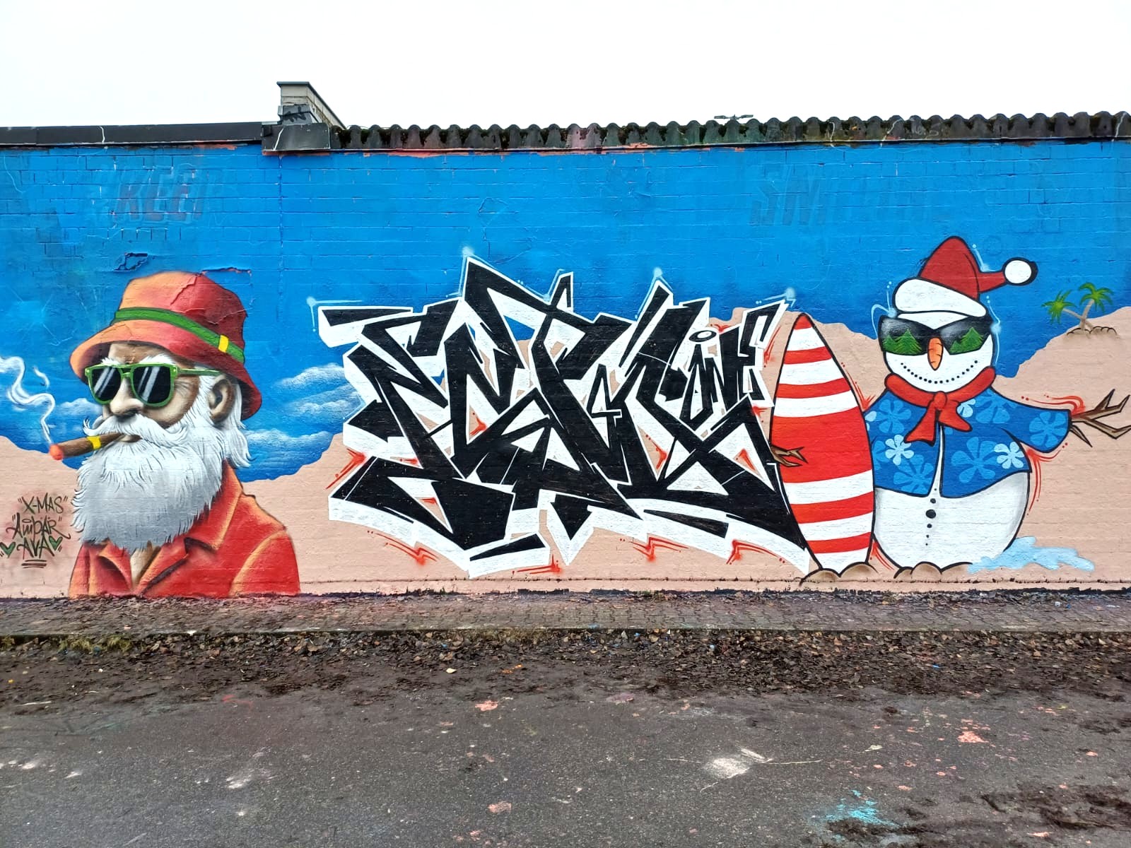 The graffiti on the far left of this great Christmas wall is from ACKO, and the artworks on the right are from LEFT and ESTO