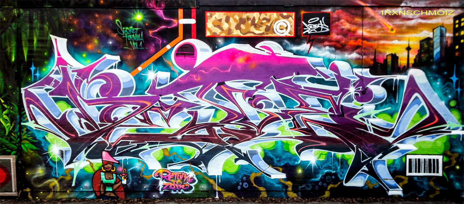 The graffiti on the far left is from WAVE NINE and the shaman character was made by CORS ONE