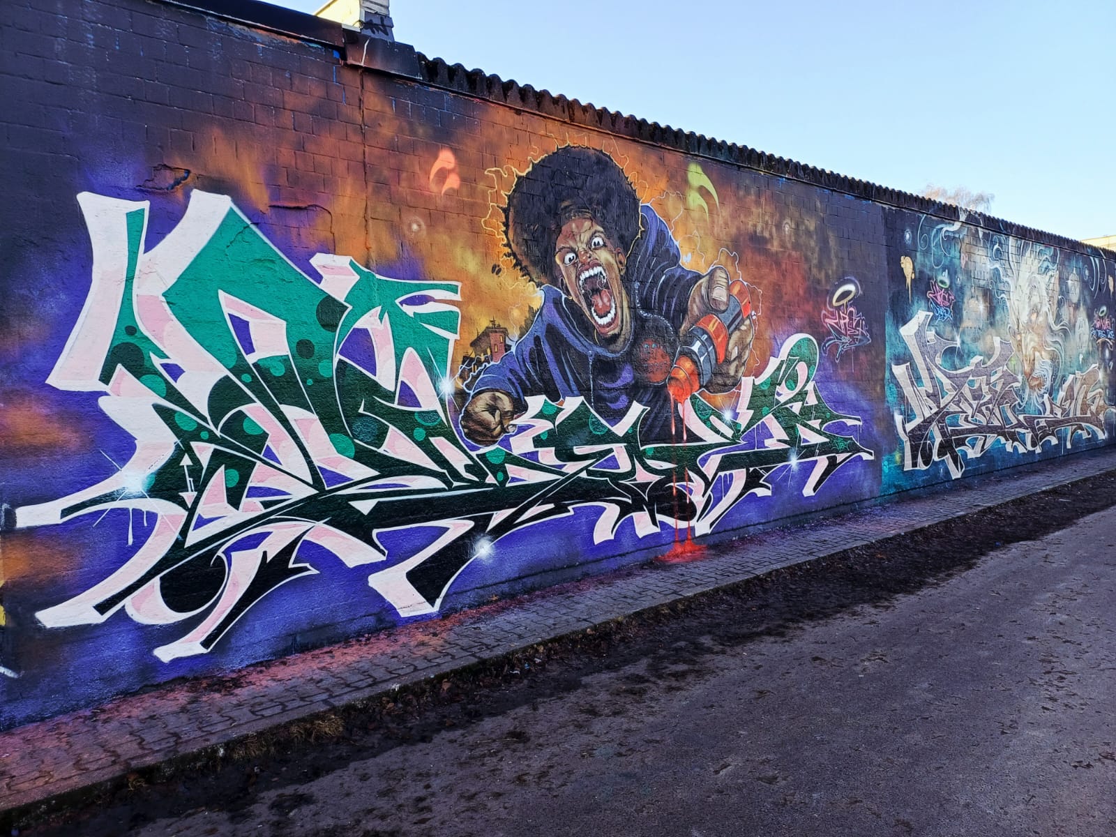 The head on the left is from CORS ONE, the graffiti on the left was made by MILK and the graffiti on the right is from SAMK