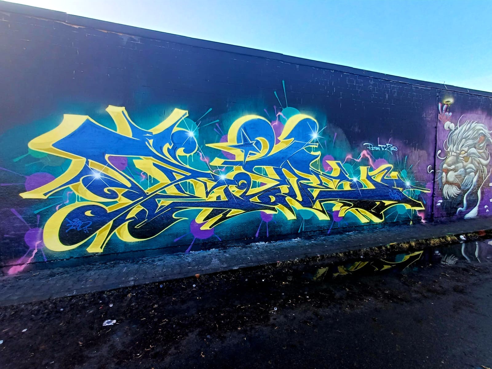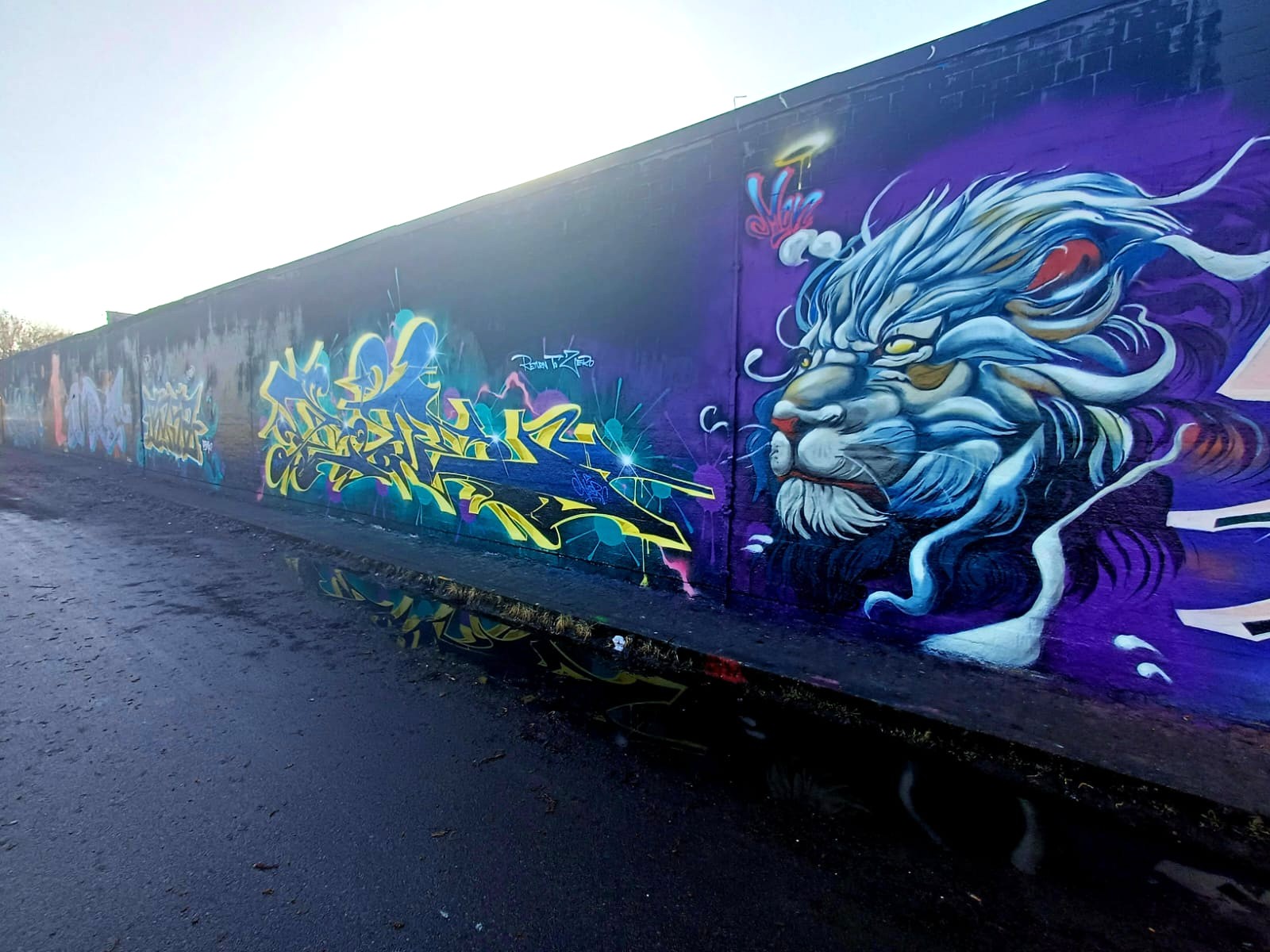 The graffiti on the left are from MONKEE, CRÜML, KRÜML and BOSA, and the white lion on the right was made by MON