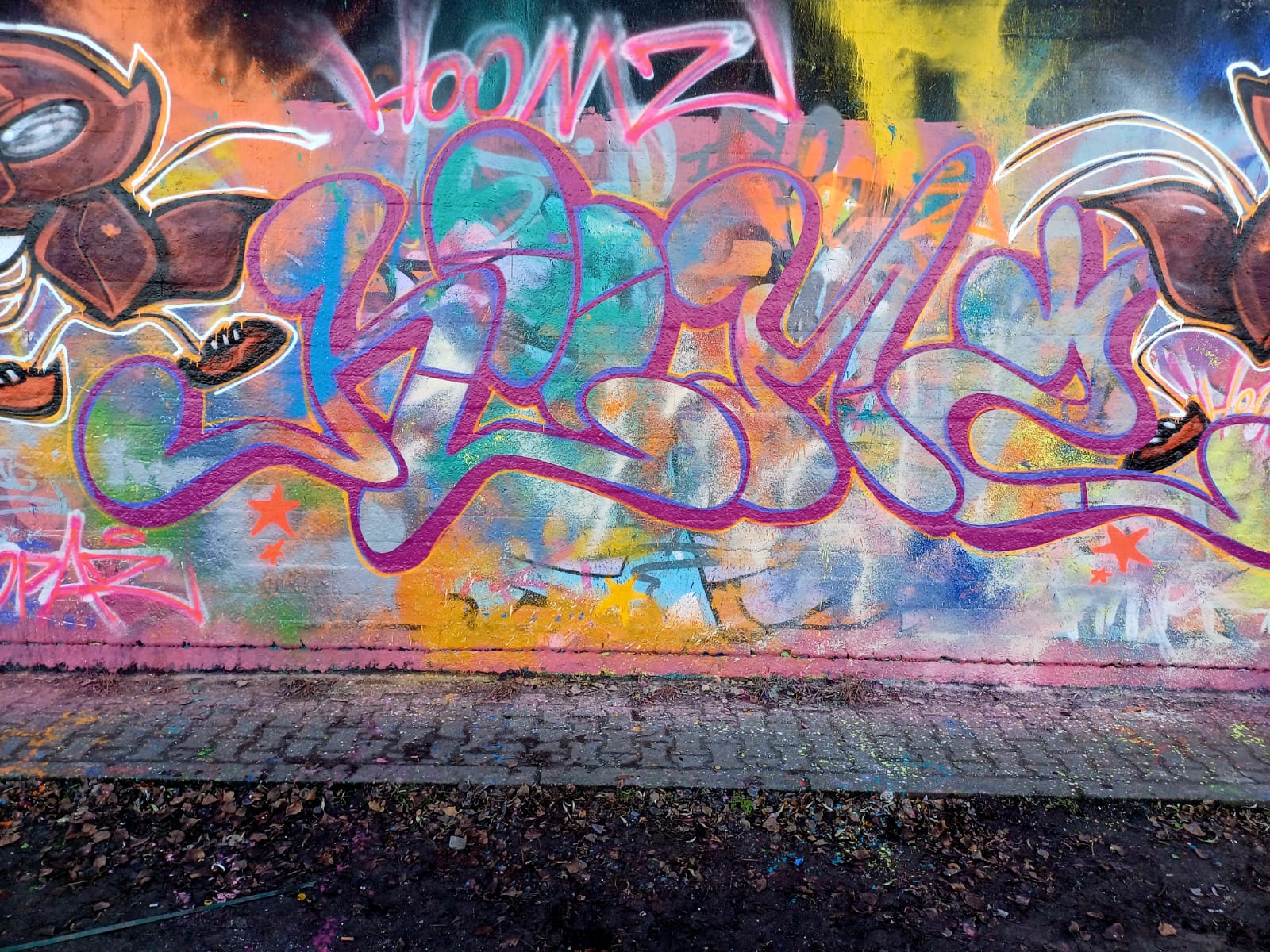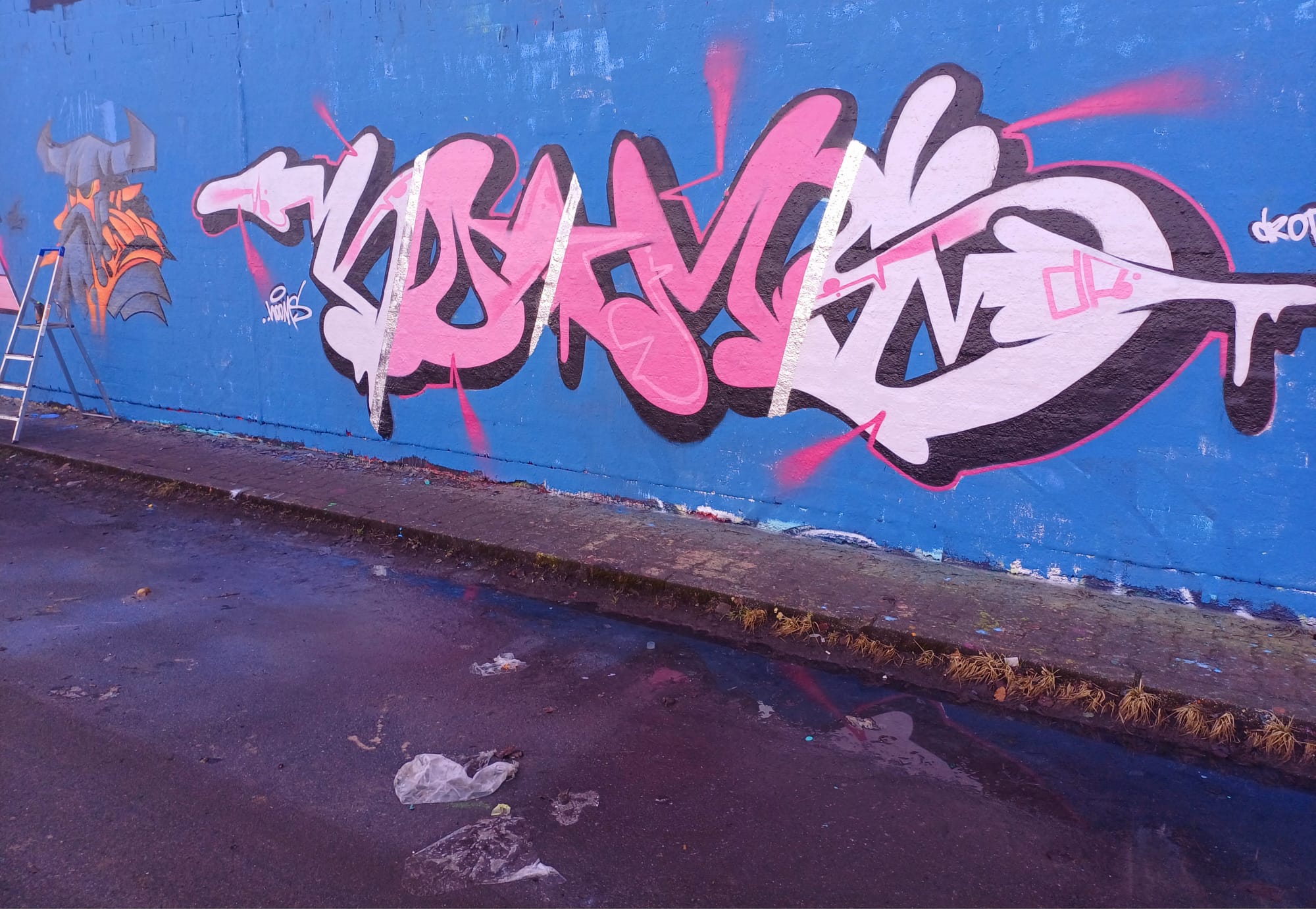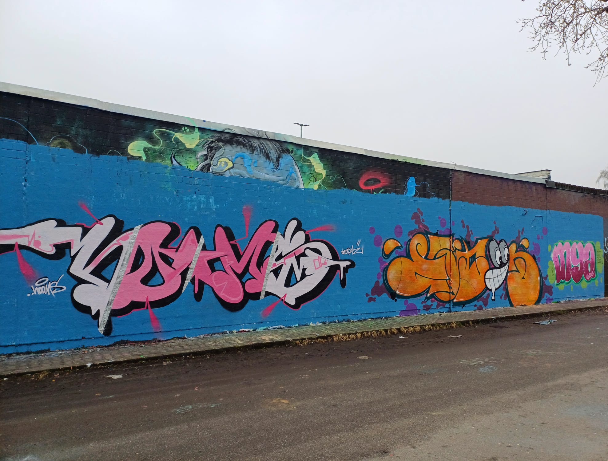 This awesome graffiti wall was painted during the Father’s Day Jam on 26th May 2022. In between there is an artwork integrated into the wall by HOOMS and LEFT which they created at a previous spray session. The artworks from left to right were made by REK 53, SOUND, SAMK, MYA, HOOMS & LEFT (from previous event), HOOMS, AMSPEAR PEEKOPS, LEFT, ACKO.