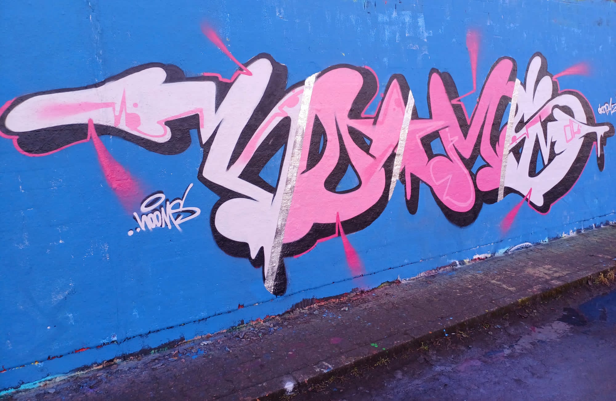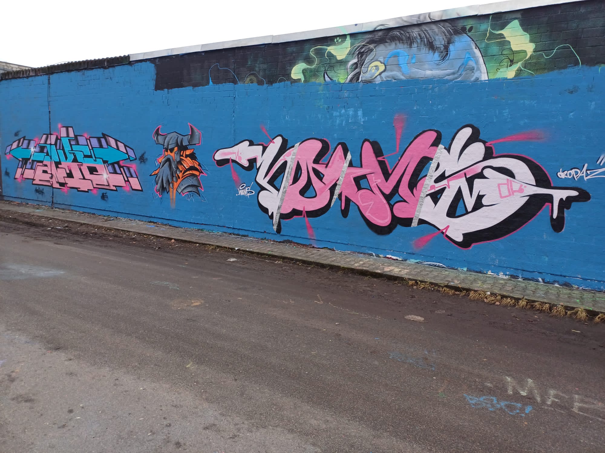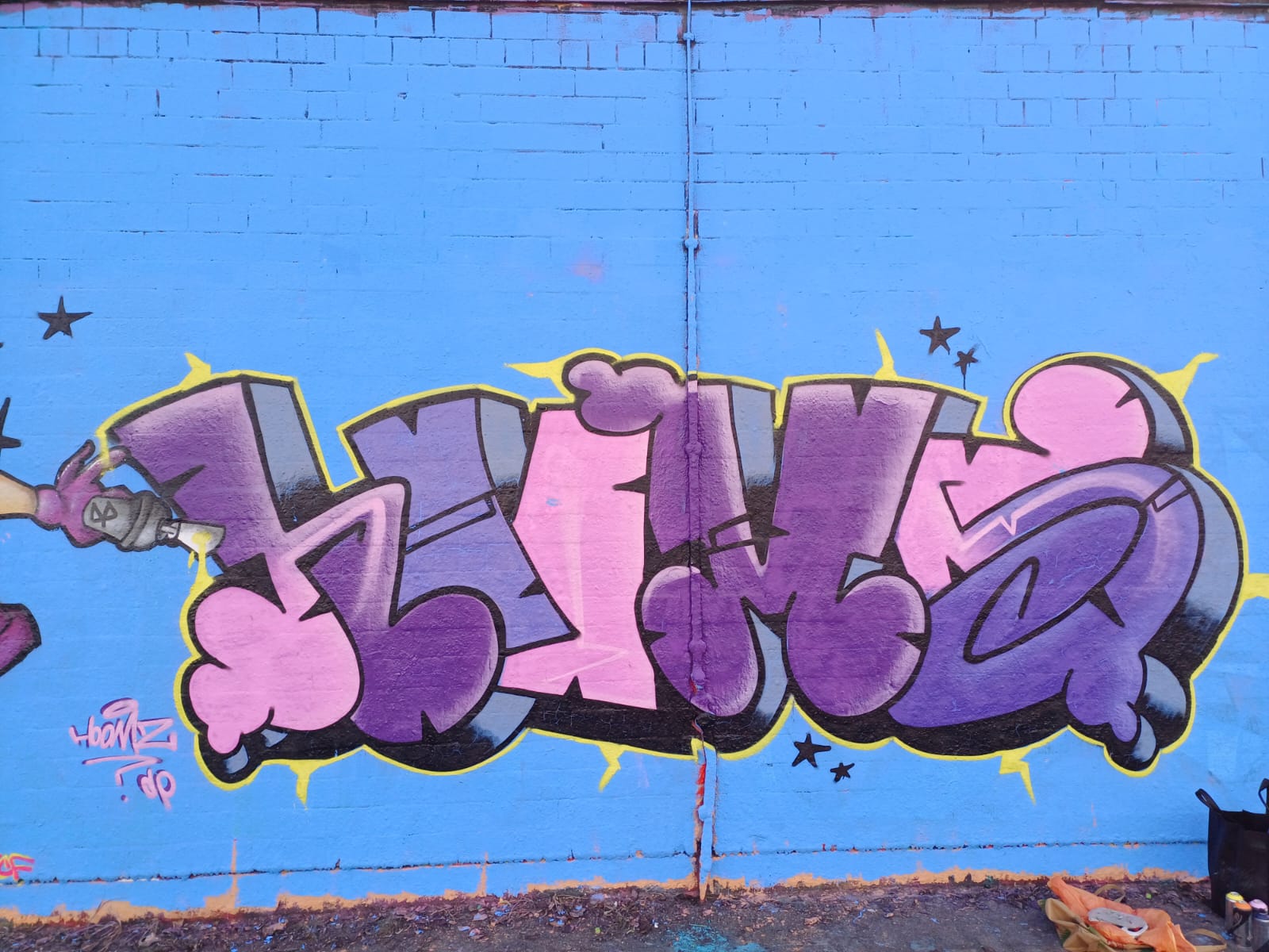 This awesome graffiti wall was painted during the Father’s Day Jam on 26th May 2022. In between there is an artwork integrated into the wall by HOOMS and LEFT which they created at a previous spray session. The artworks from left to right were made by REK 53, SOUND, SAMK, MYA, HOOMS & LEFT (from previous event), HOOMS, AMSPEAR PEEKOPS, LEFT, ACKO.