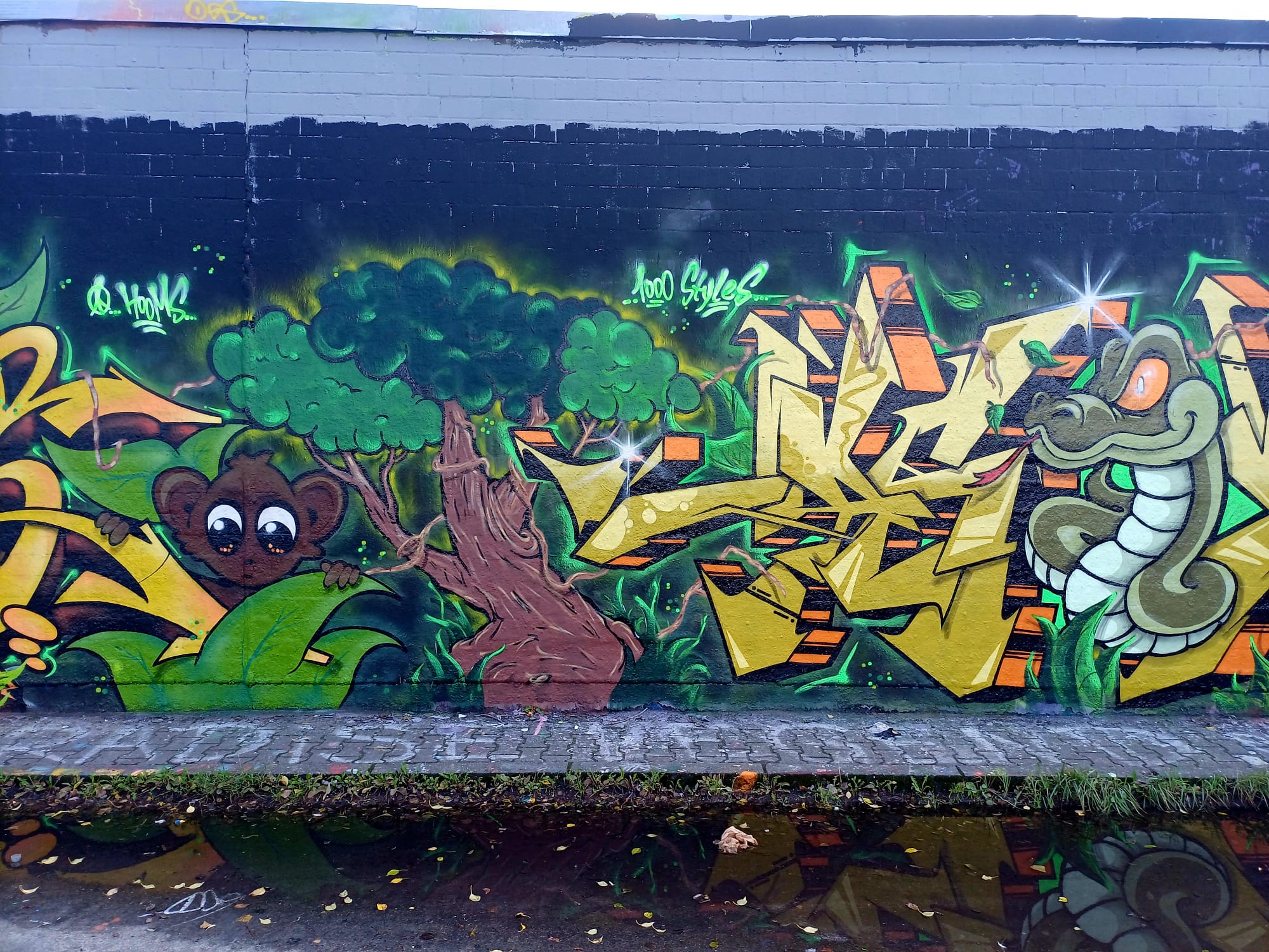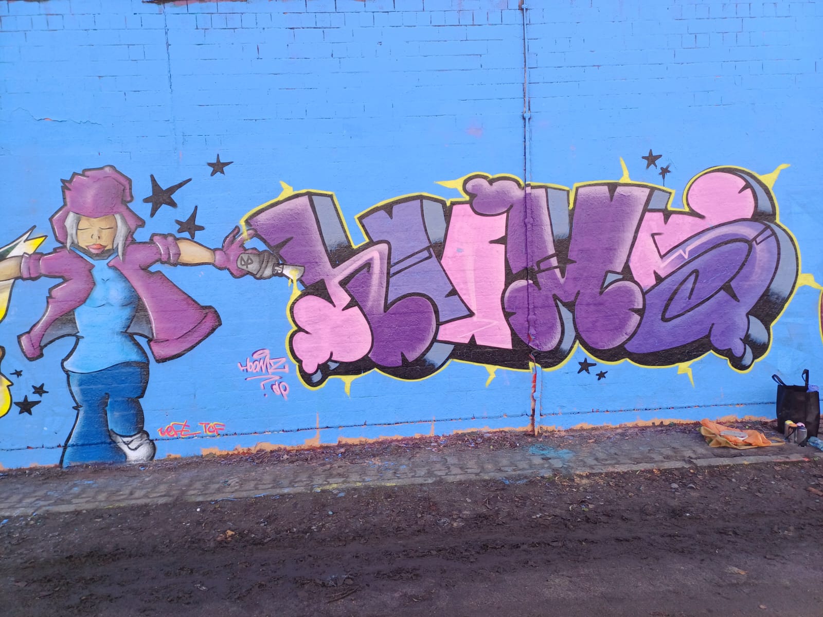 This awesome graffiti wall was painted during the Father’s Day Jam on 26th May 2022. In between there is an artwork integrated into the wall by HOOMS and LEFT which they created at a previous spray session. The artworks from left to right were made by REK 53, SOUND, SAMK, MYA, HOOMS & LEFT (from previous event), HOOMS, AMSPEAR PEEKOPS, LEFT, ACKO.