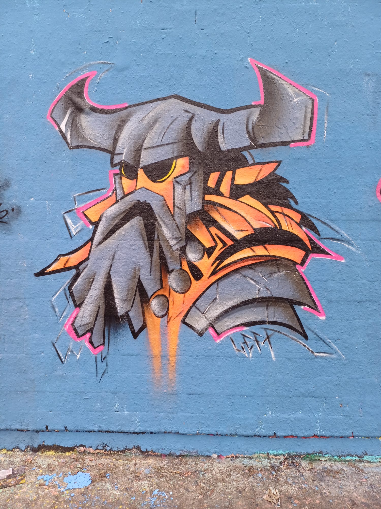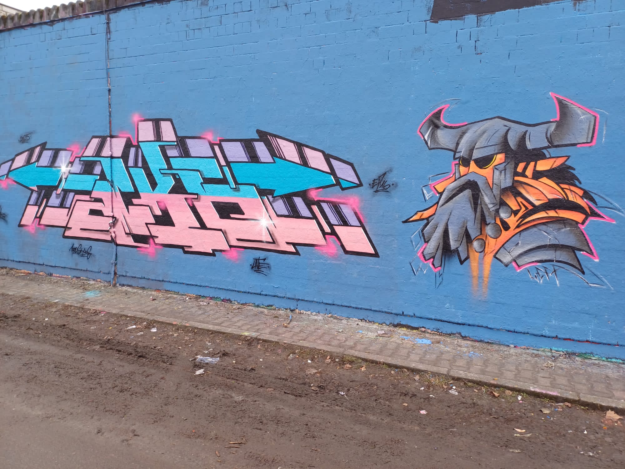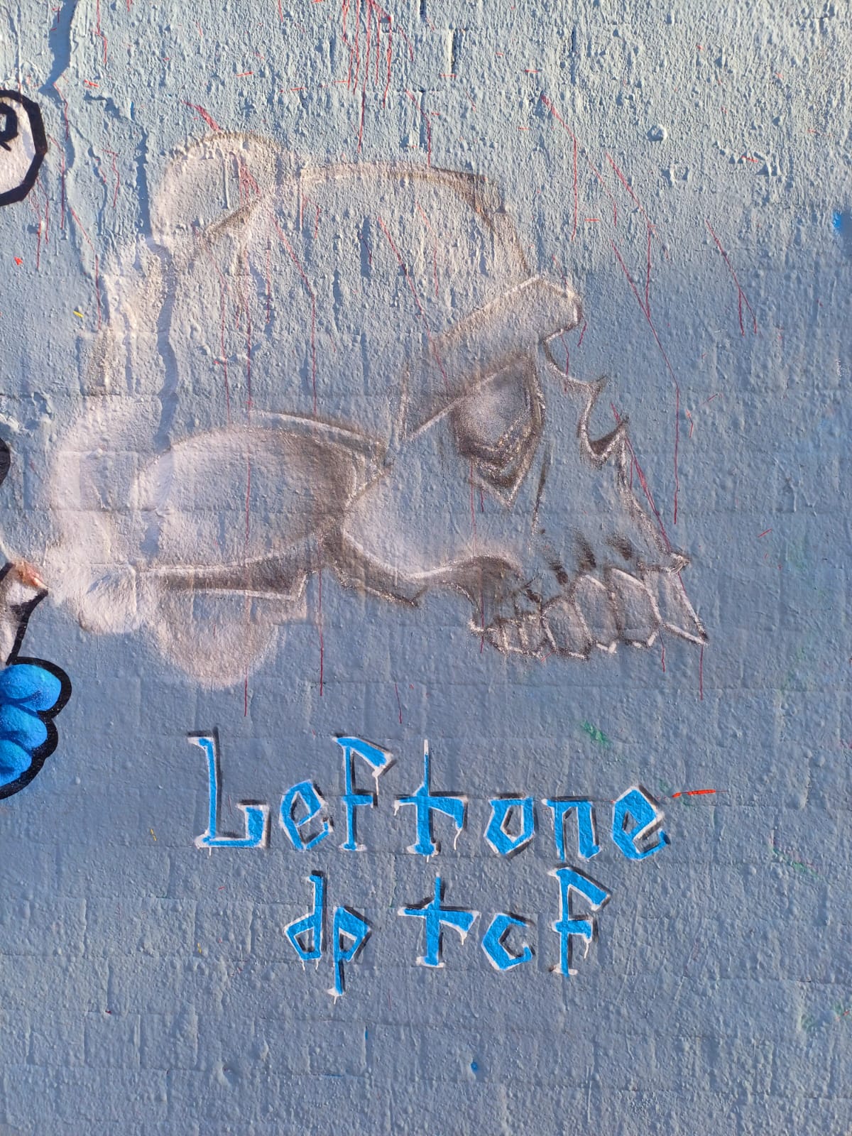 The graffiti on the left was made by HEMA79, the Skeletor or Keldor character is from LEFTONE and the graffiti on the right is from HOOMZER.