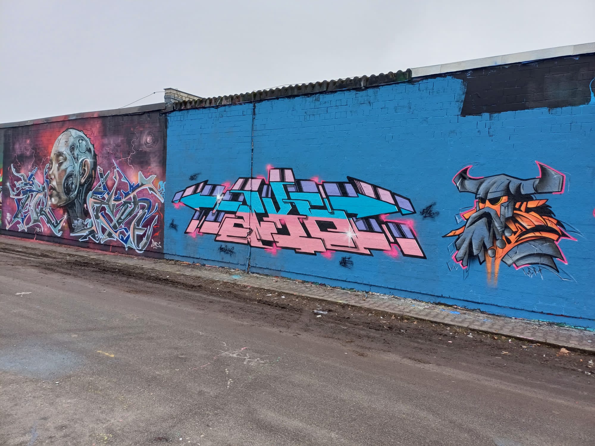 The artworks on the far left are from ACKO, HOOMS and FEIK and the graffiti on the far right are from MYA, SHERA, OSLO, ESTO and WIEK