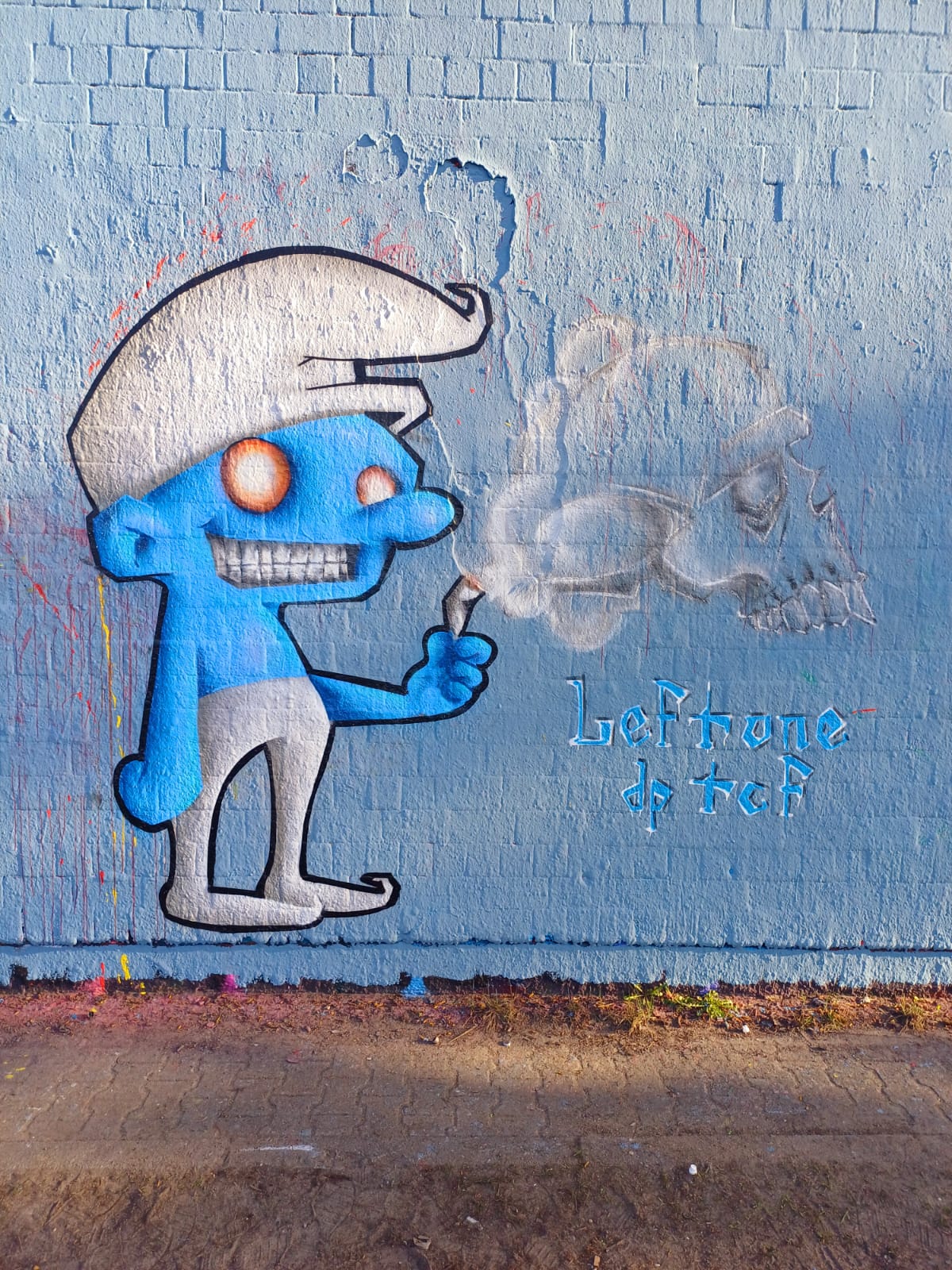 The blue artwork on the left was made by LEFTONE, the artwork in the middle is from HOOMZER and the graffiti on the right was made by HEMA 79.