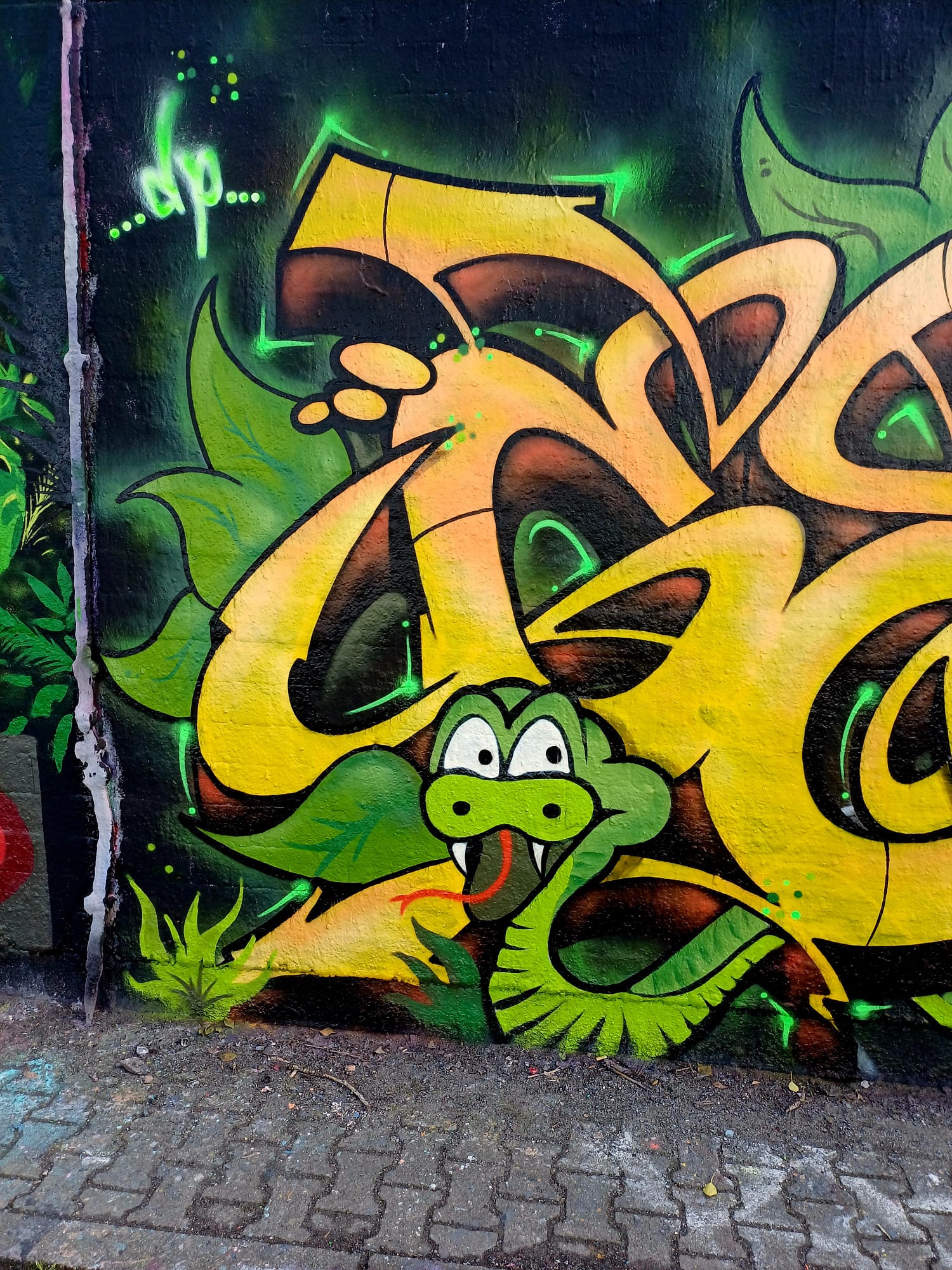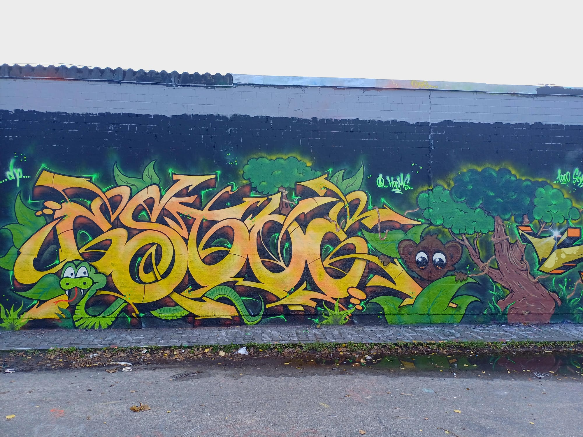 The graffiti on the left is from KAOK, the following graffiti and the little Alien were made by LEFT, the graffiti next to it is from HOOMS, the serpient was made by AUTARK and the artwork on the right is from ACKO aka LATE aka EF16 aka 1000 STYLES.