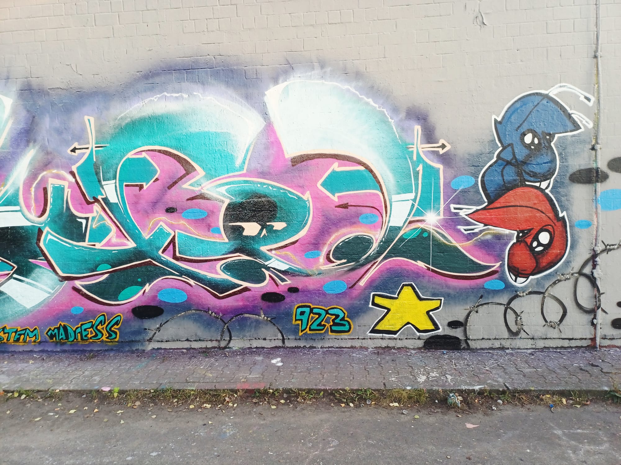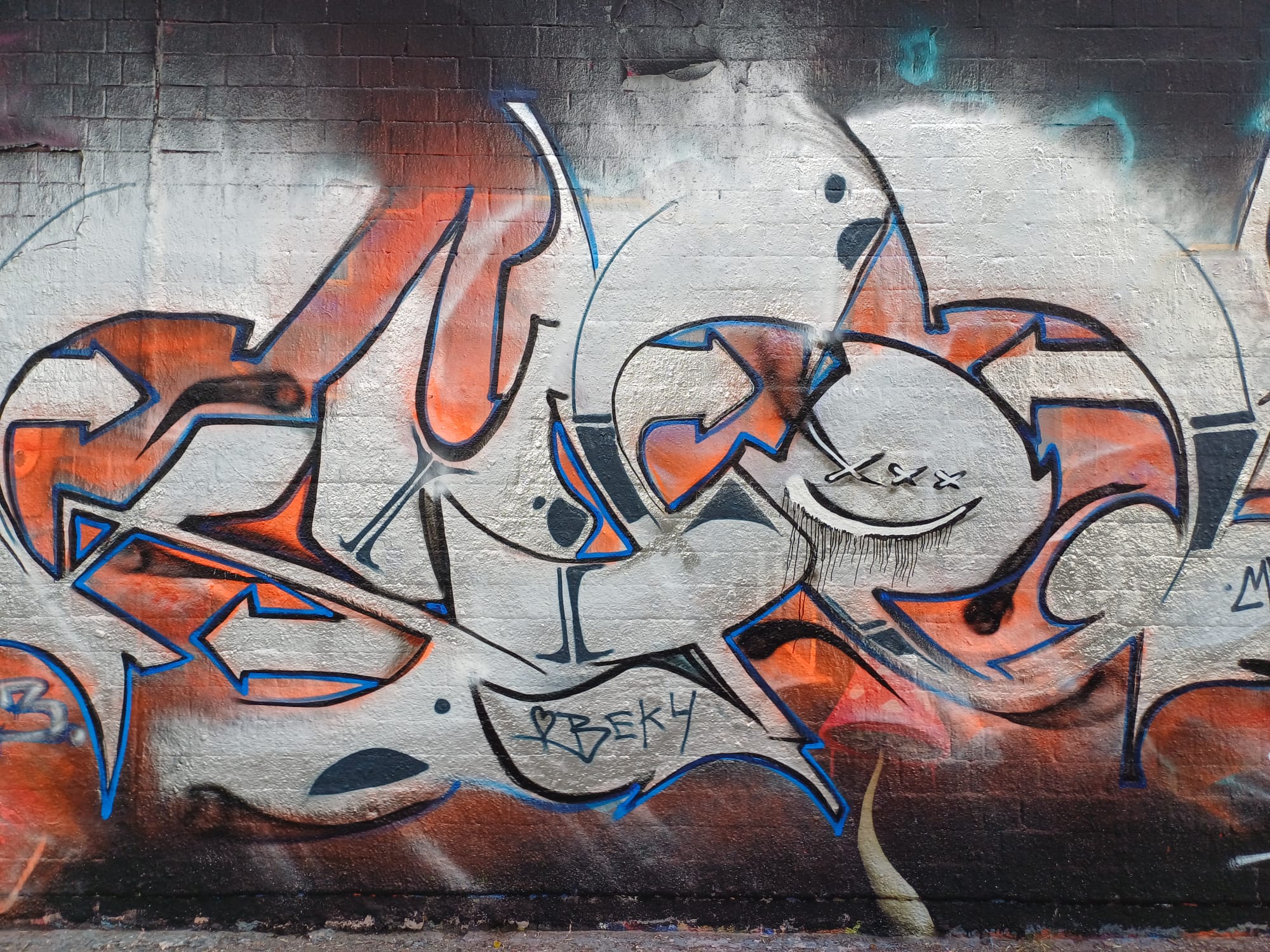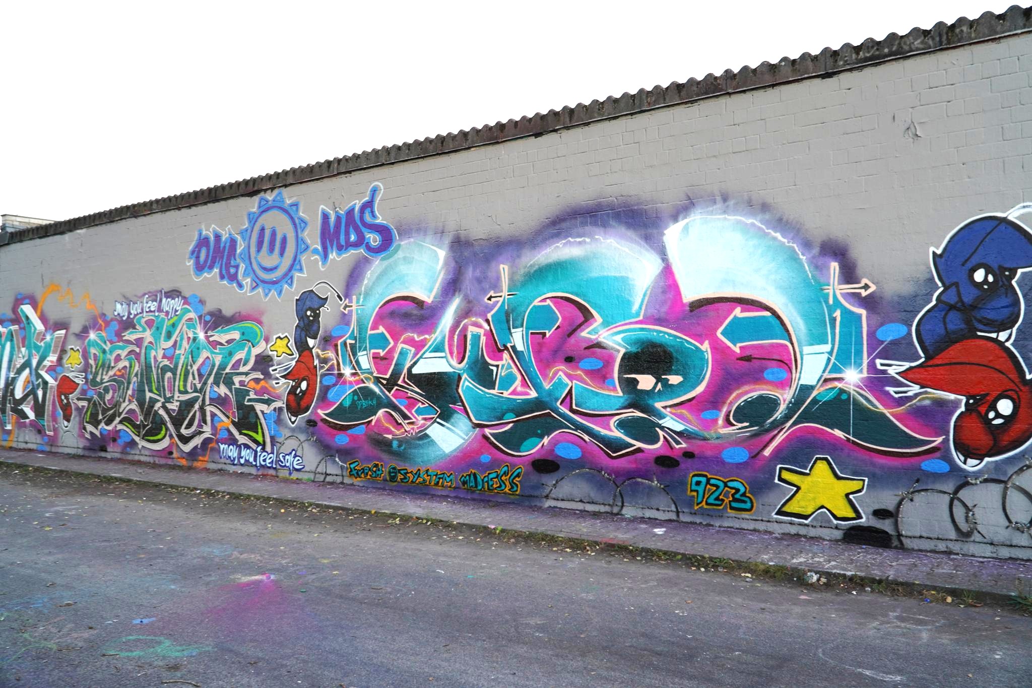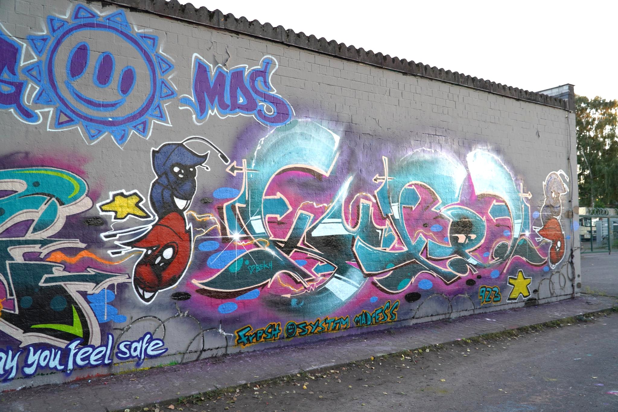 The graffiti on the left is from HEMA 79, the graffiti in the middle was made by MONKEE, the graffiti on the right is from ACKO aka LATE aka EF16 and the two smiley artworks stand for the crew NEW 3RD EYE MOVEMENT or in short N3M.