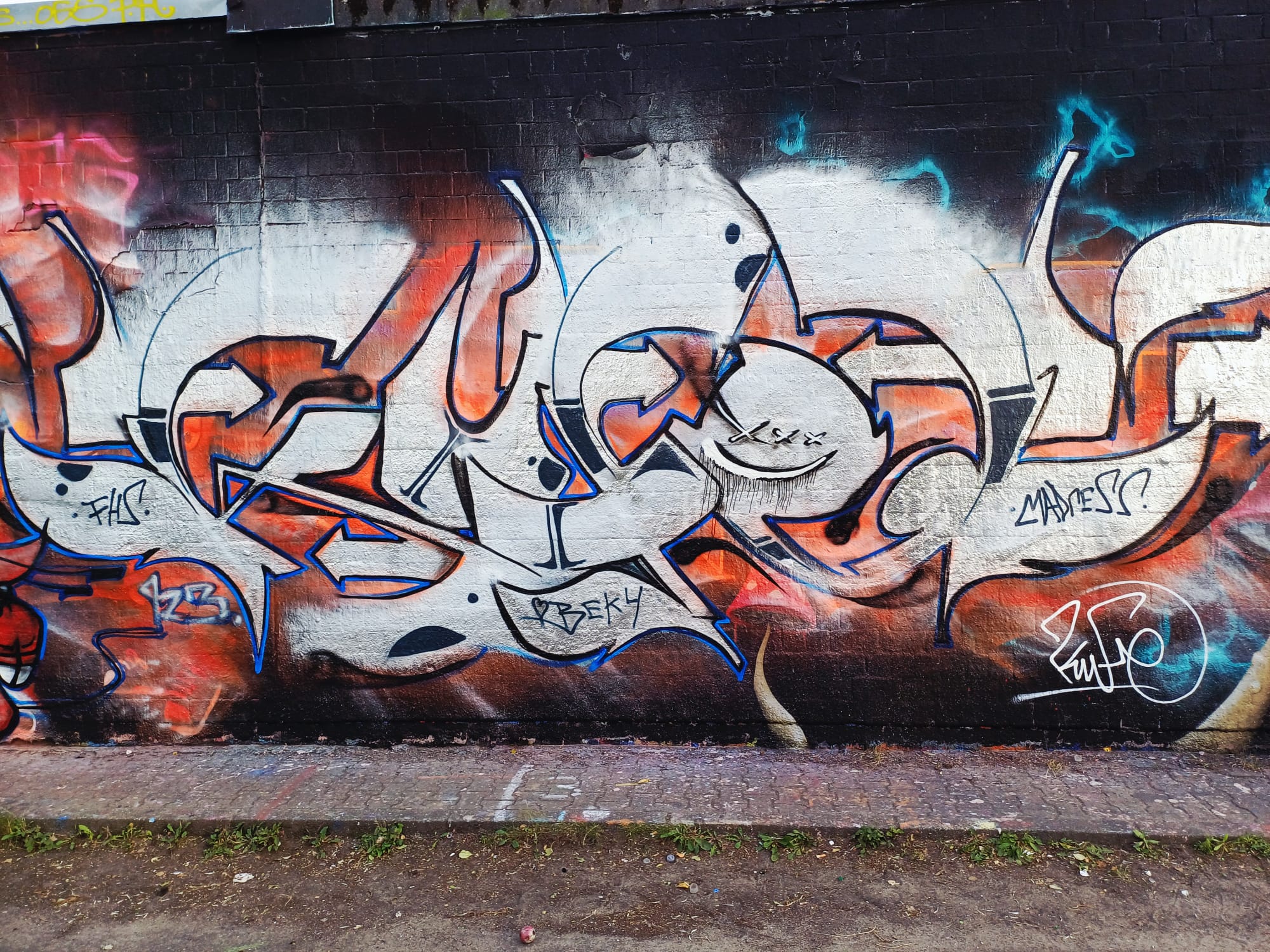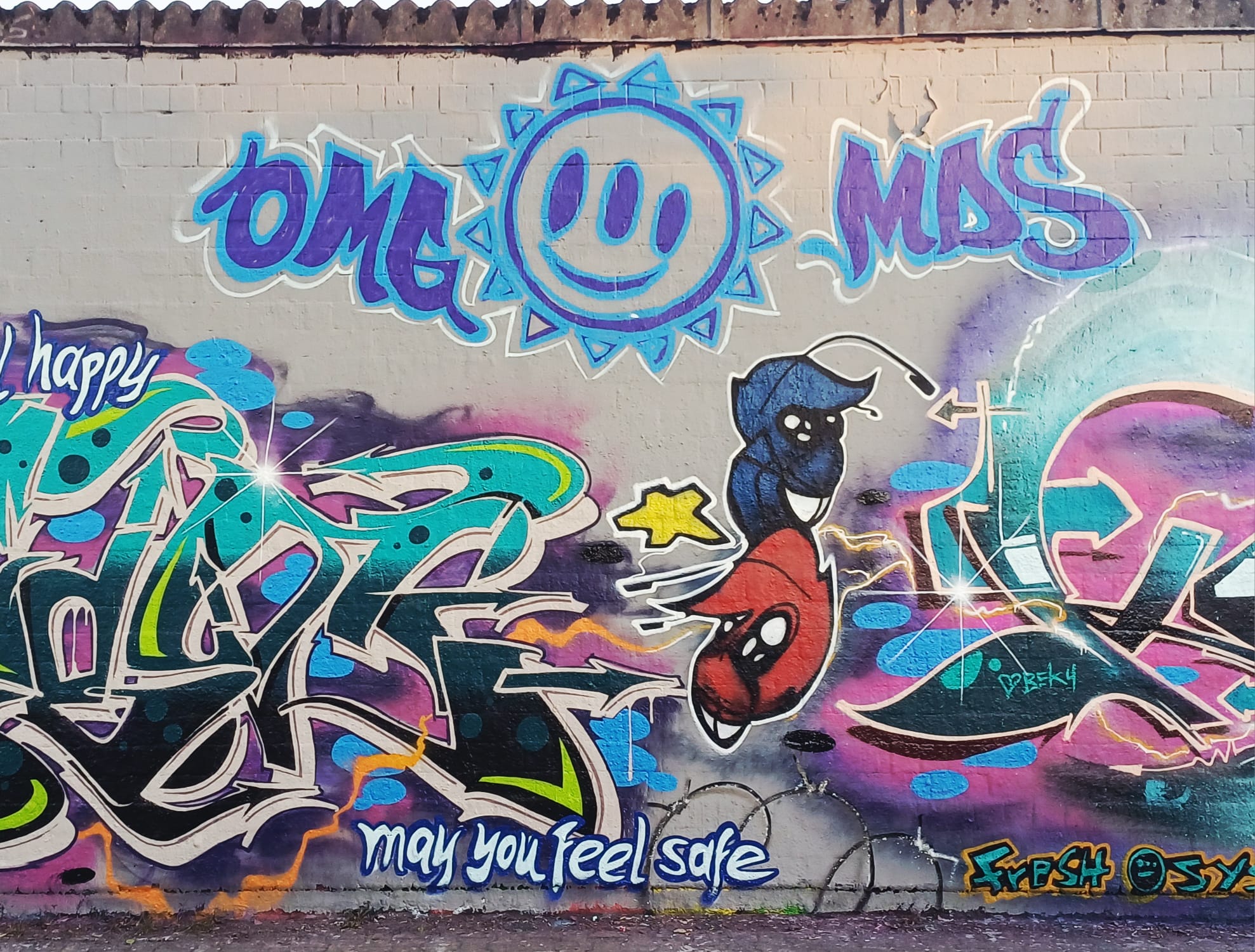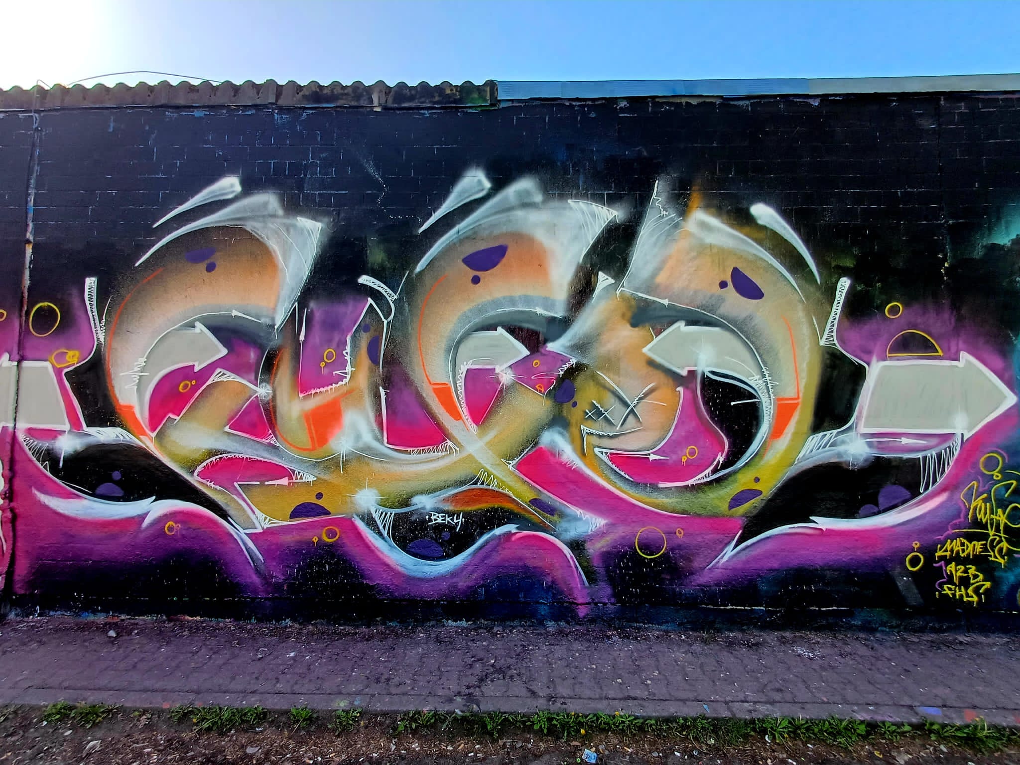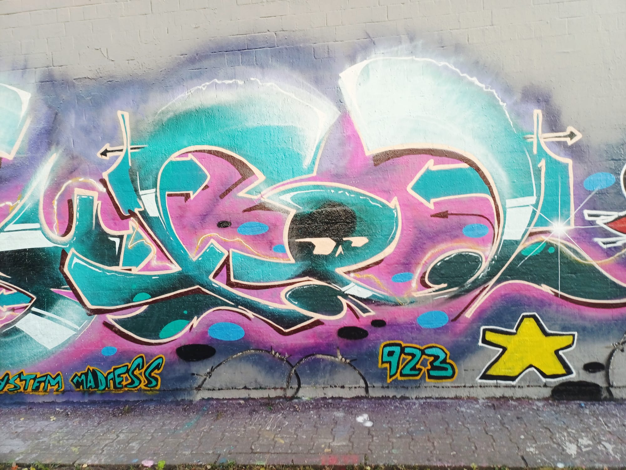 The graffiti on the left is from HEMA 79, the graffiti in the middle was made by MONKEE, the graffiti on the right is from ACKO aka LATE aka EF16 and the two smiley artworks stand for the crew NEW 3RD EYE MOVEMENT or in short N3M.