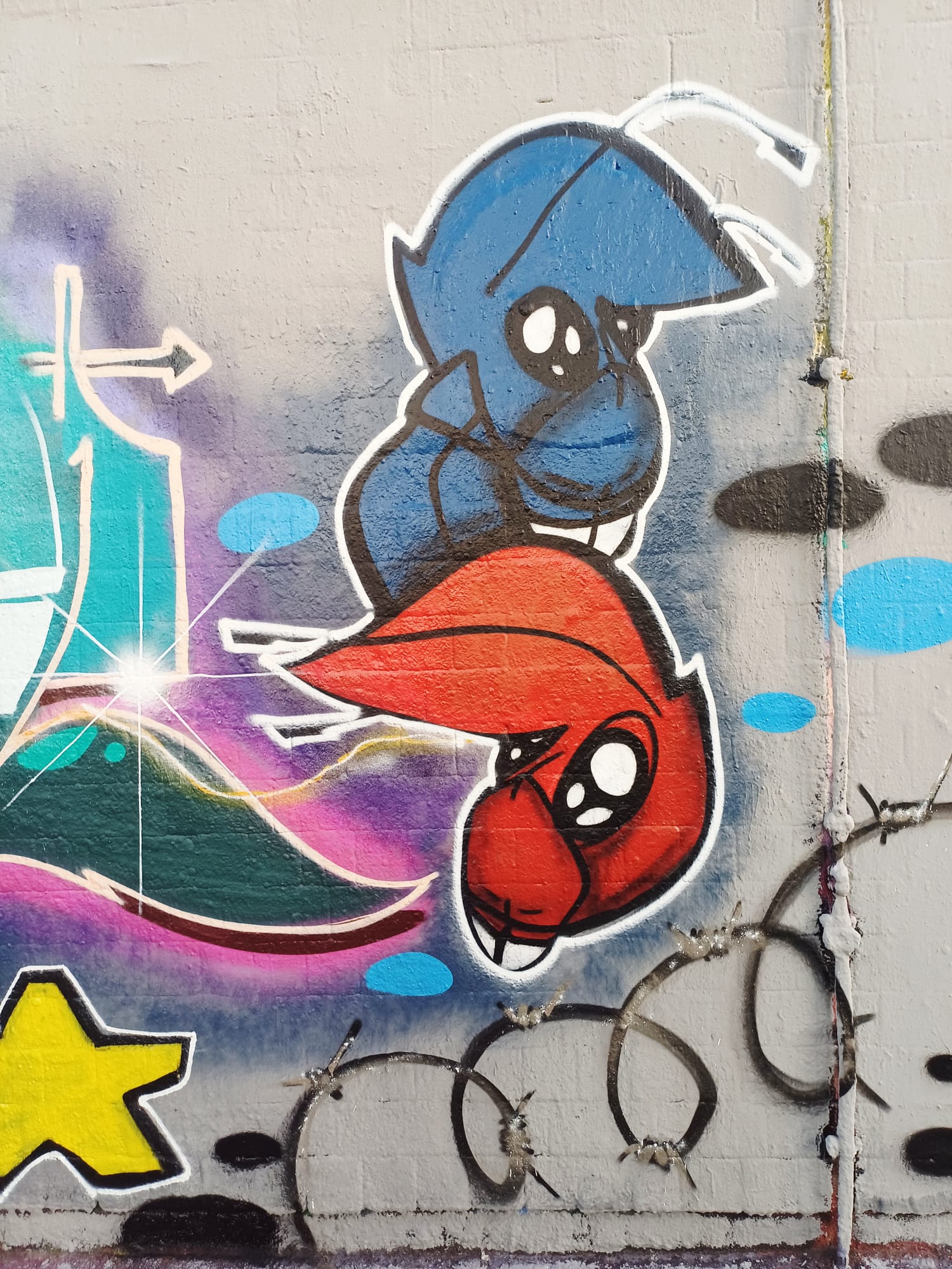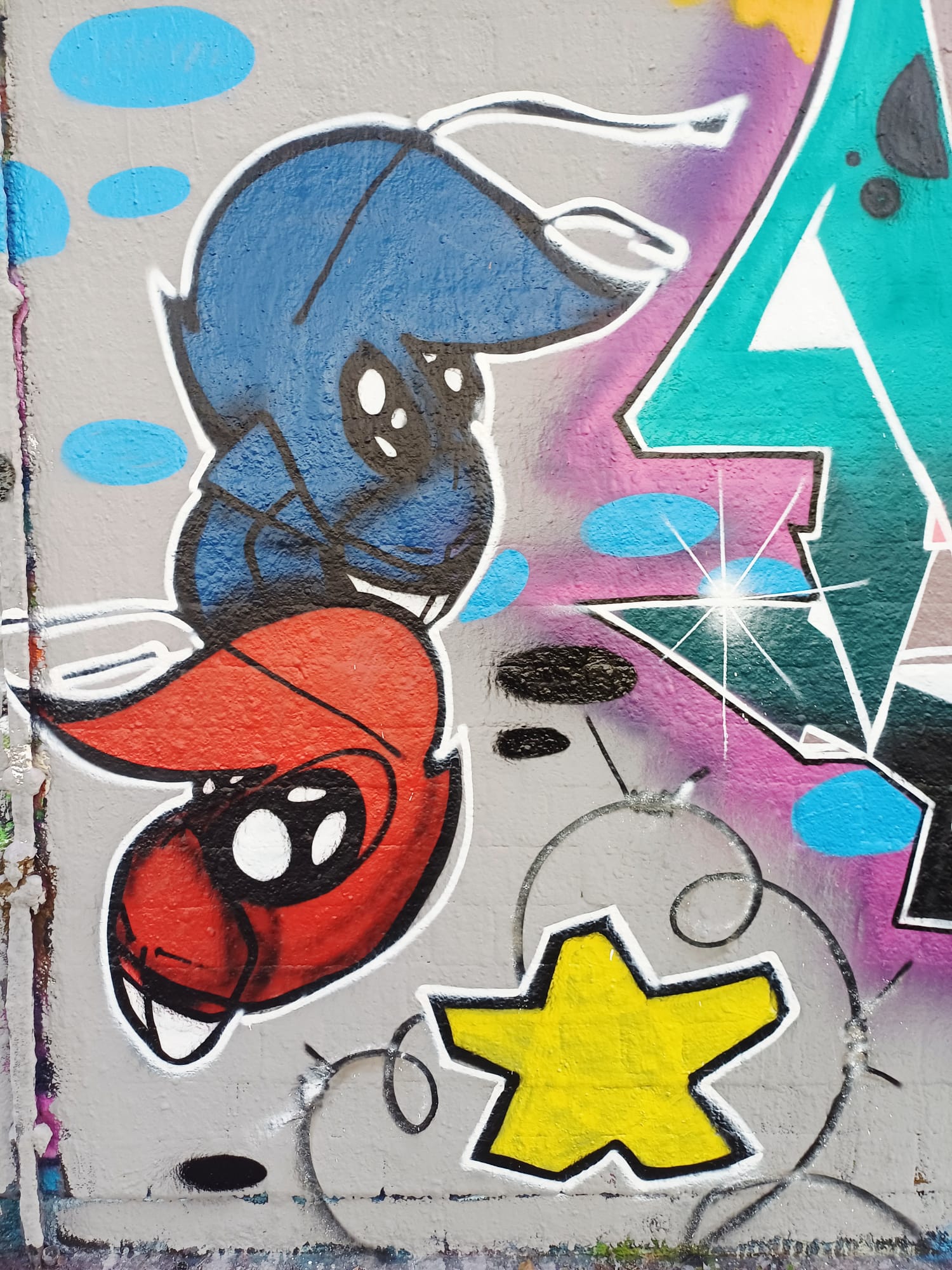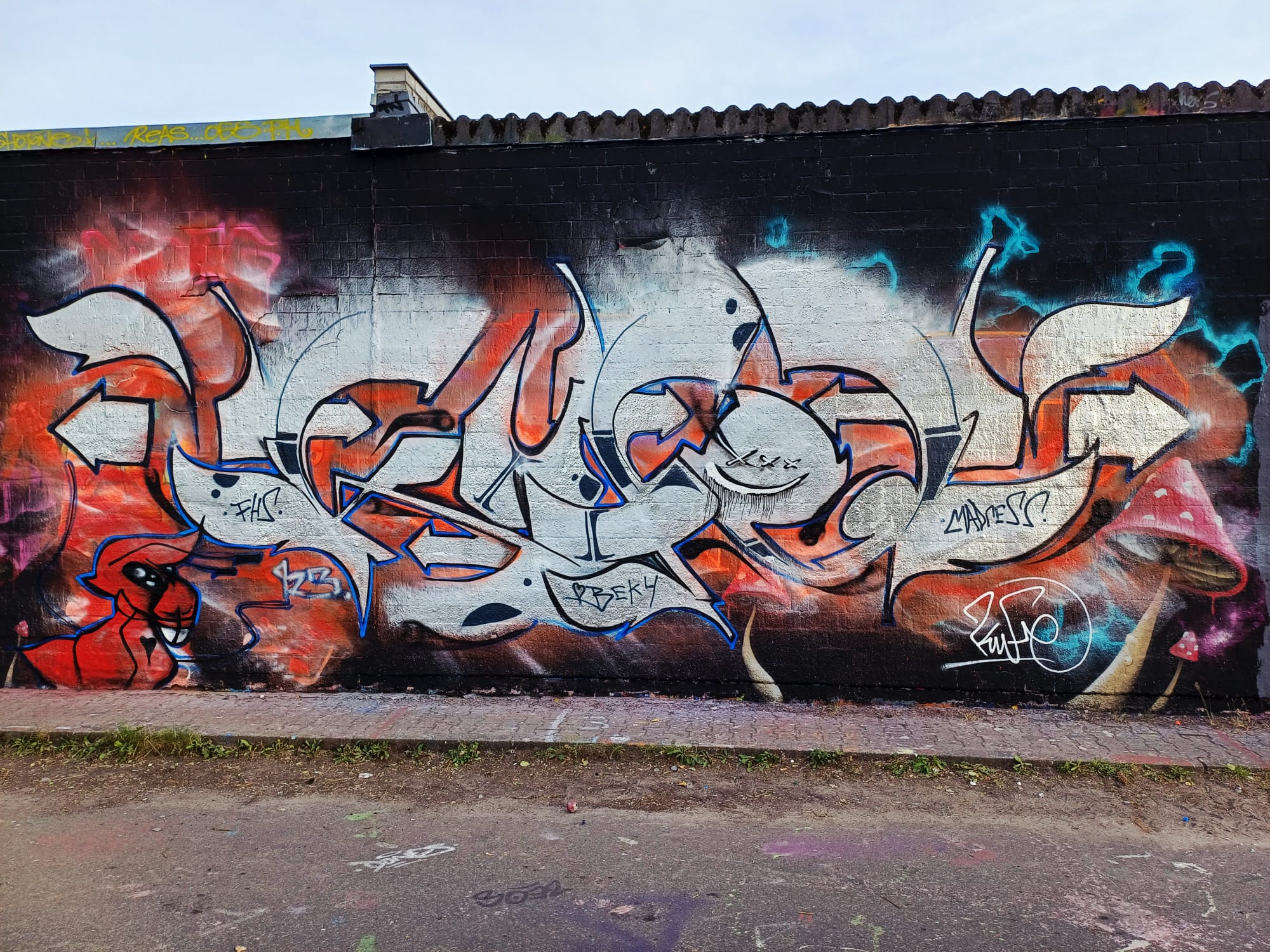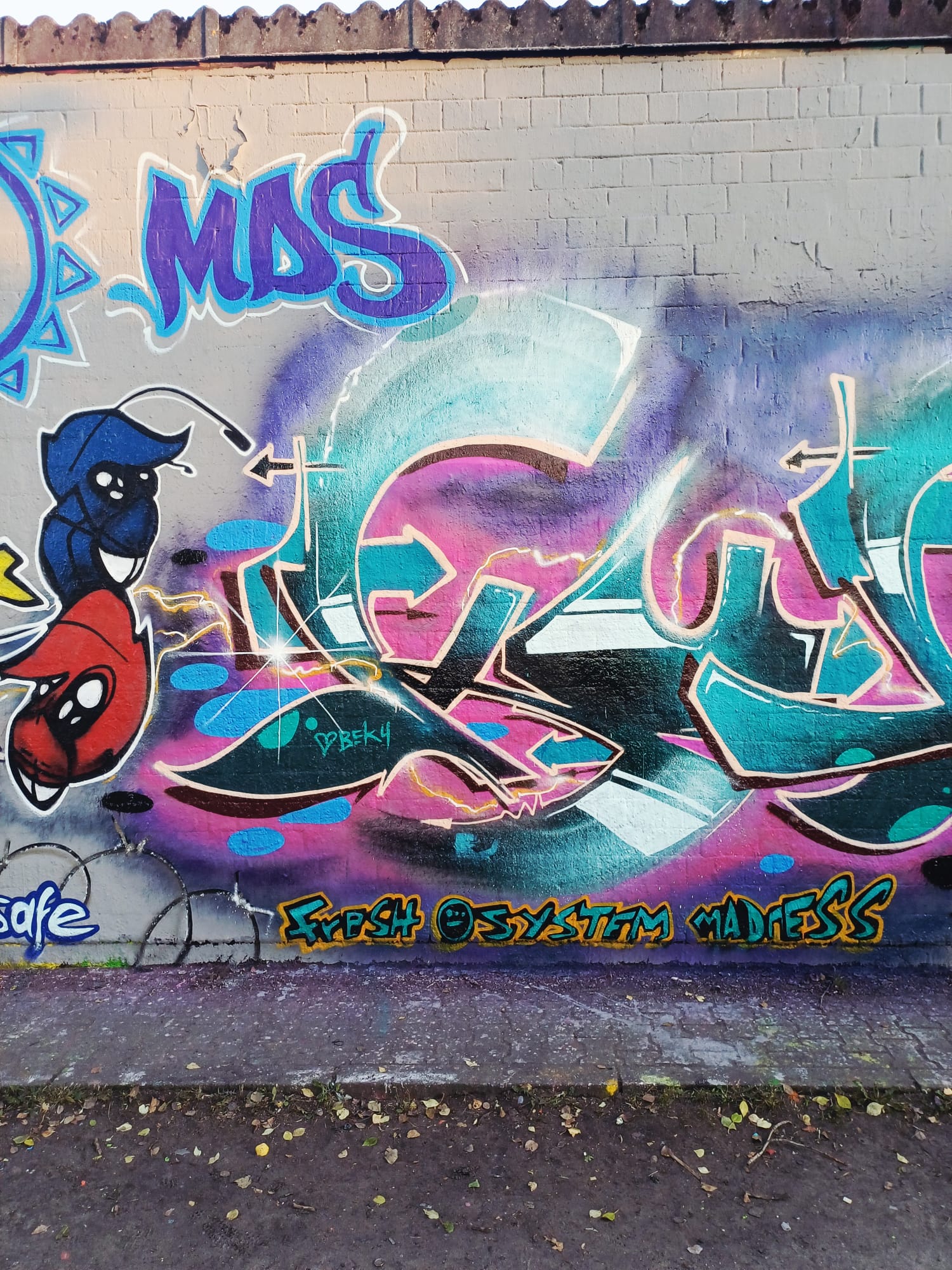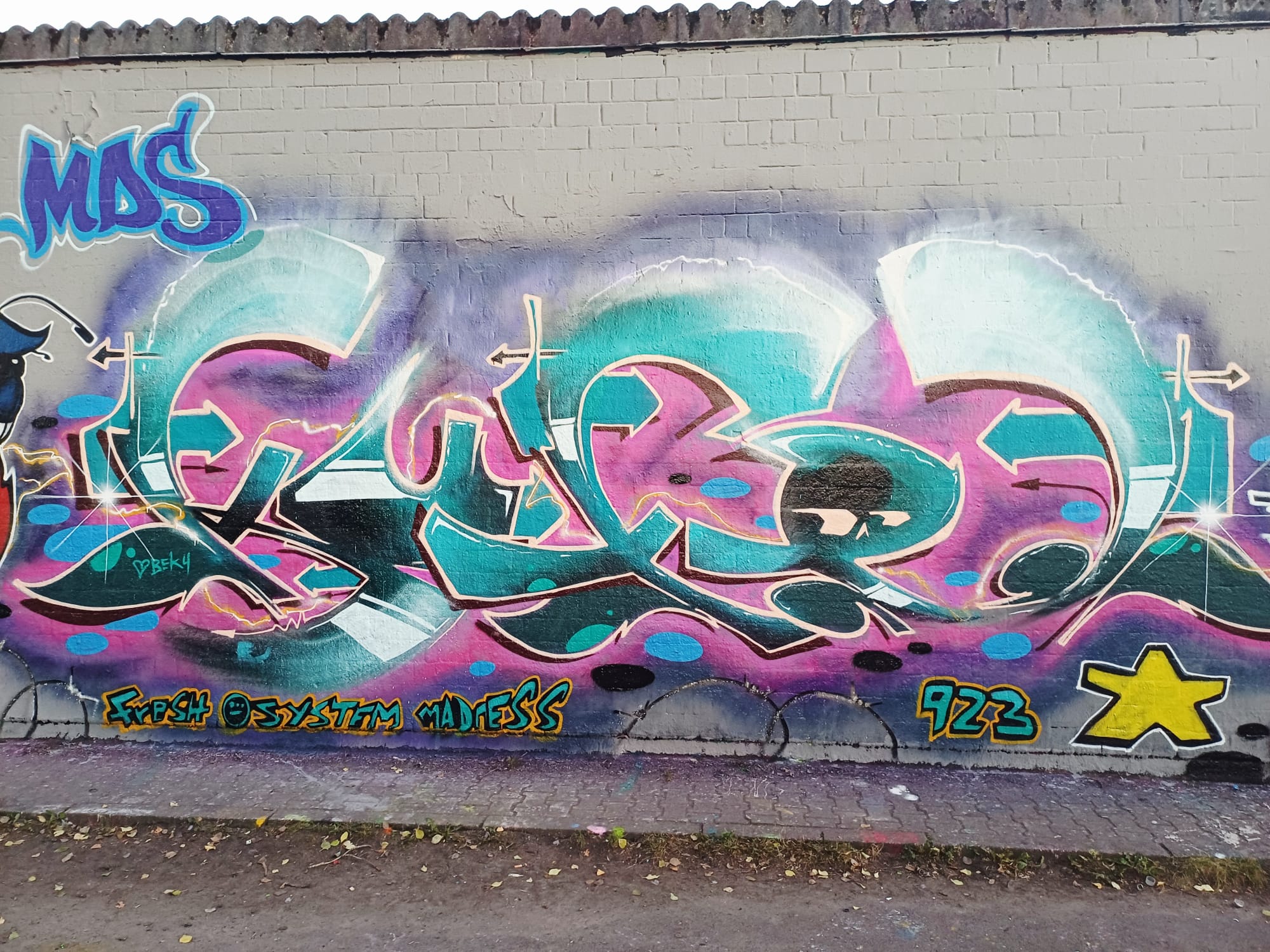 The character on the left was made by LEFT and the graffiti on the right is from ACKO