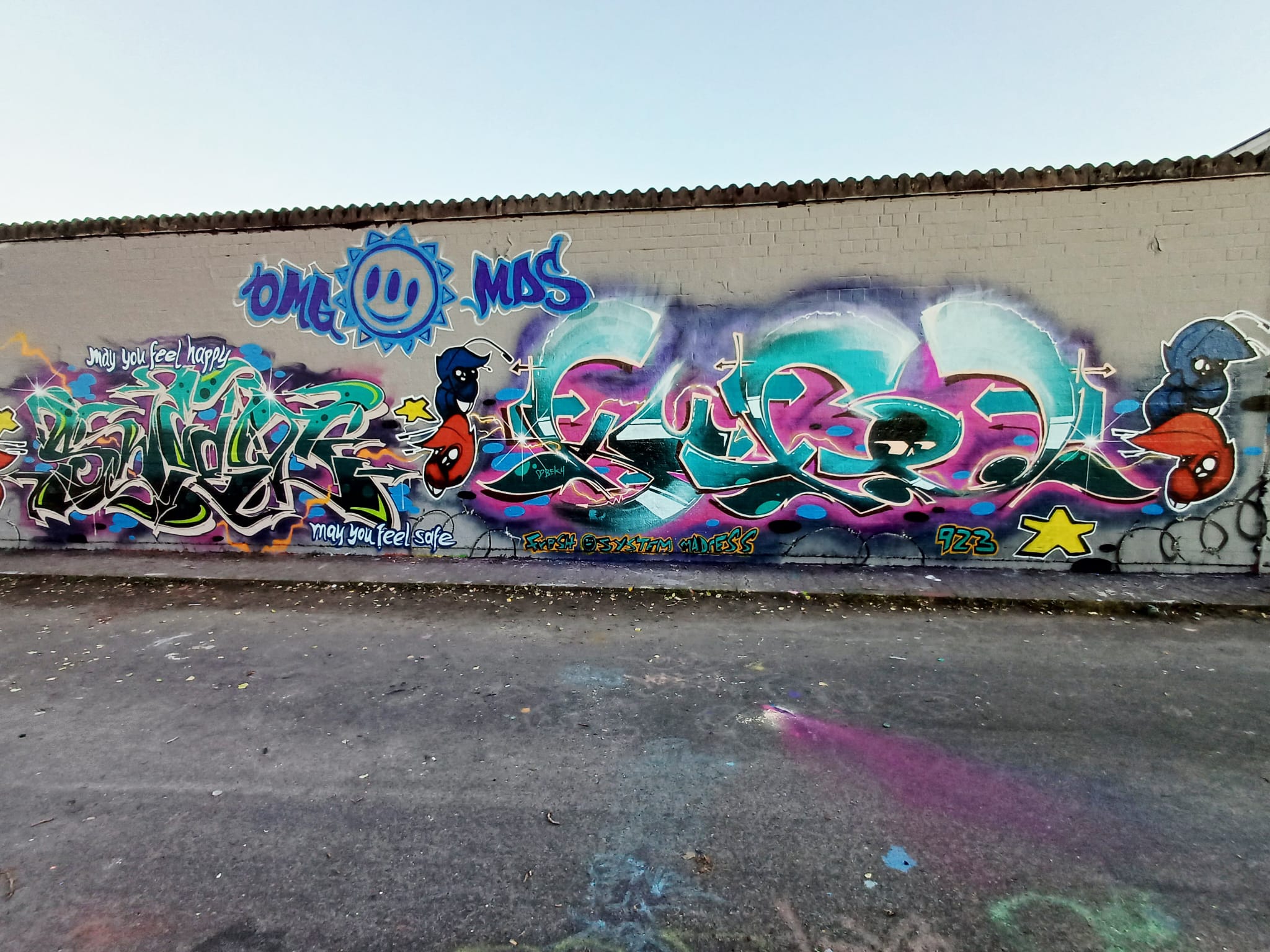 The characters on the left and the right were made by LEFTONE, the graffiti on the left is from MONKEE, the circle in the middle is from NEW 3RD EYE MOVEMENT and the graffiti on the right is from HEMA79.