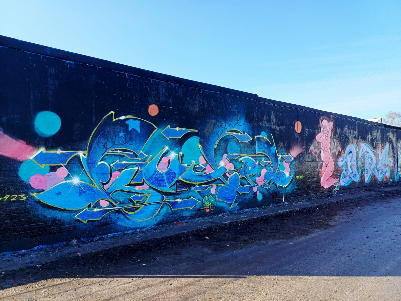 The graffiti on the left is from DEJOE and the artworks on the right were made by the artist duo 2BNDTZ, consisting of CRÜML and KRÜML.