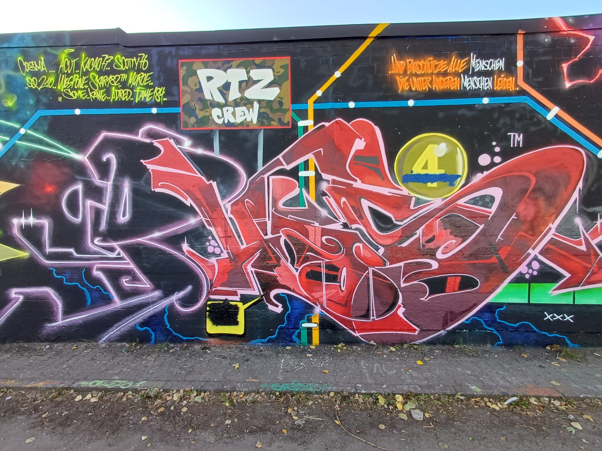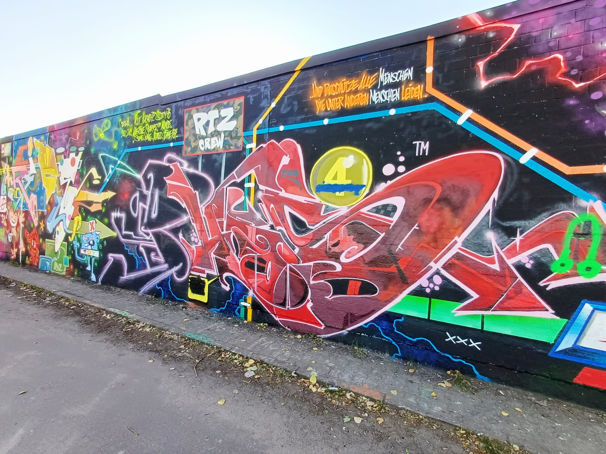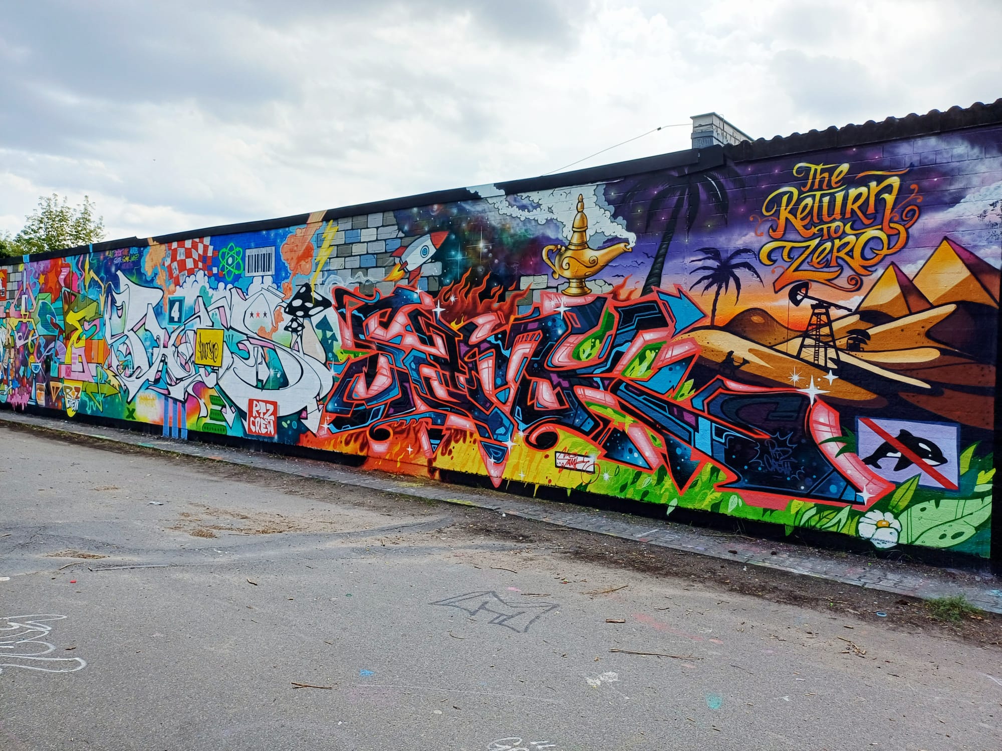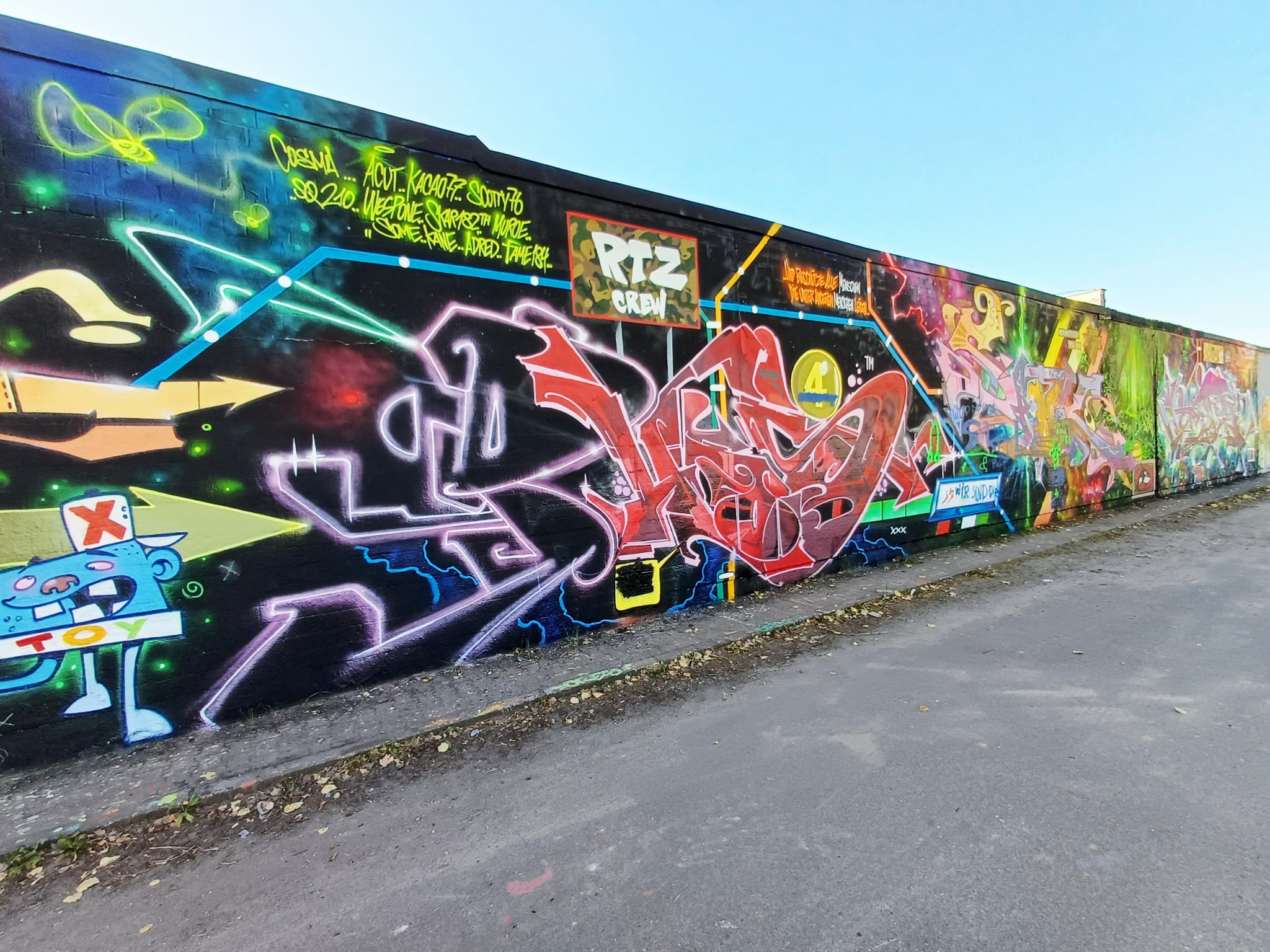 This awesome graffiti wall was painted during the Father’s Day Jam on 26th May 2022. In between there is an artwork integrated into the wall by HOOMS and LEFT which they created at a previous spray session. The artworks from left to right were made by REK 53, SOUND, SAMK, MYA, HOOMS & LEFT (from previous event), HOOMS, AMSPEAR PEEKOPS, LEFT, ACKO.