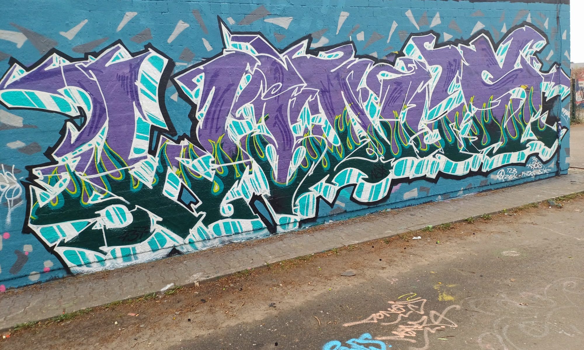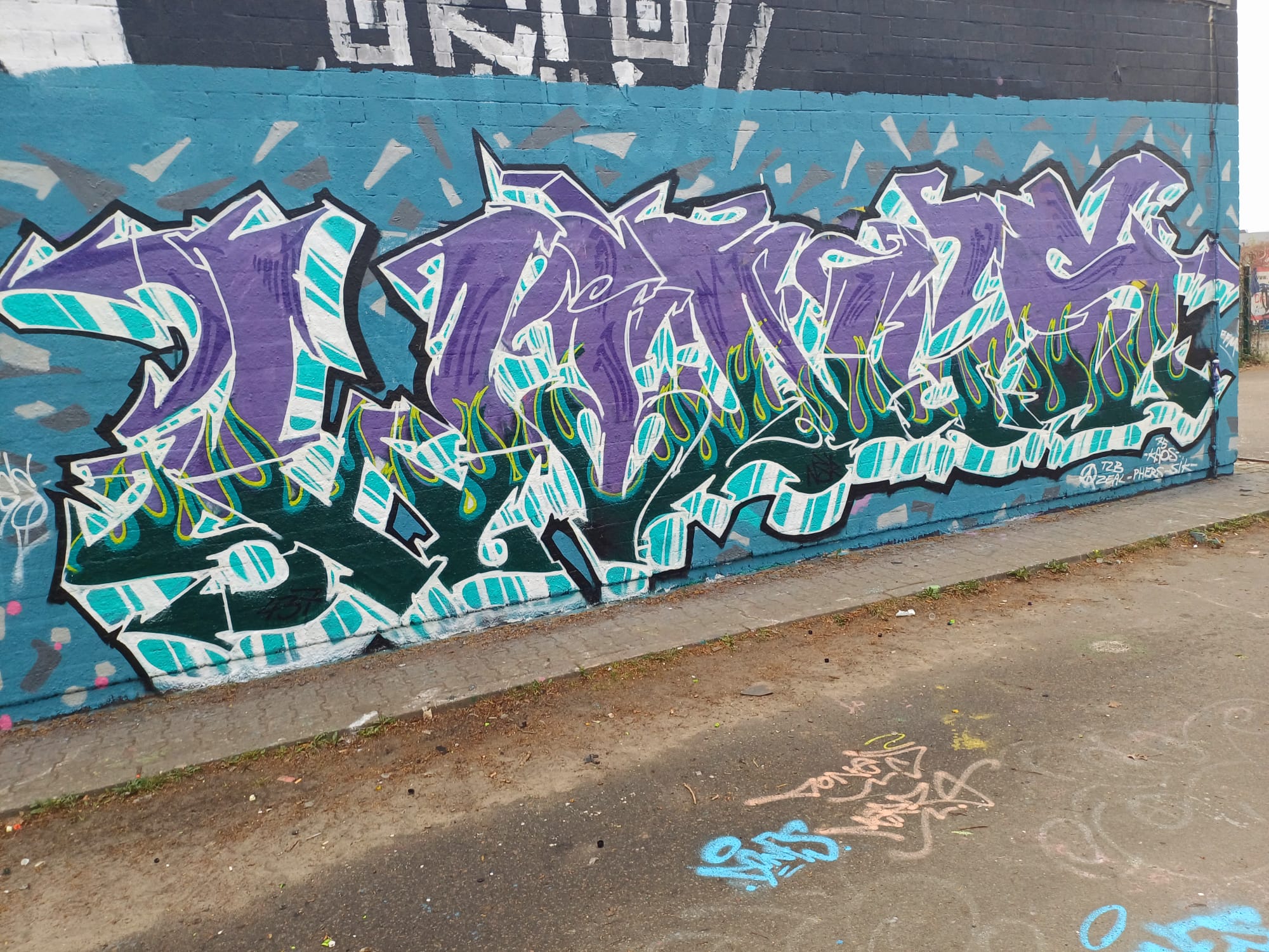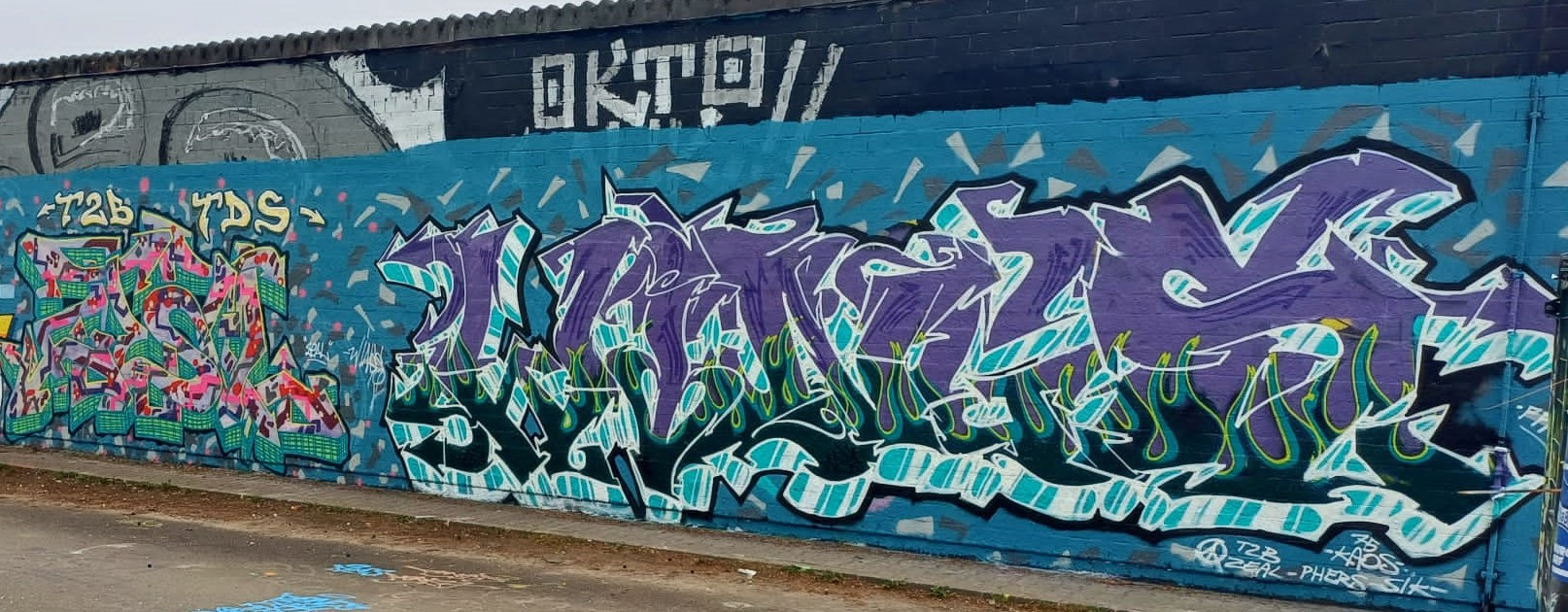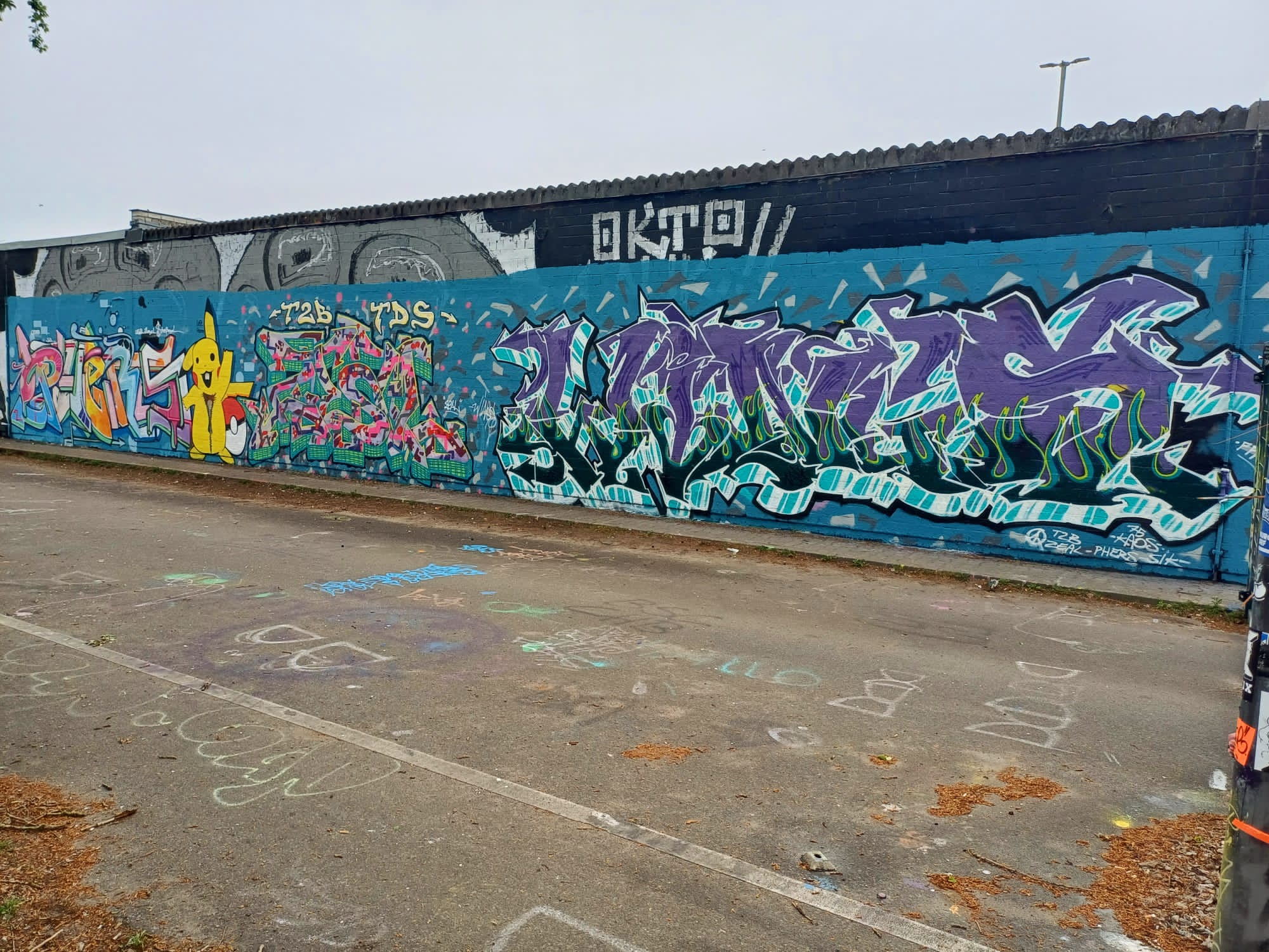 The graffiti on the far left is from PHERS, the Pikachu was made by LEFT and the following graffiti is from ZEAL