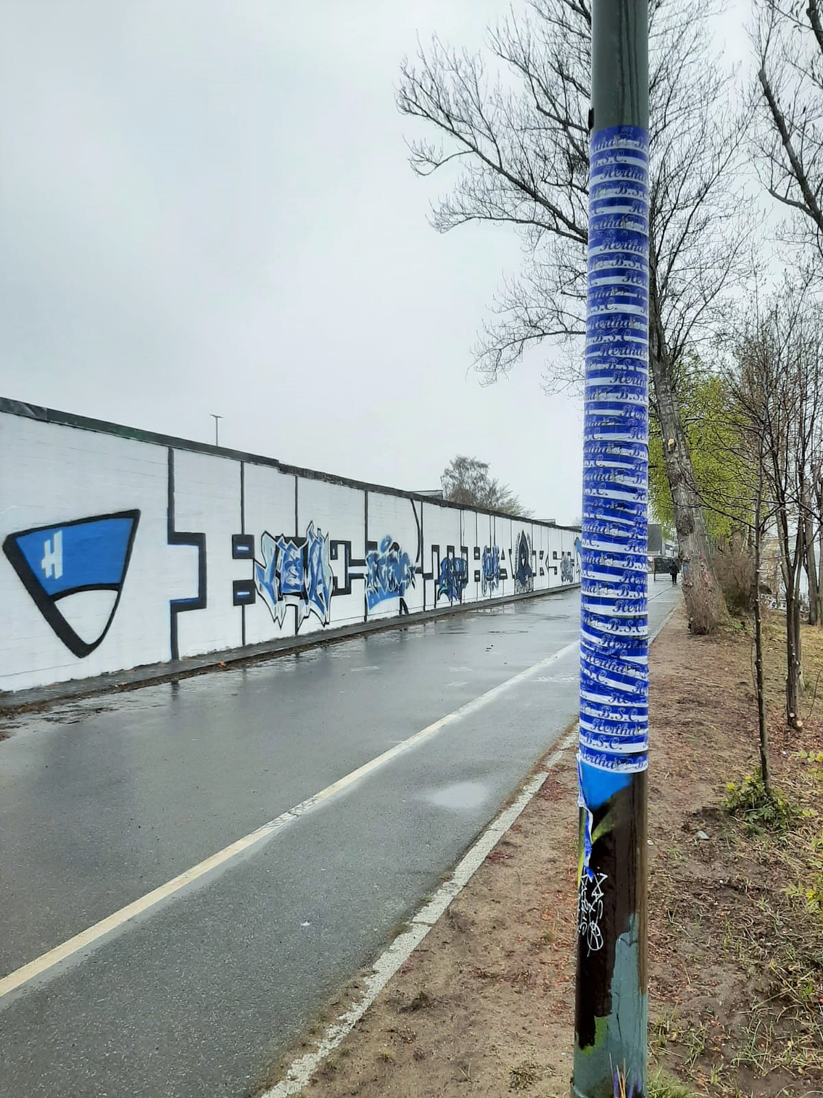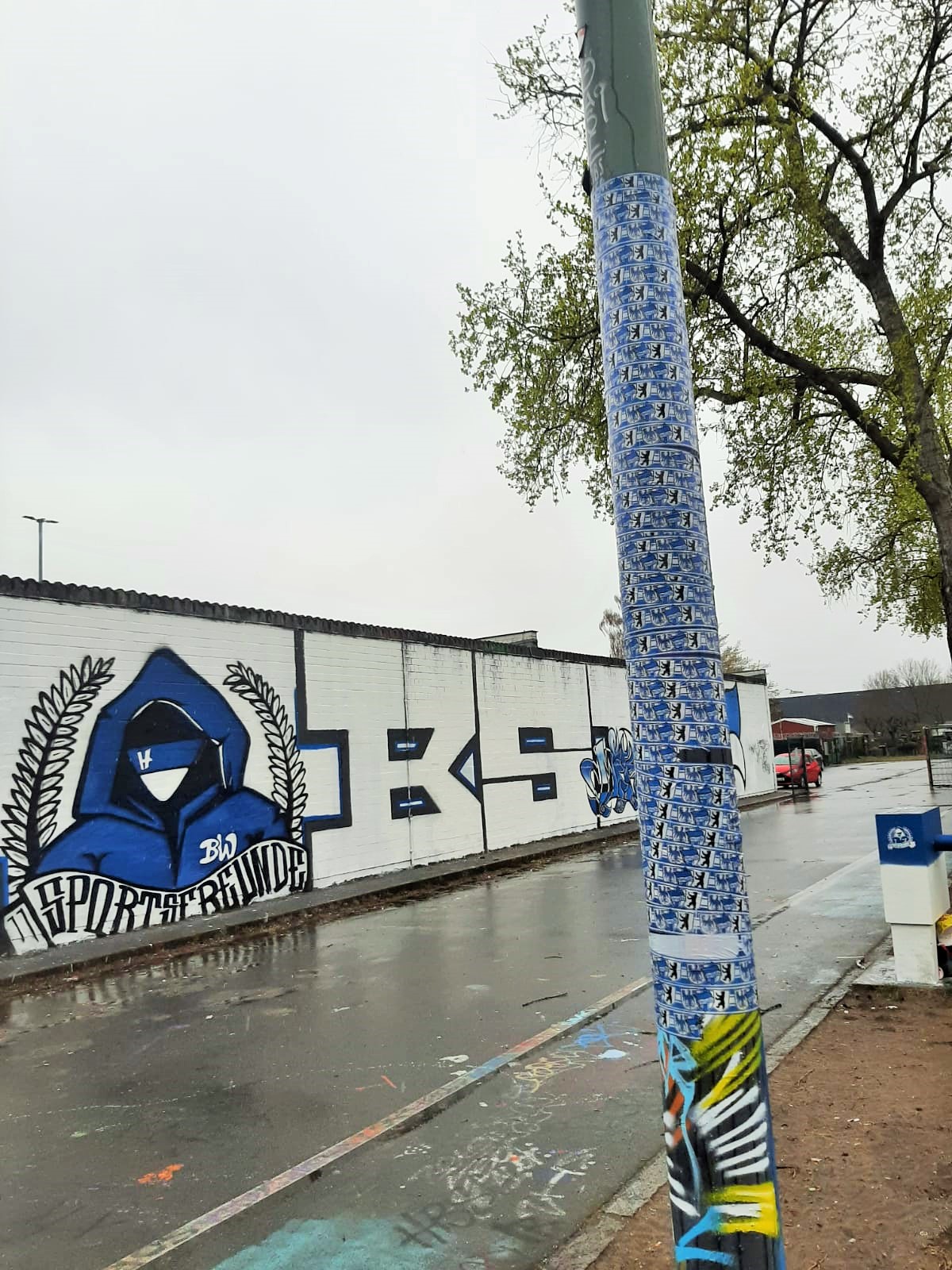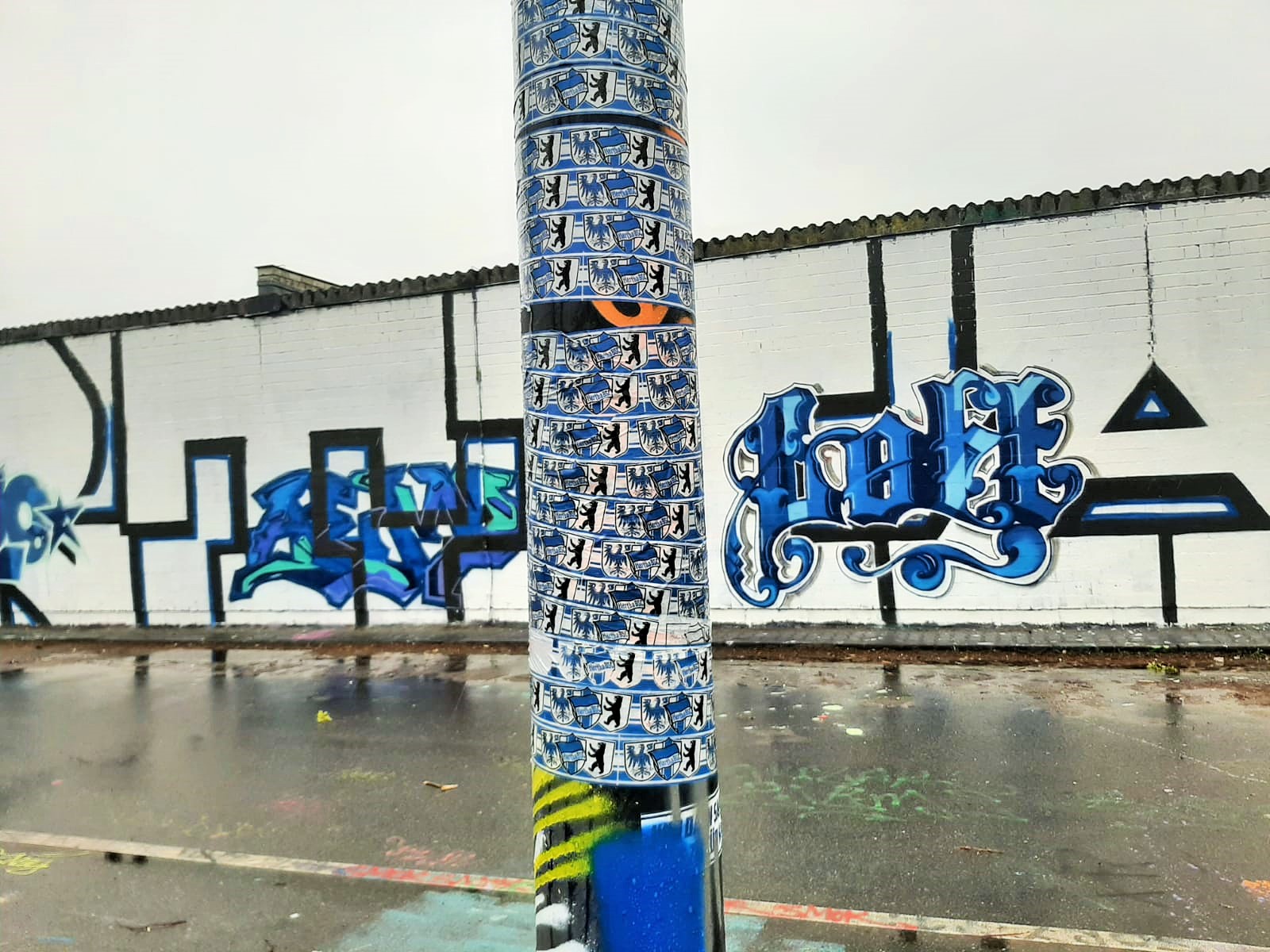 This derby tribute wall for the football club Hertha BSC was created by the artists HEMA, MYROK, REENO, TENBEATZ and LEFTONE with their individual works. The huge letters they did all together. As well the surrounding recieved some fan merchandize decoration by the SPORTSFREUNDE BW20. Also during the spray session the Berlin Rapper MC BOGY visited the artists and left his tag.