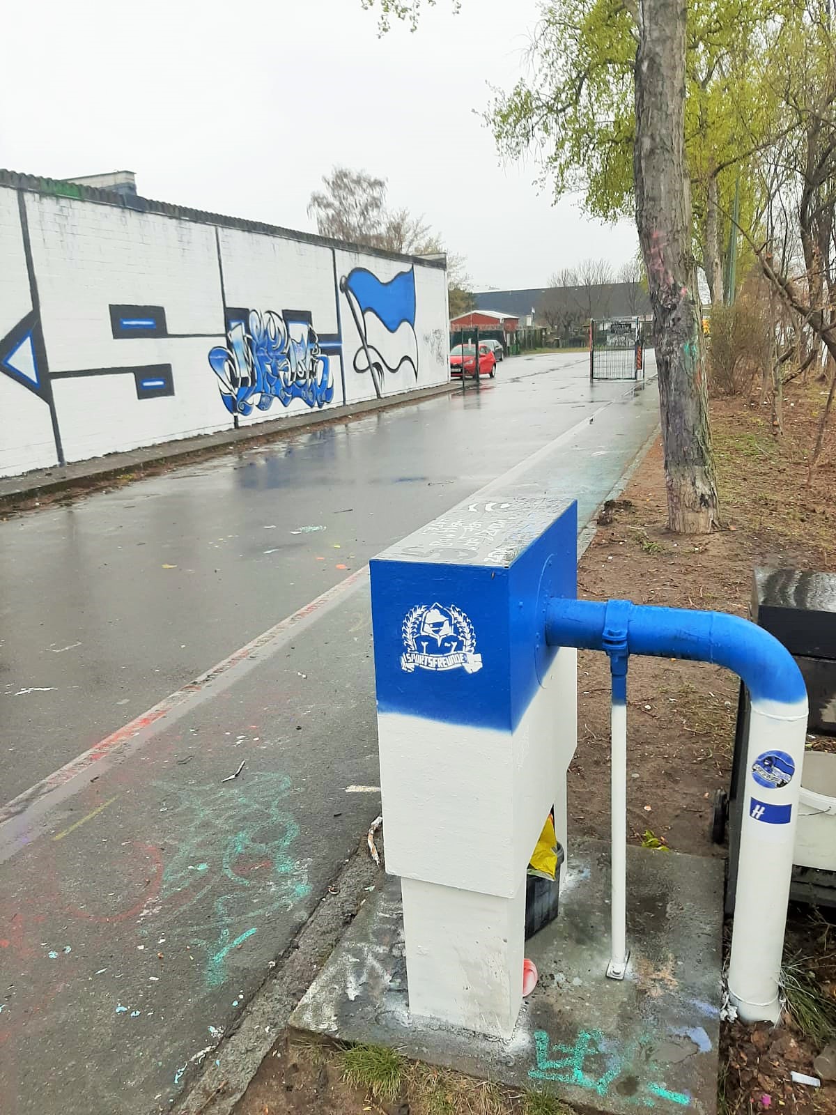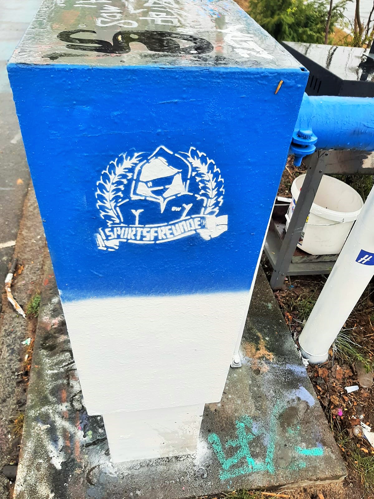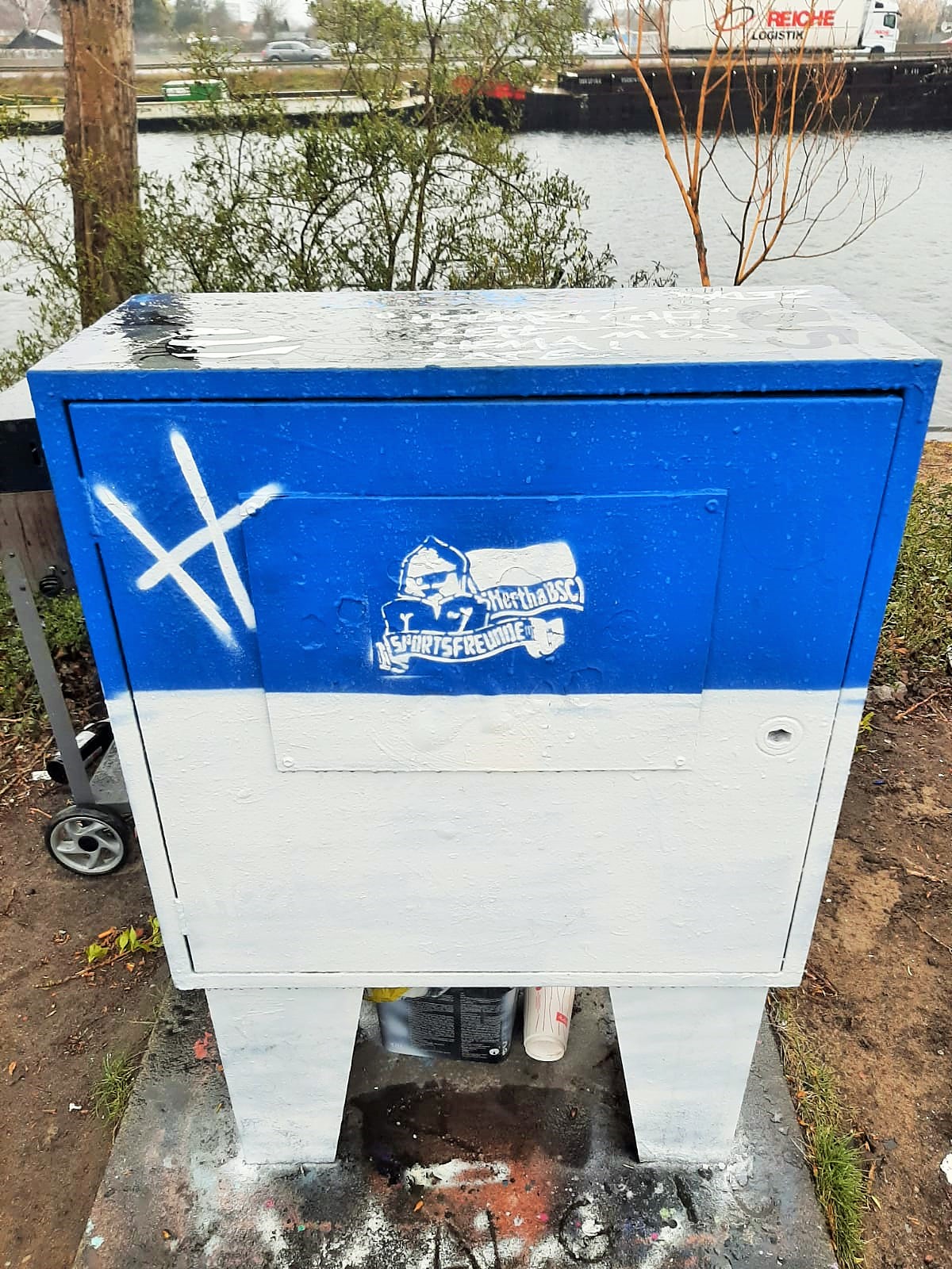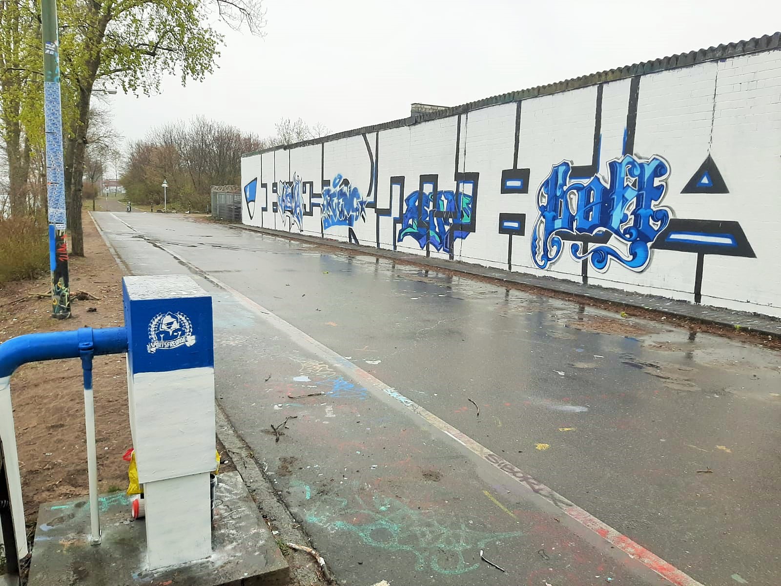 This derby tribute wall for the football club Hertha BSC was created by the artists HEMA, MYROK, REENO, TENBEATZ and LEFTONE with their individual works. The huge letters they did all together. As well the surrounding recieved some fan merchandize decoration by the SPORTSFREUNDE BW20. Also during the spray session the Berlin Rapper MC BOGY visited the artists and left his tag.