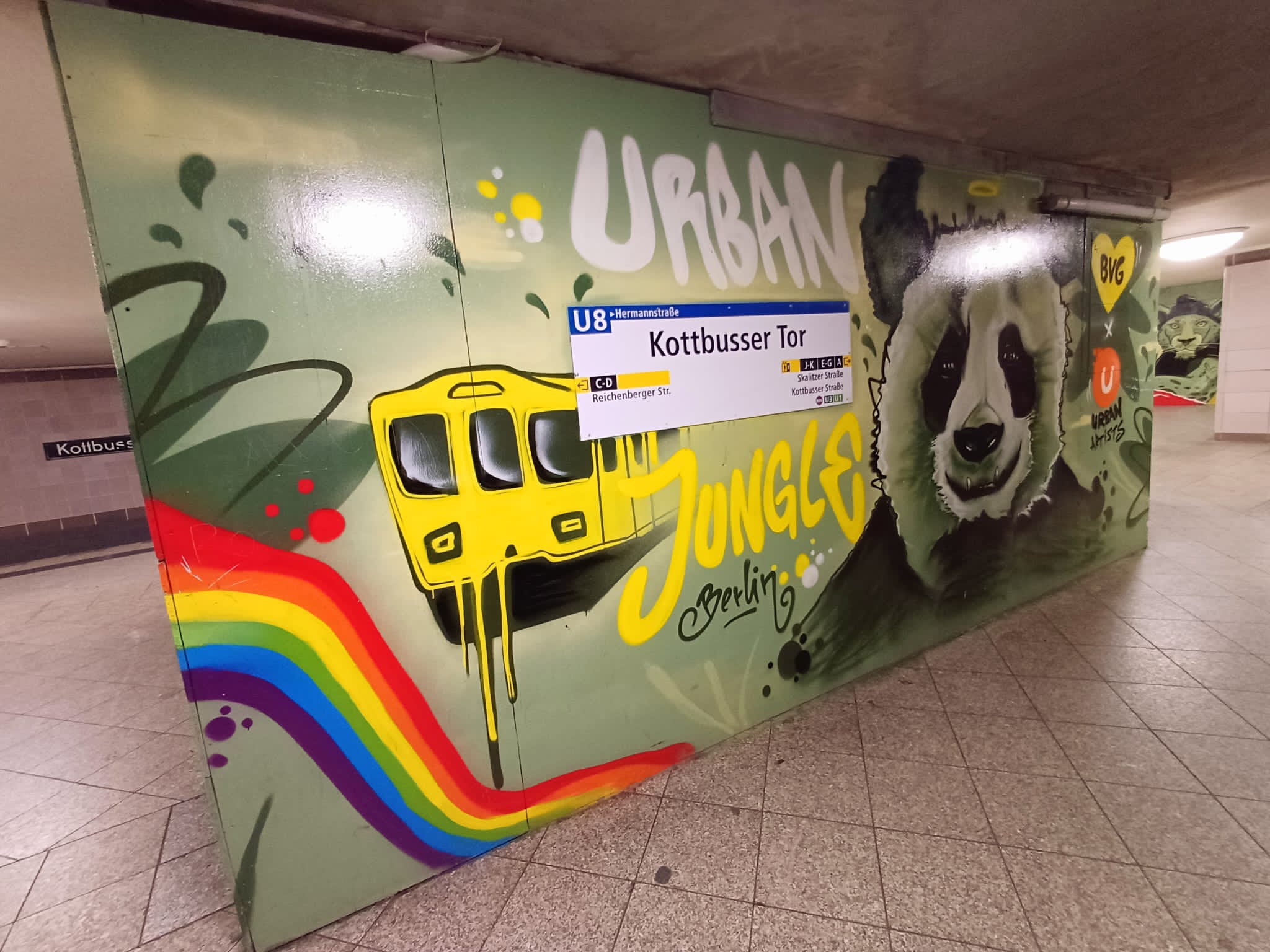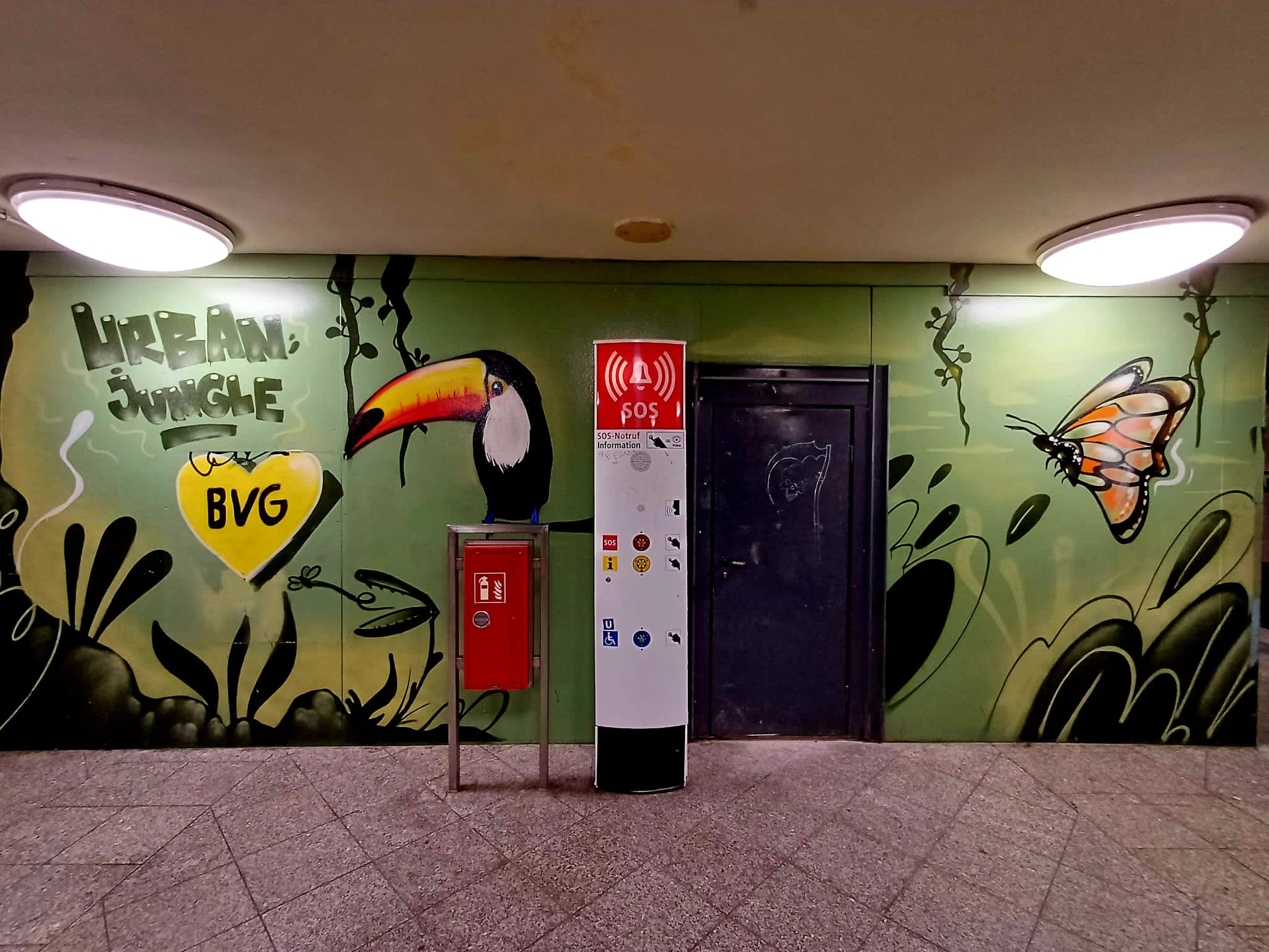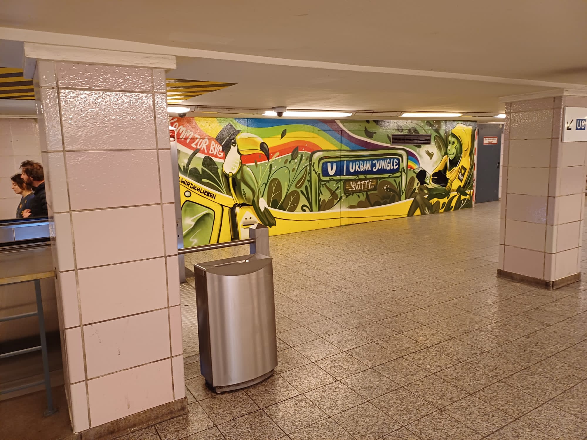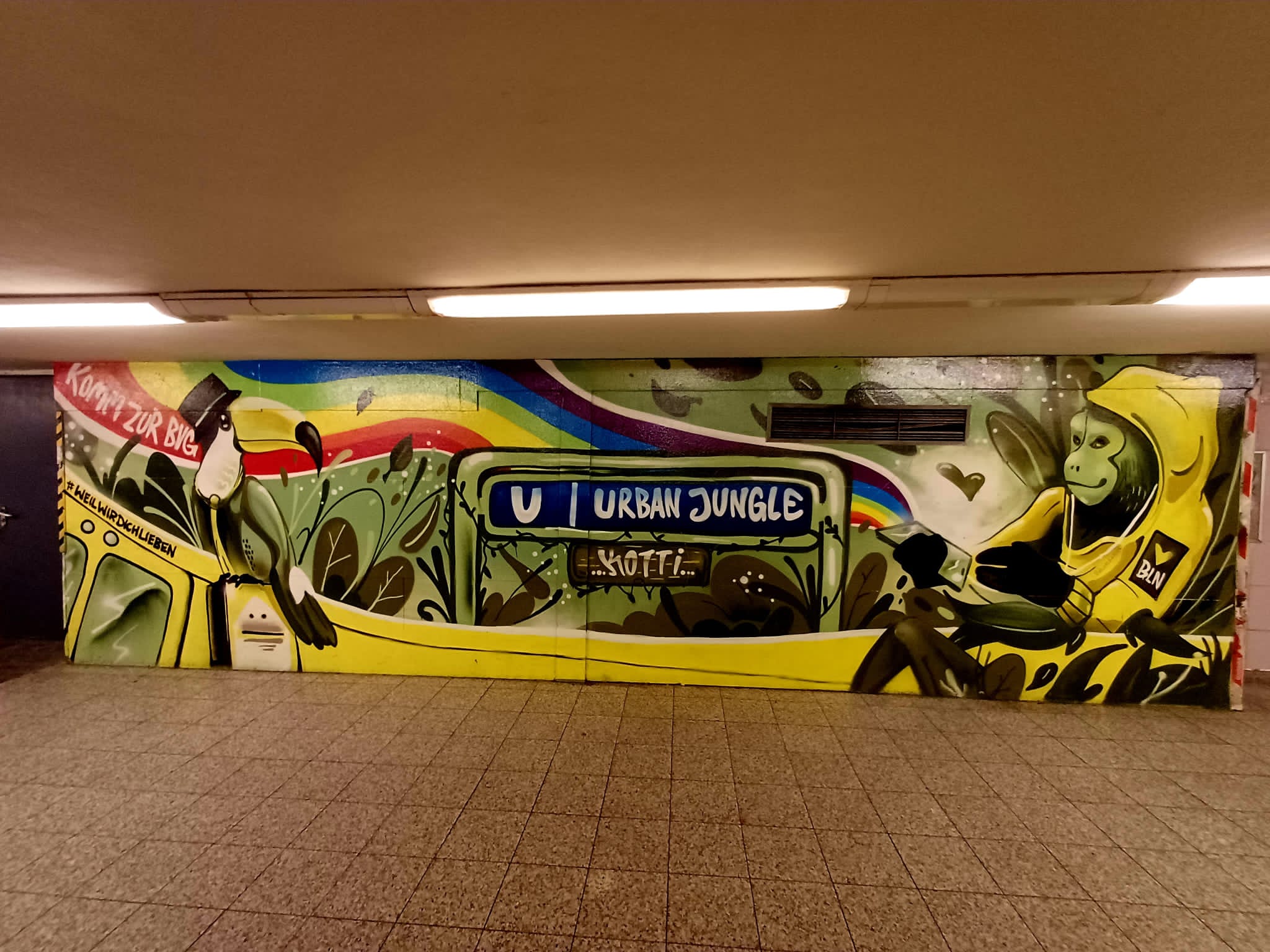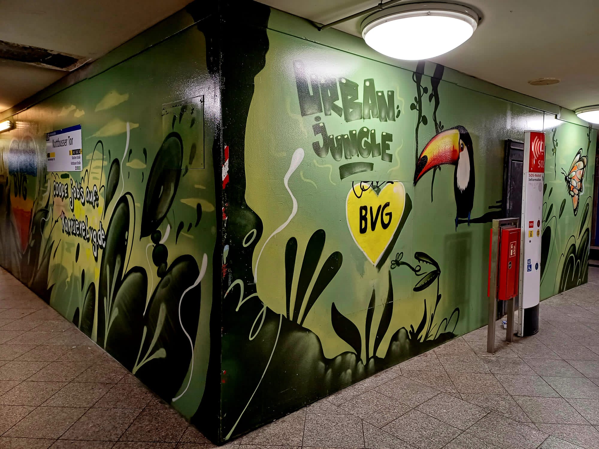 The Kottbusser Tor train station consists of several levels and floors, which were colorfully designed by the artist collective URBAN ARTISTS BERLIN for the Berliner Verkehrsbetriebe (BVG), which is the local public transport department. There are several large-scale concept walls in various locations throughout the underground section which are themed and named „Urban Jungle“.