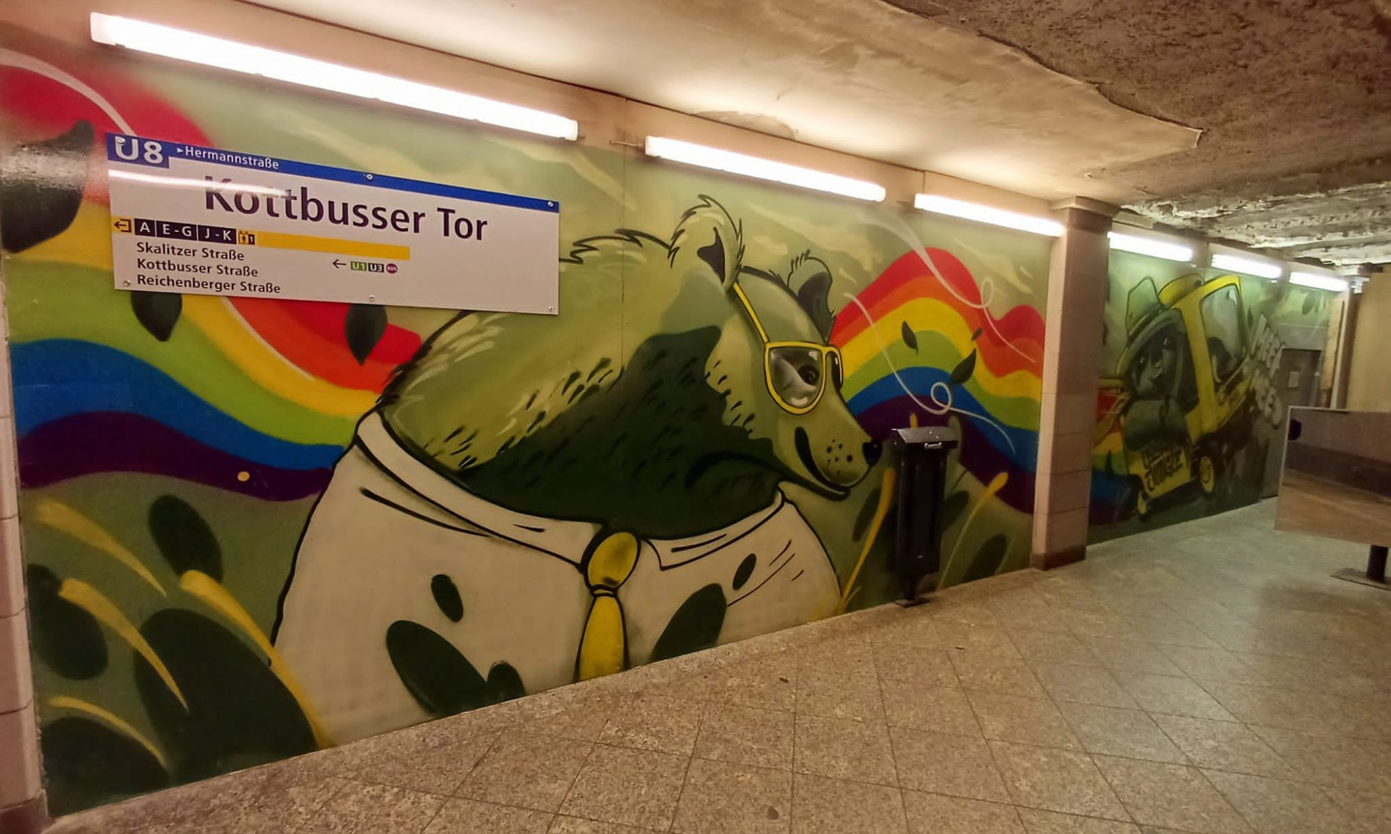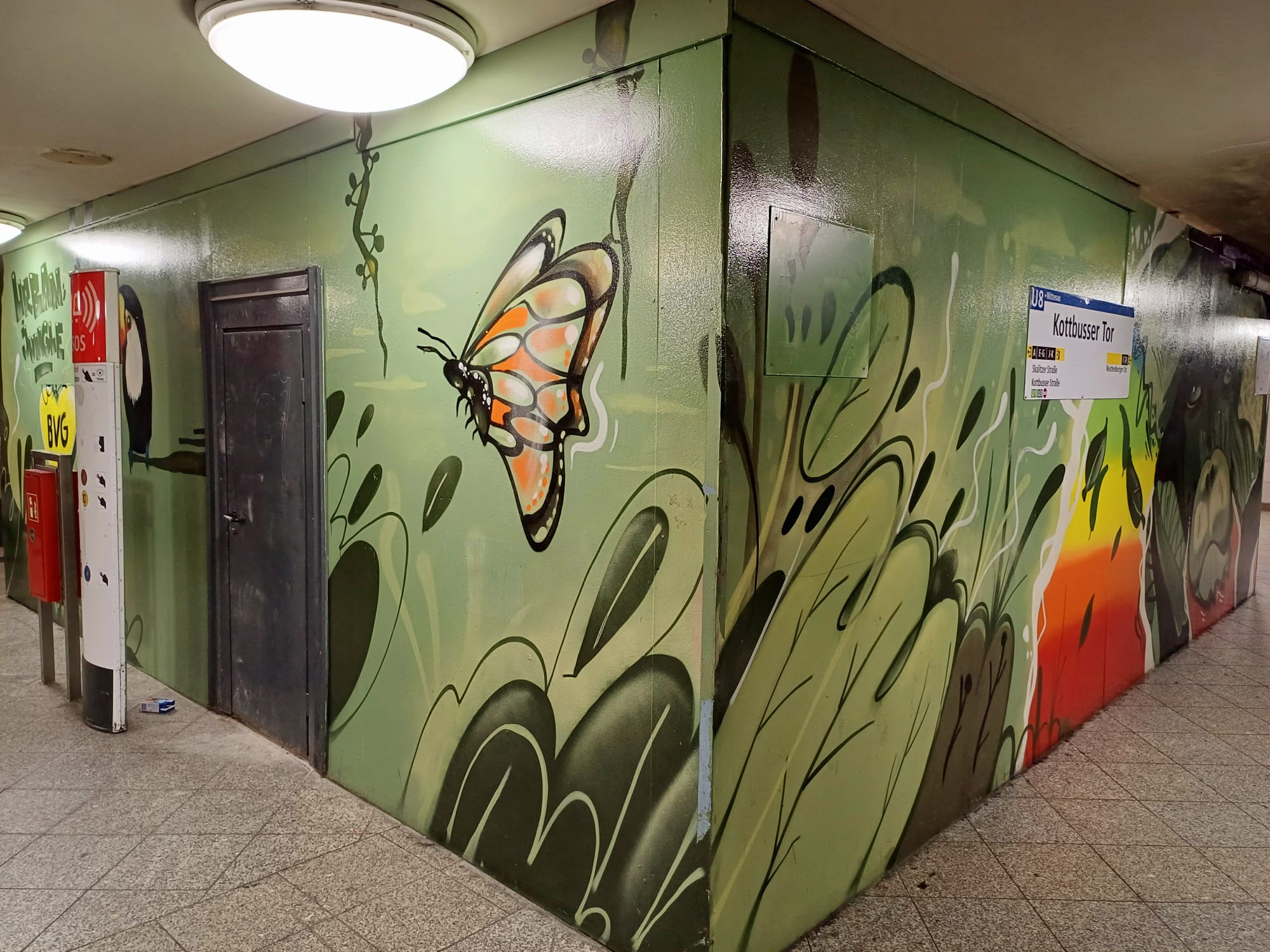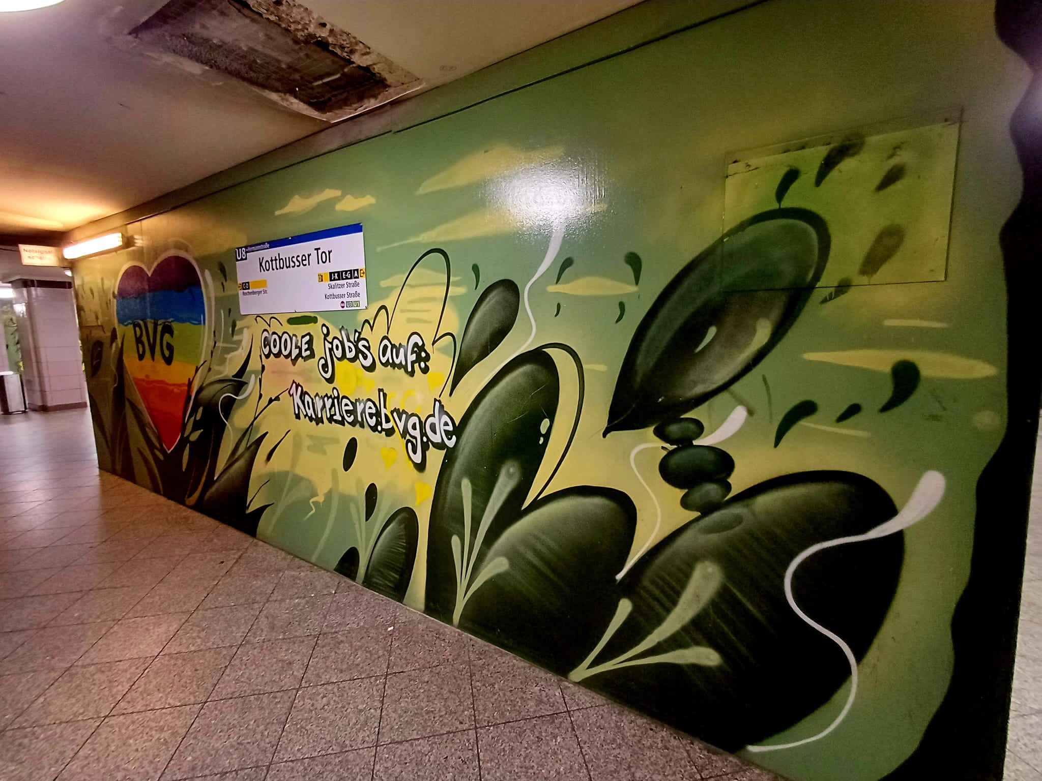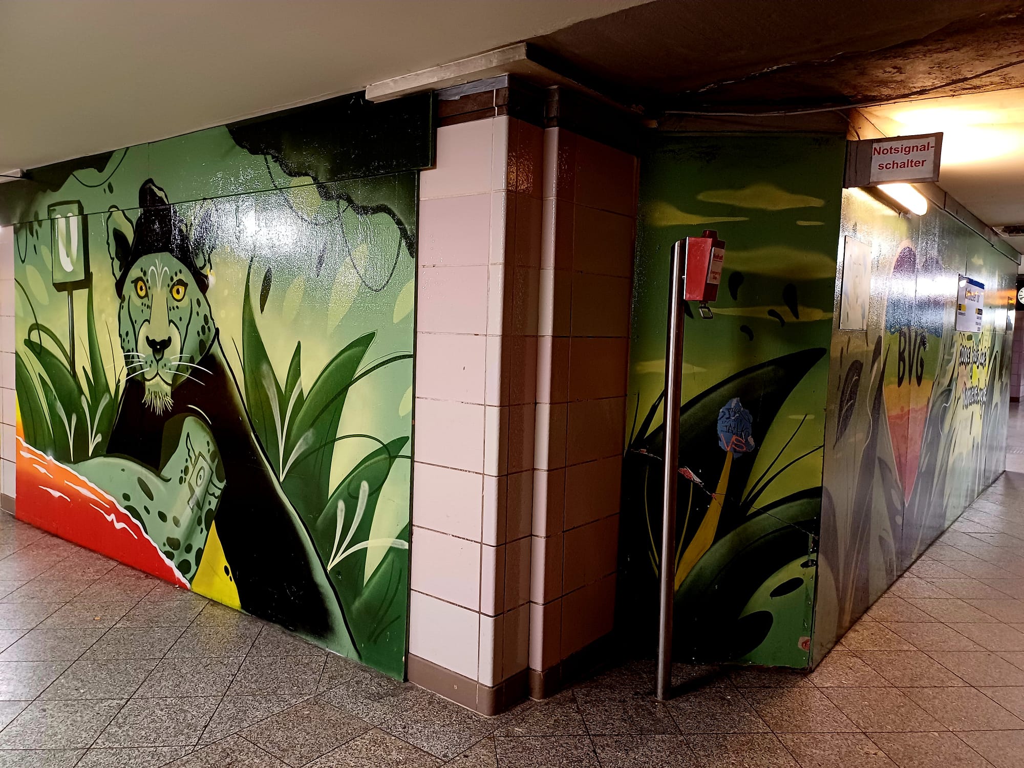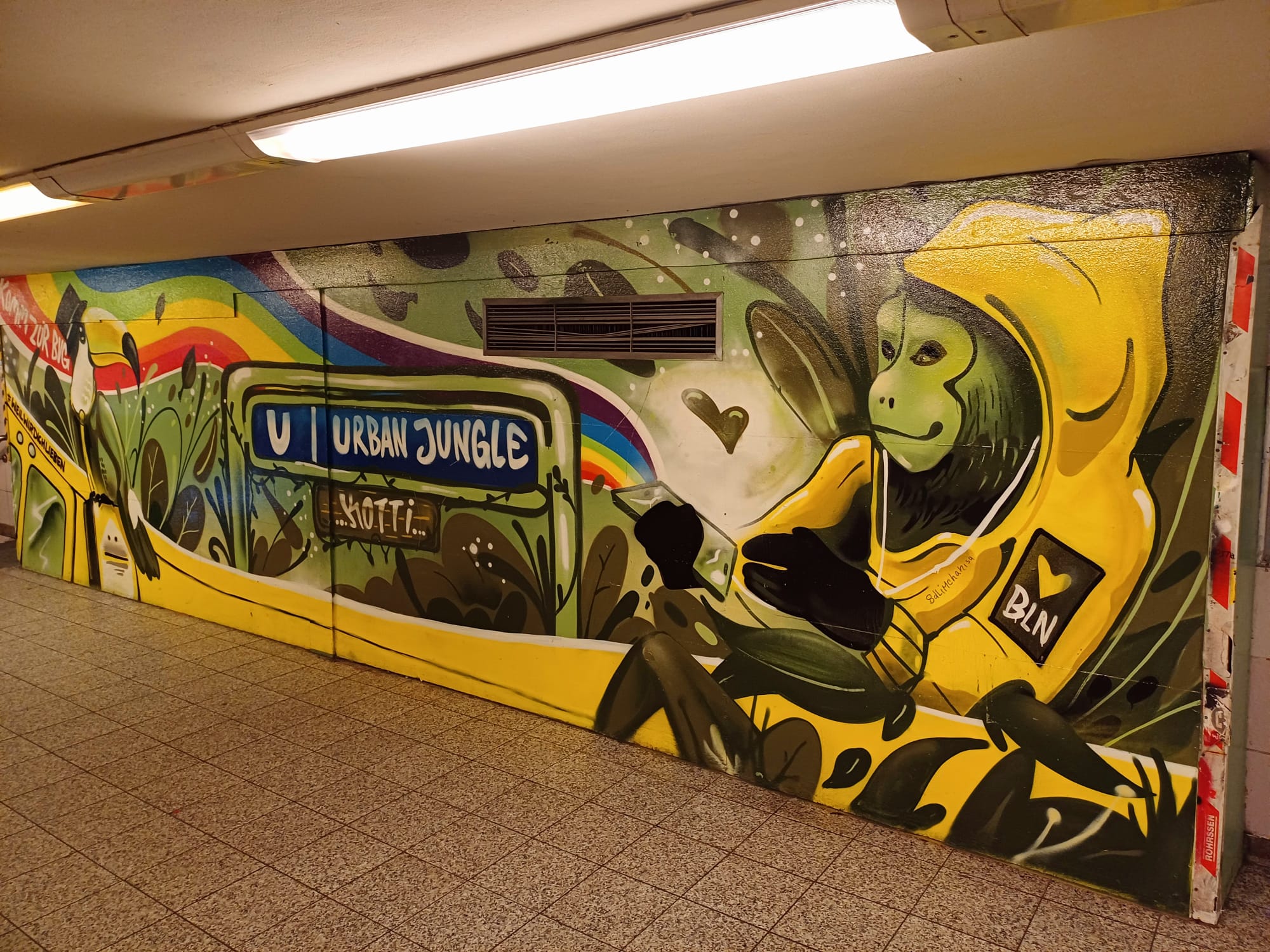 The Kottbusser Tor train station consists of several levels and floors, which were colorfully designed by the artist collective URBAN ARTISTS BERLIN for the Berliner Verkehrsbetriebe (BVG), which is the local public transport department. There are several large-scale concept walls in various locations throughout the underground section which are themed and named „Urban Jungle“.