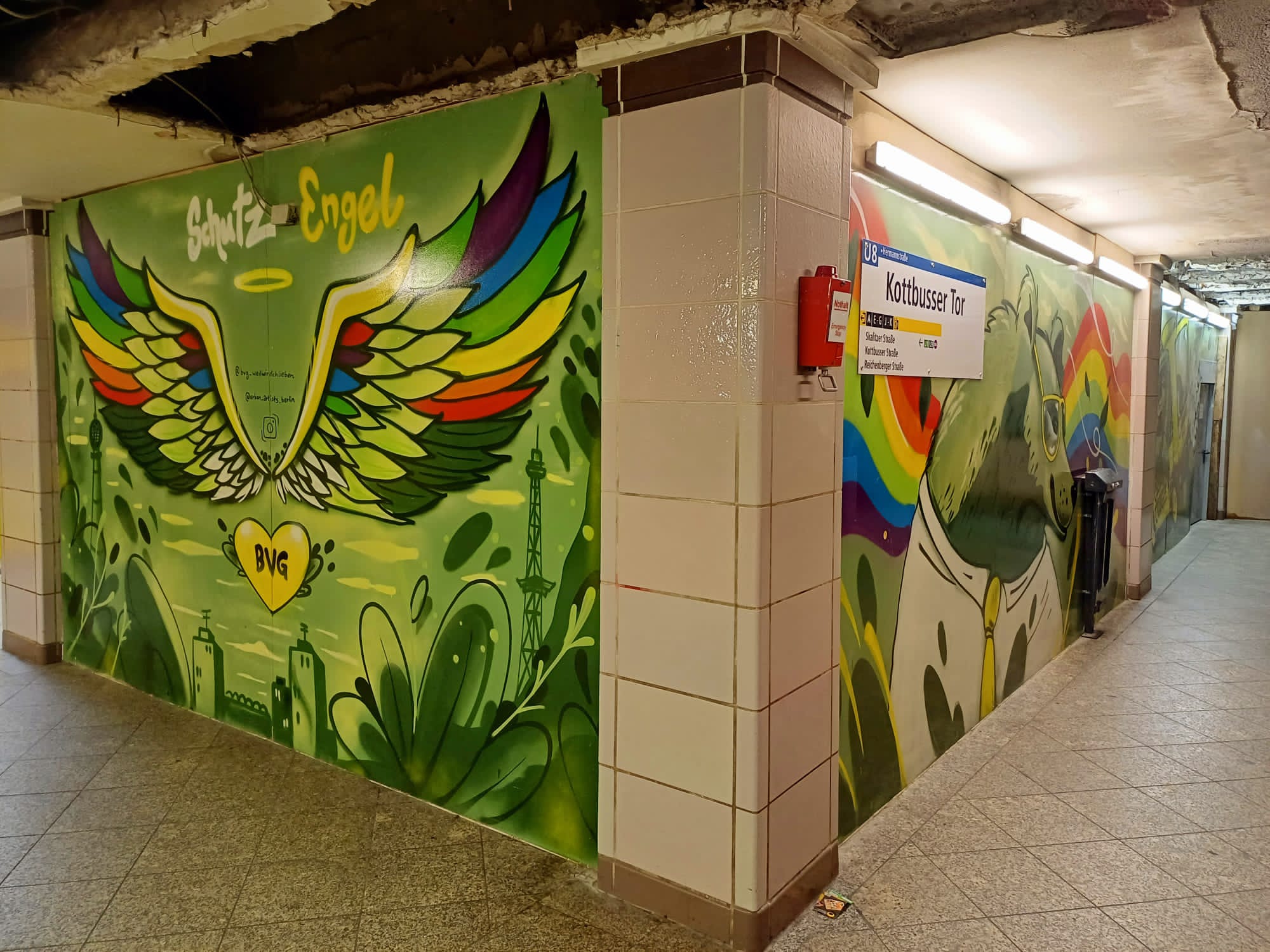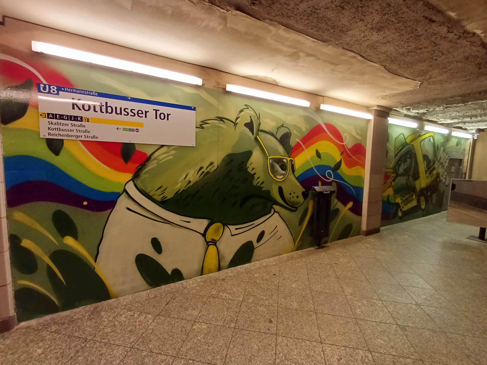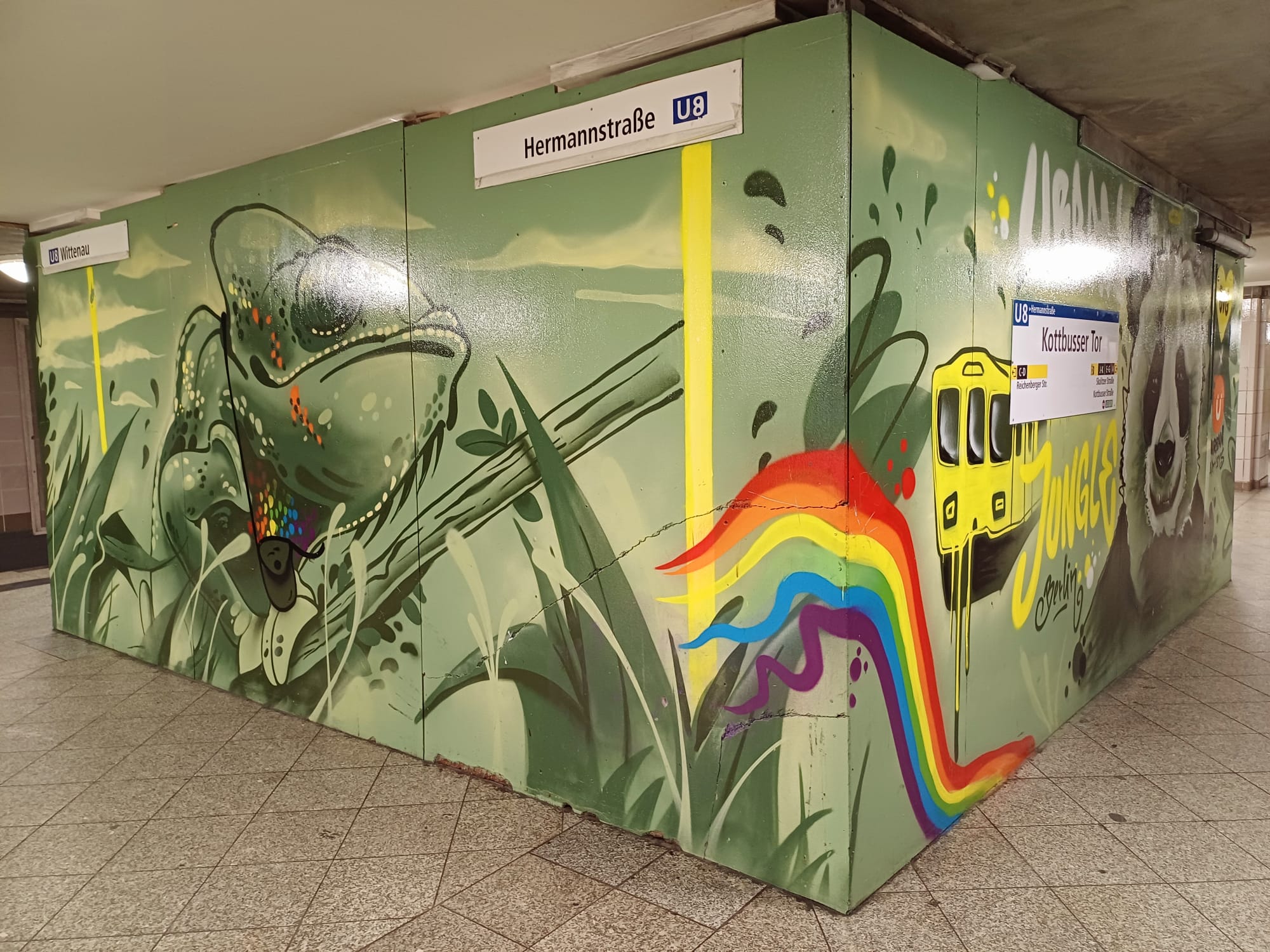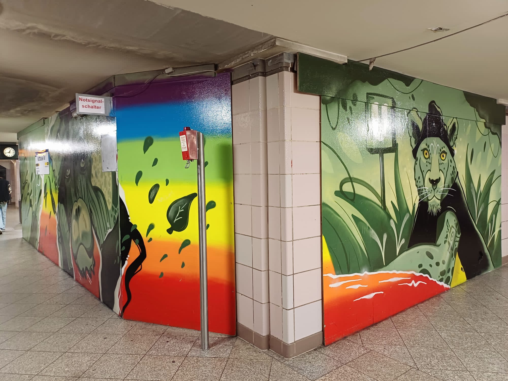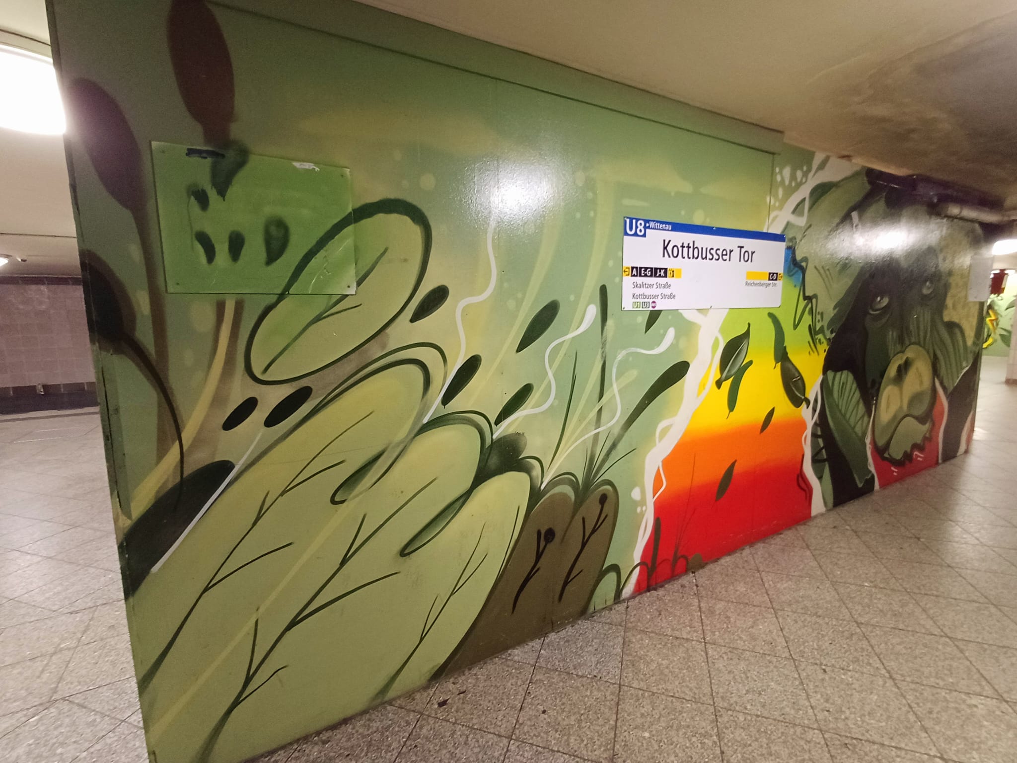 The Kottbusser Tor train station consists of several levels and floors, which were colorfully designed by the artist collective URBAN ARTISTS BERLIN for the Berliner Verkehrsbetriebe (BVG), which is the local public transport department. There are several large-scale concept walls in various locations throughout the underground section which are themed and named „Urban Jungle“.
