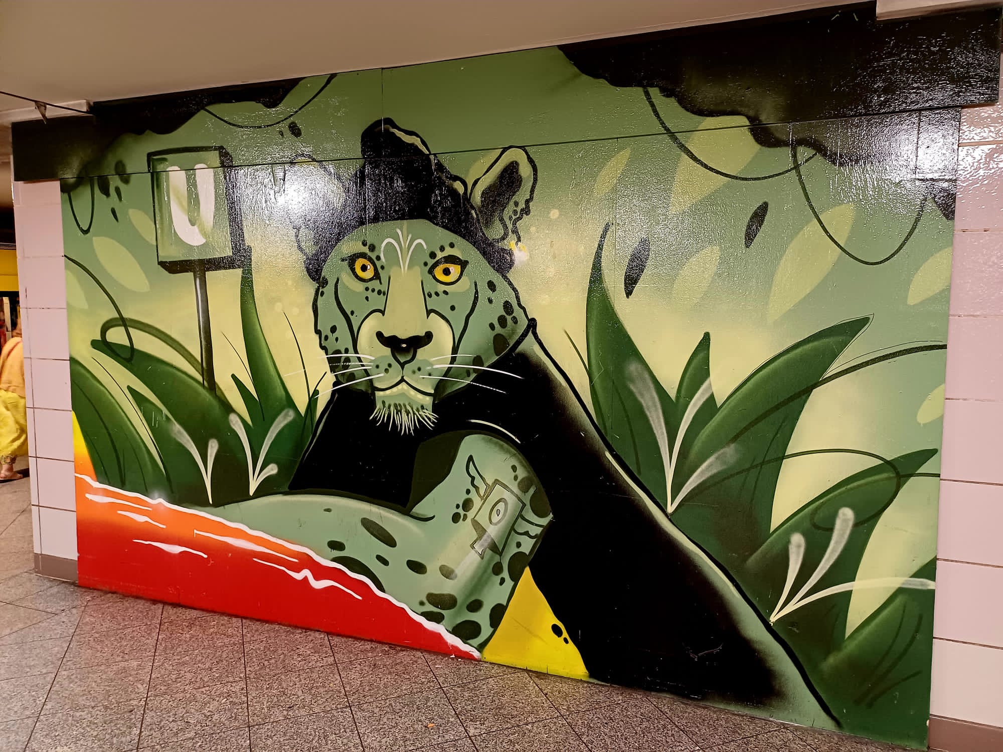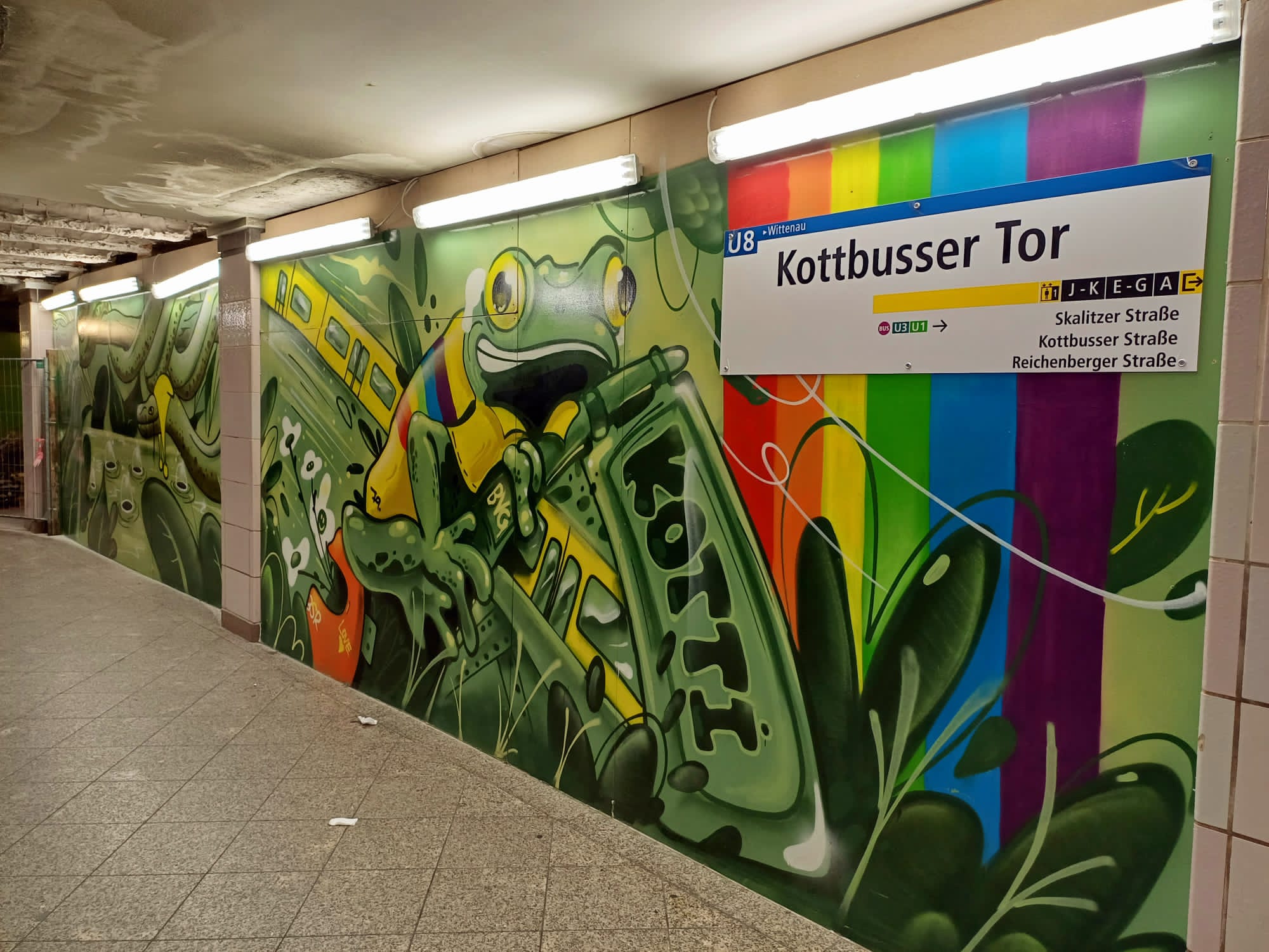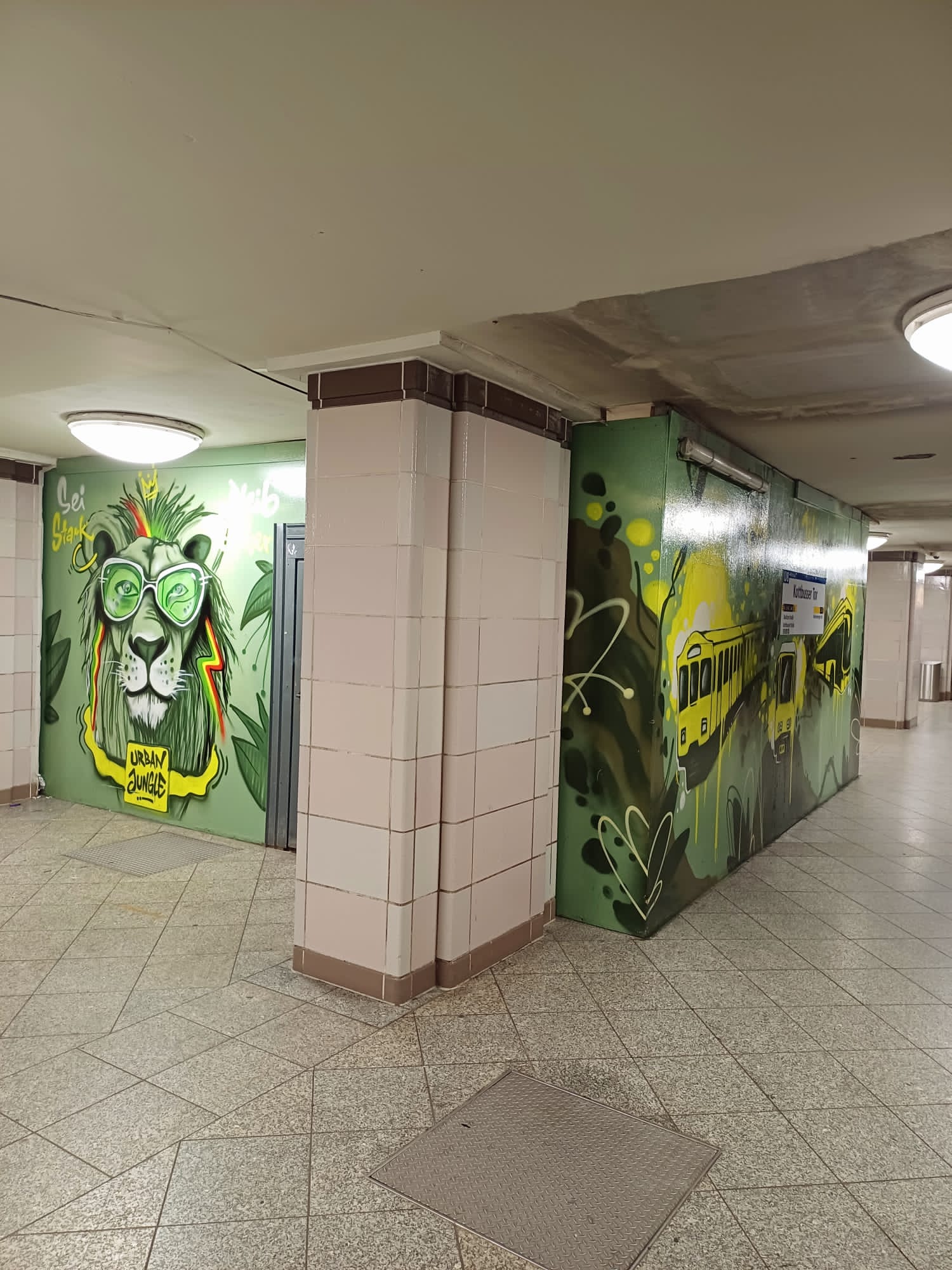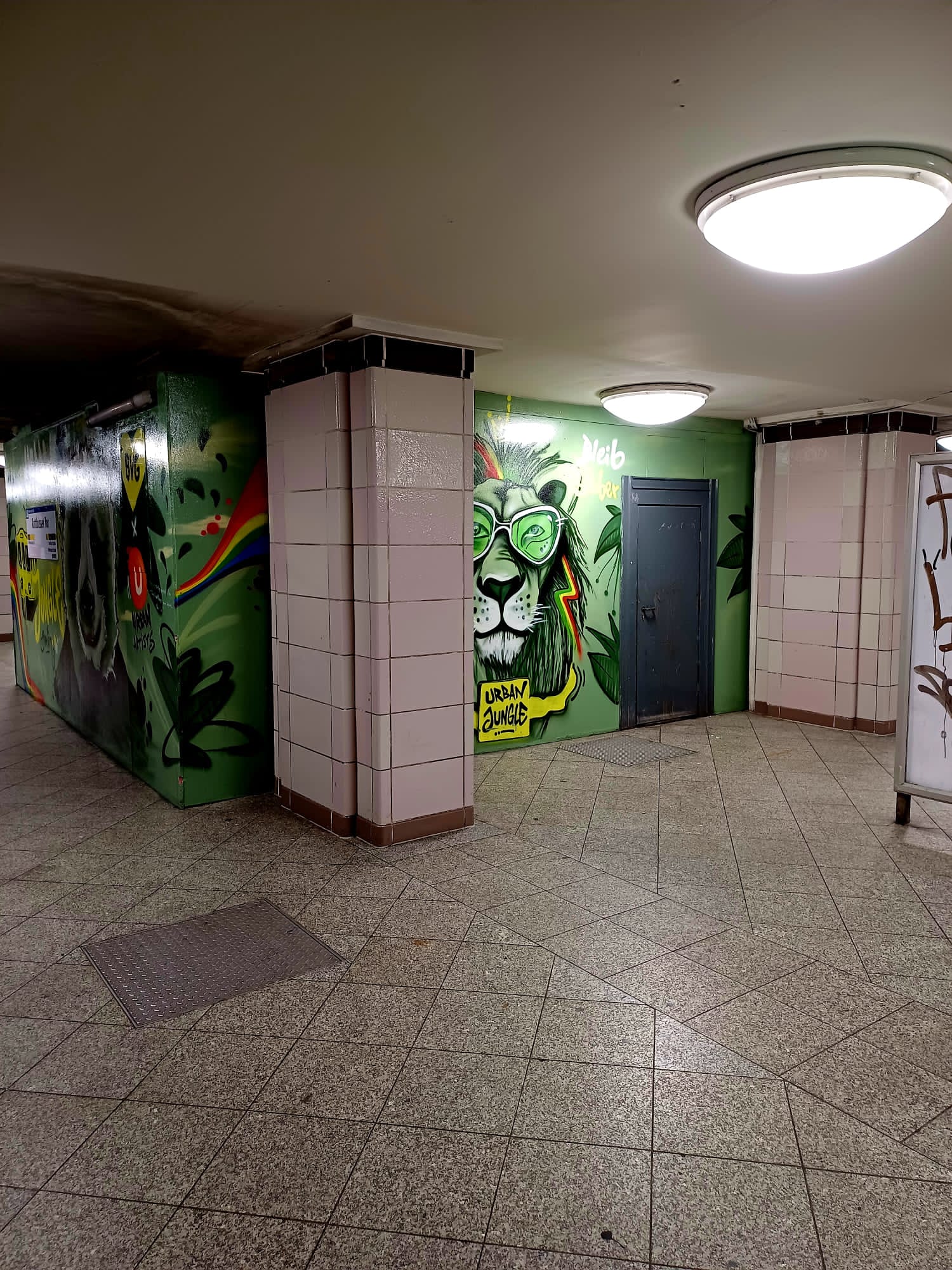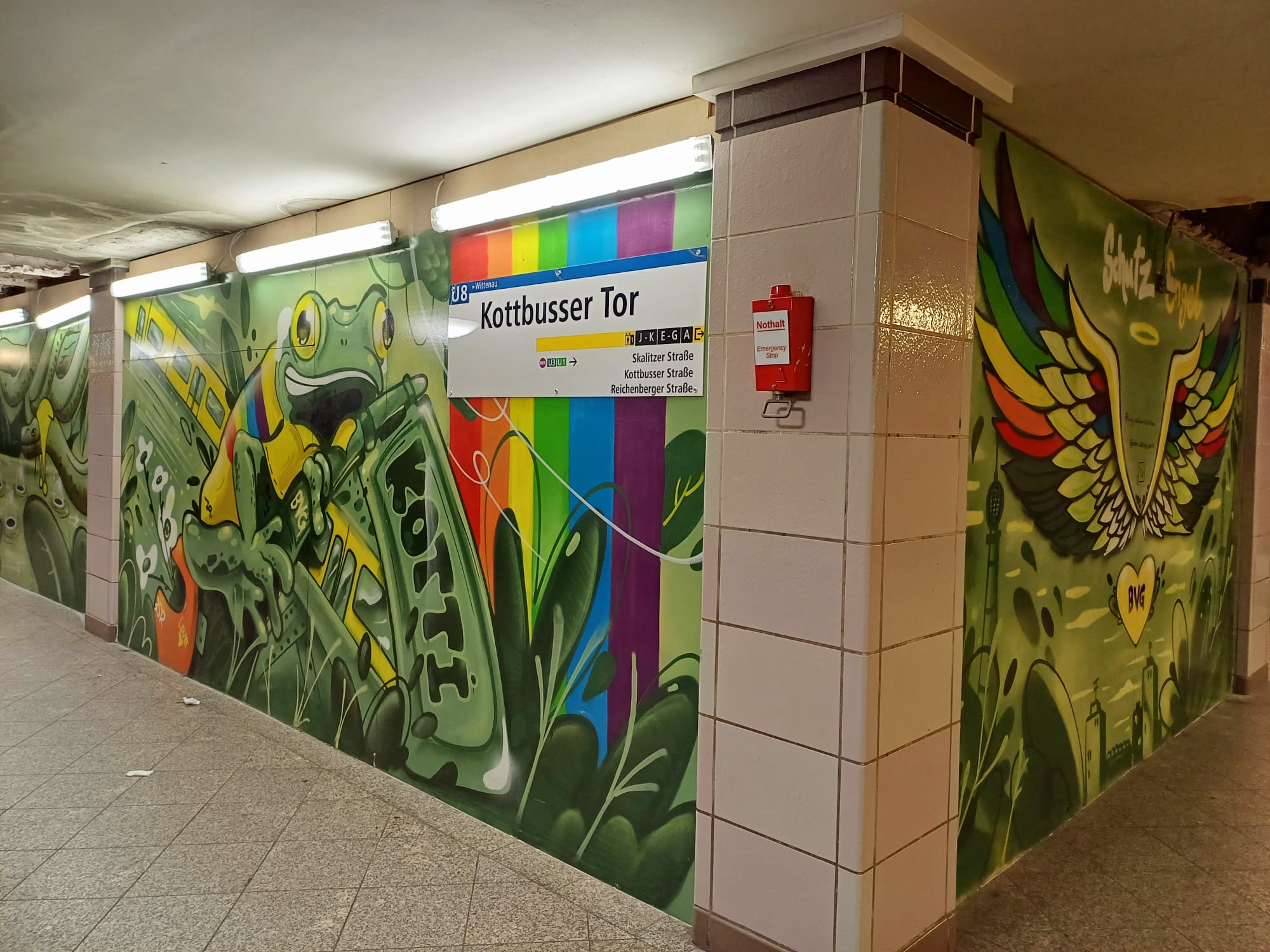 The Kottbusser Tor train station consists of several levels and floors, which were colorfully designed by the artist collective URBAN ARTISTS BERLIN for the Berliner Verkehrsbetriebe (BVG), which is the local public transport department. There are several large-scale concept walls in various locations throughout the underground section which are themed and named „Urban Jungle“.