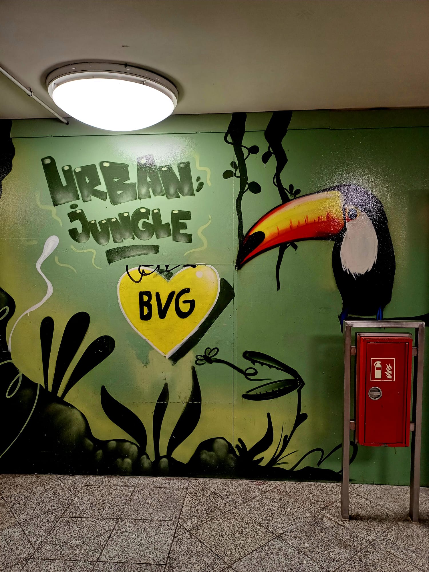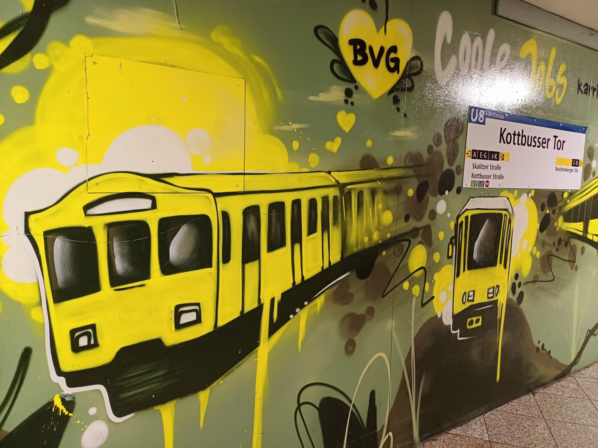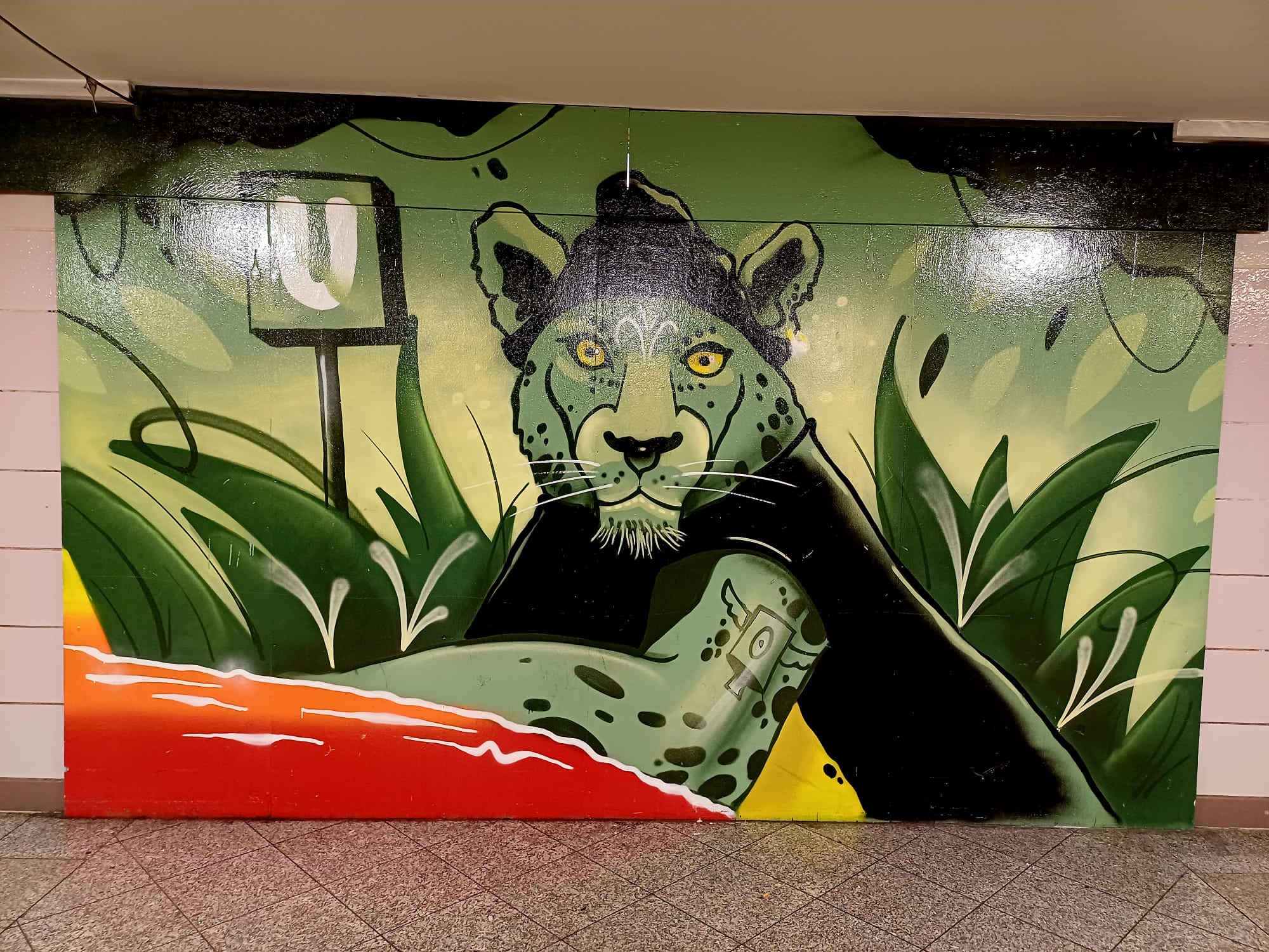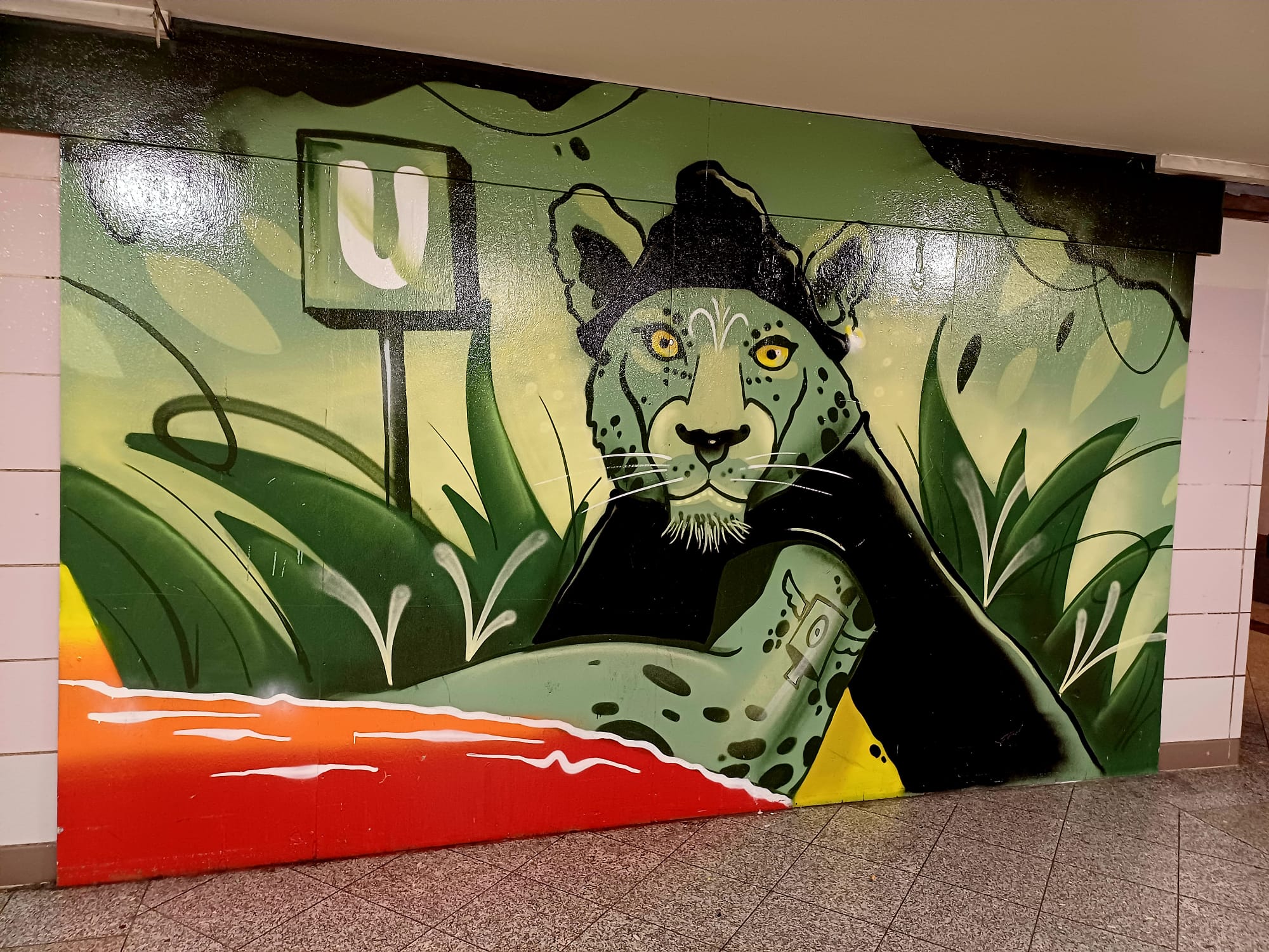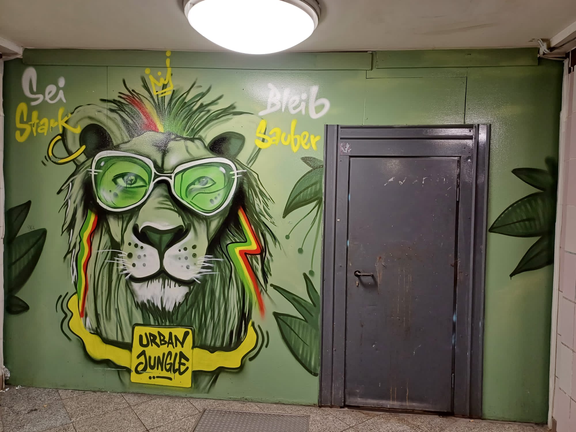 The Kottbusser Tor train station consists of several levels and floors, which were colorfully designed by the artist collective URBAN ARTISTS BERLIN for the Berliner Verkehrsbetriebe (BVG), which is the local public transport department. There are several large-scale concept walls in various locations throughout the underground section which are themed and named „Urban Jungle“.