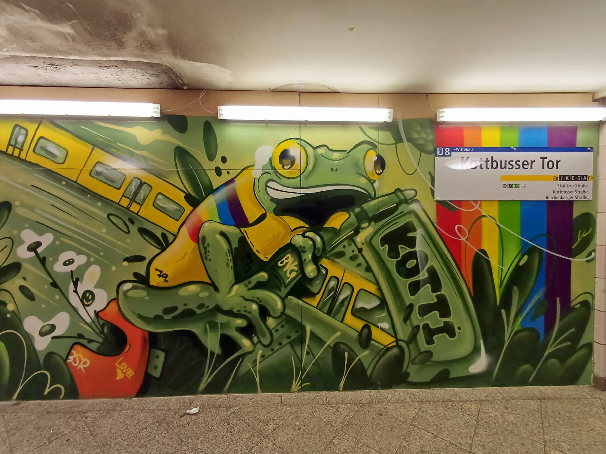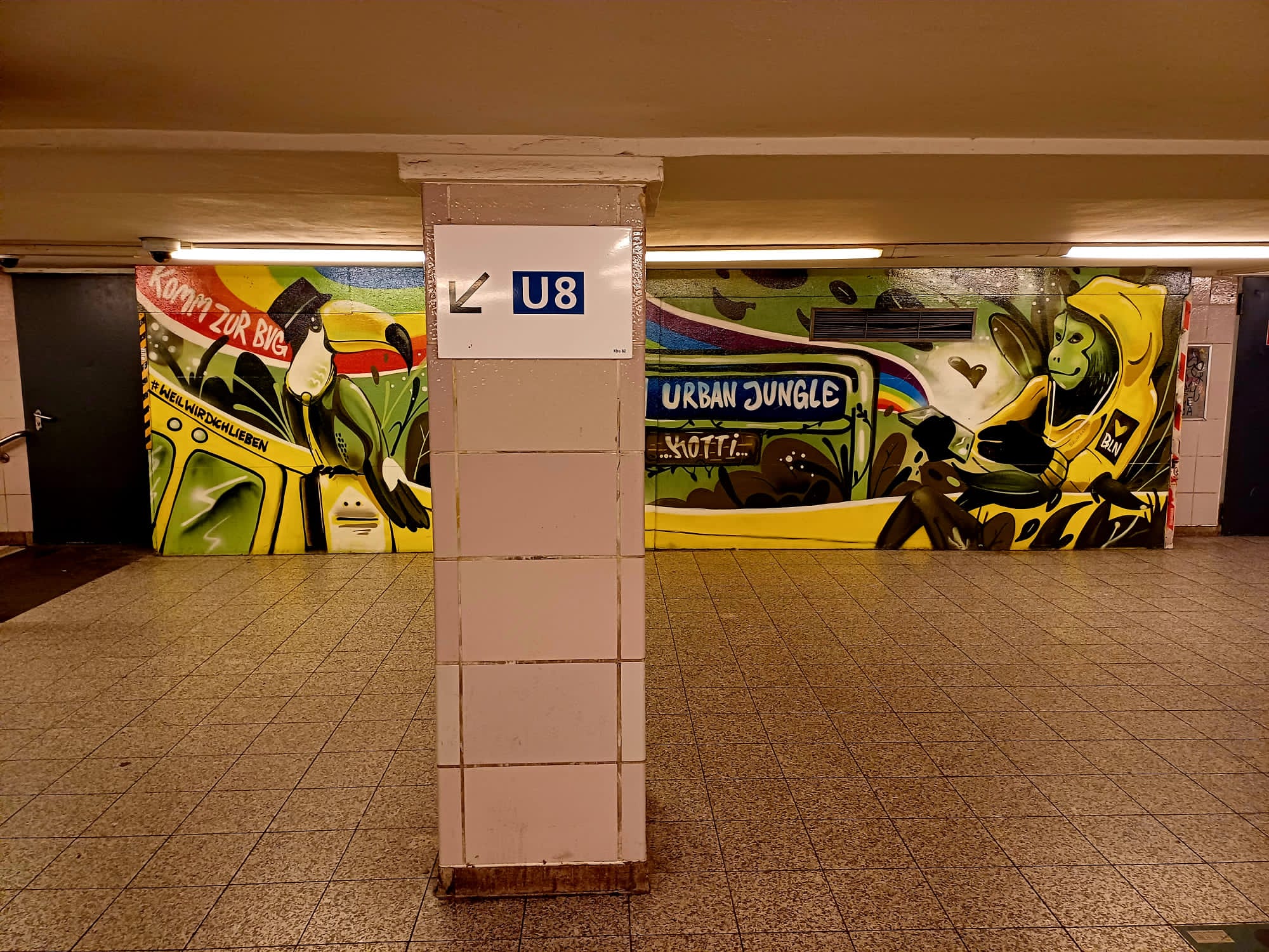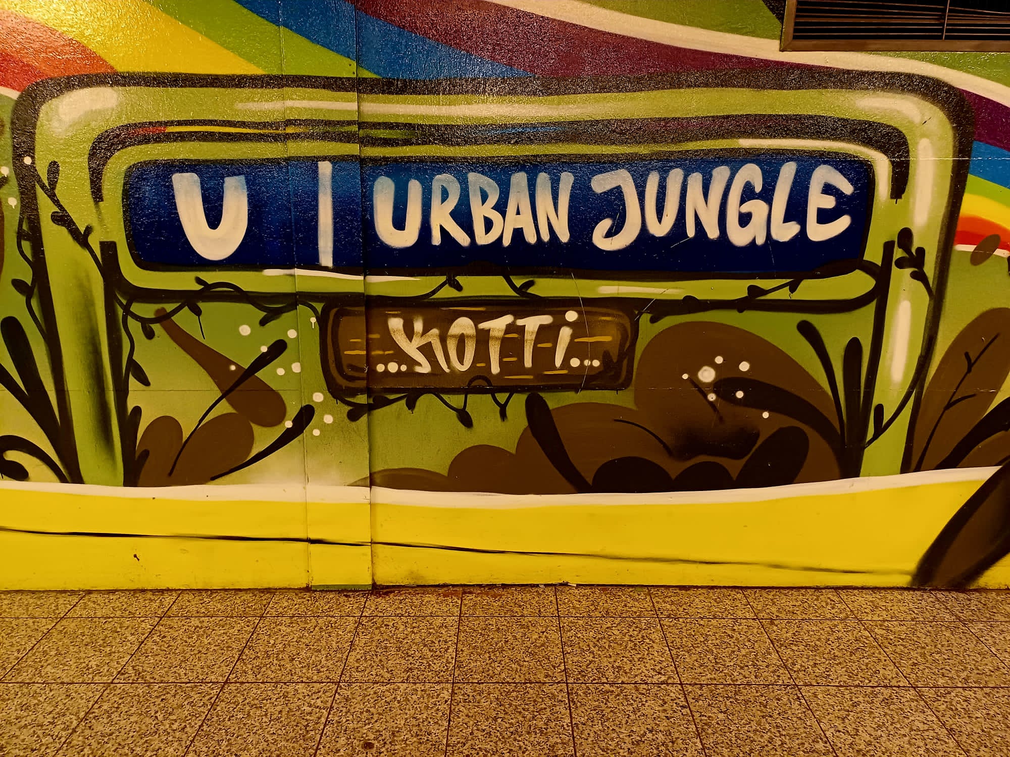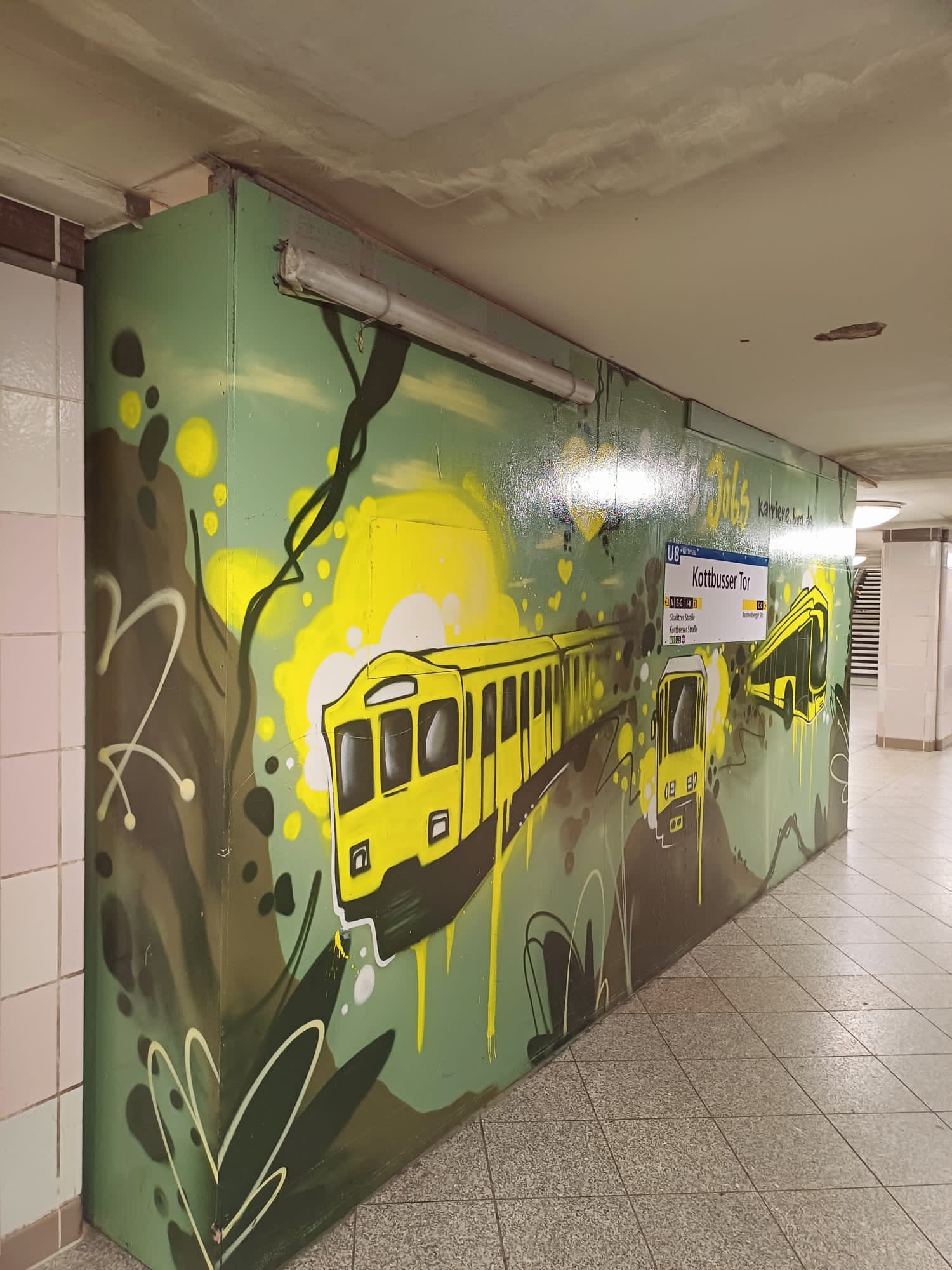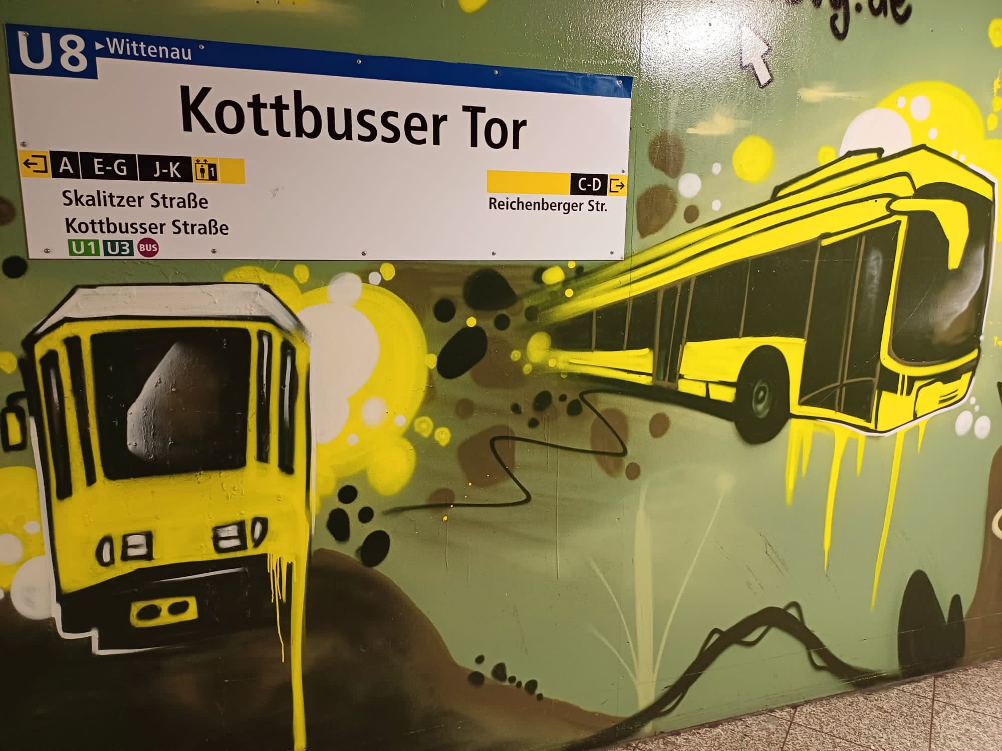 The Kottbusser Tor train station consists of several levels and floors, which were colorfully designed by the artist collective URBAN ARTISTS BERLIN for the Berliner Verkehrsbetriebe (BVG), which is the local public transport department. There are several large-scale concept walls in various locations throughout the underground section which are themed and named „Urban Jungle“.