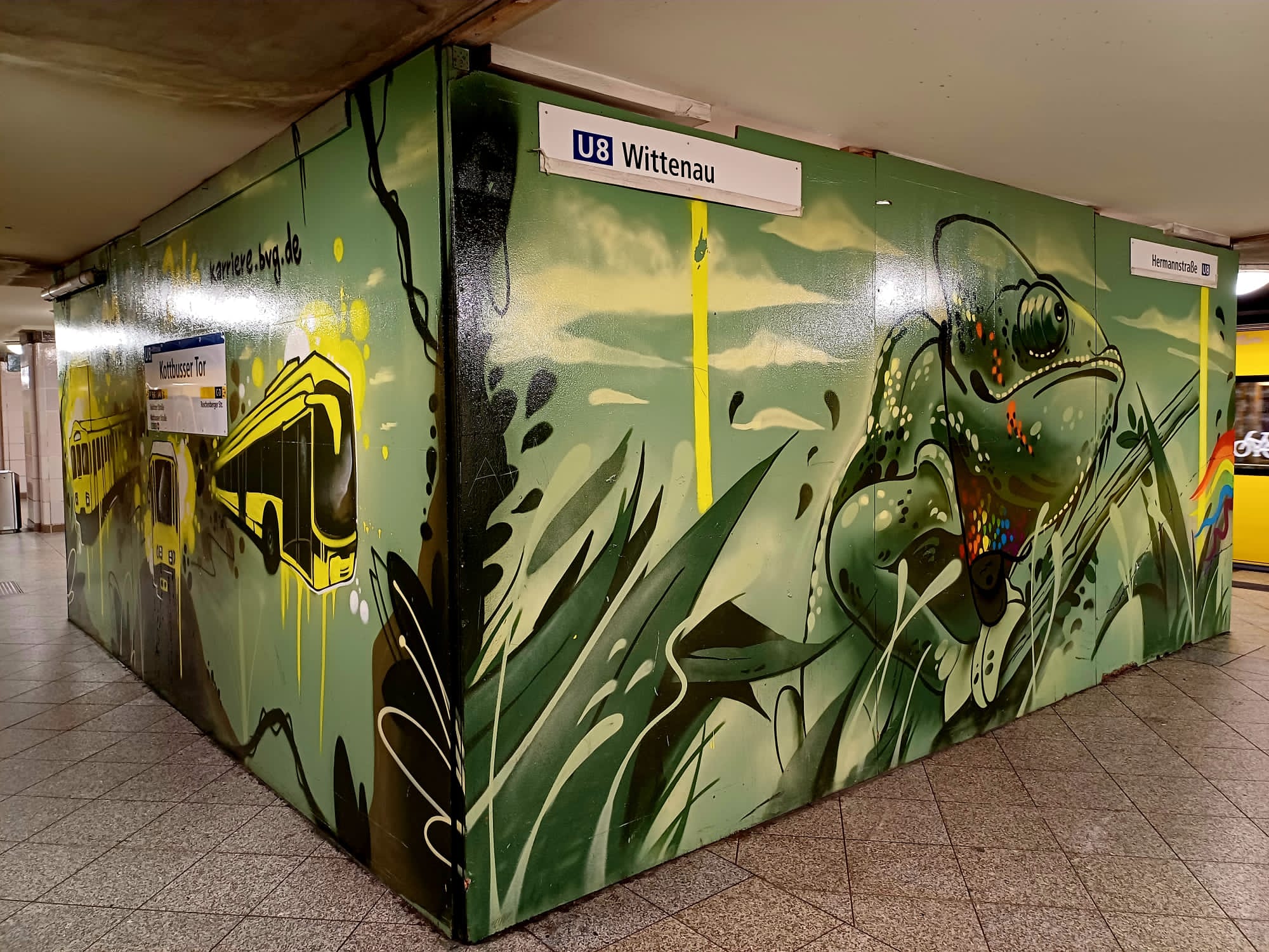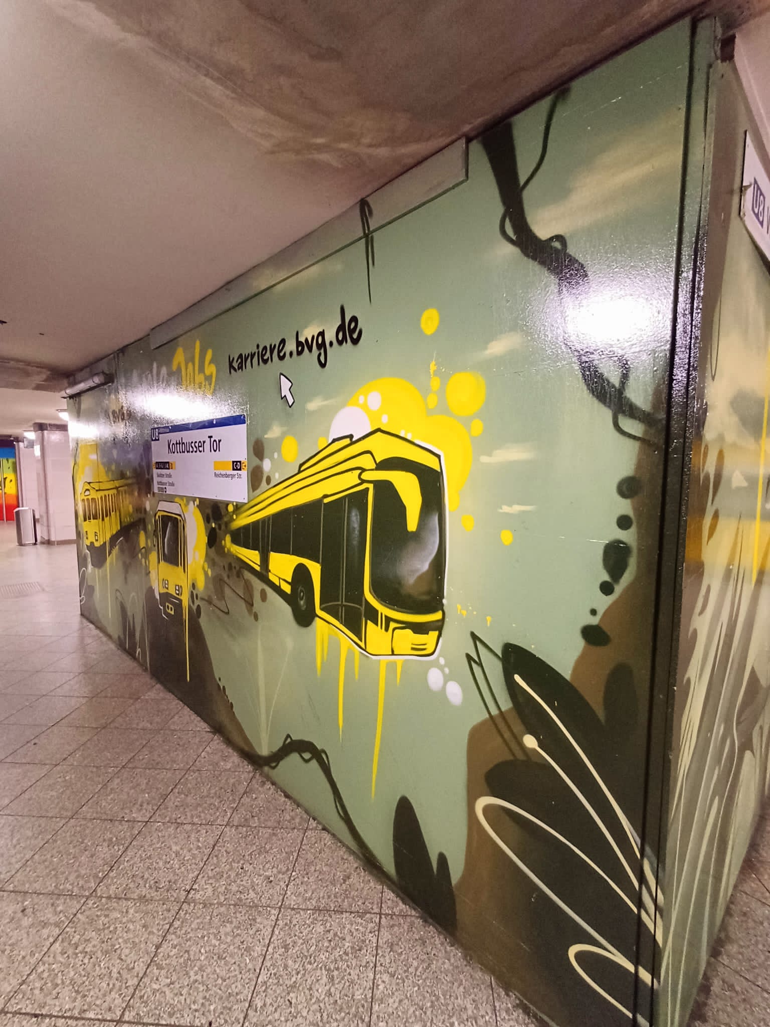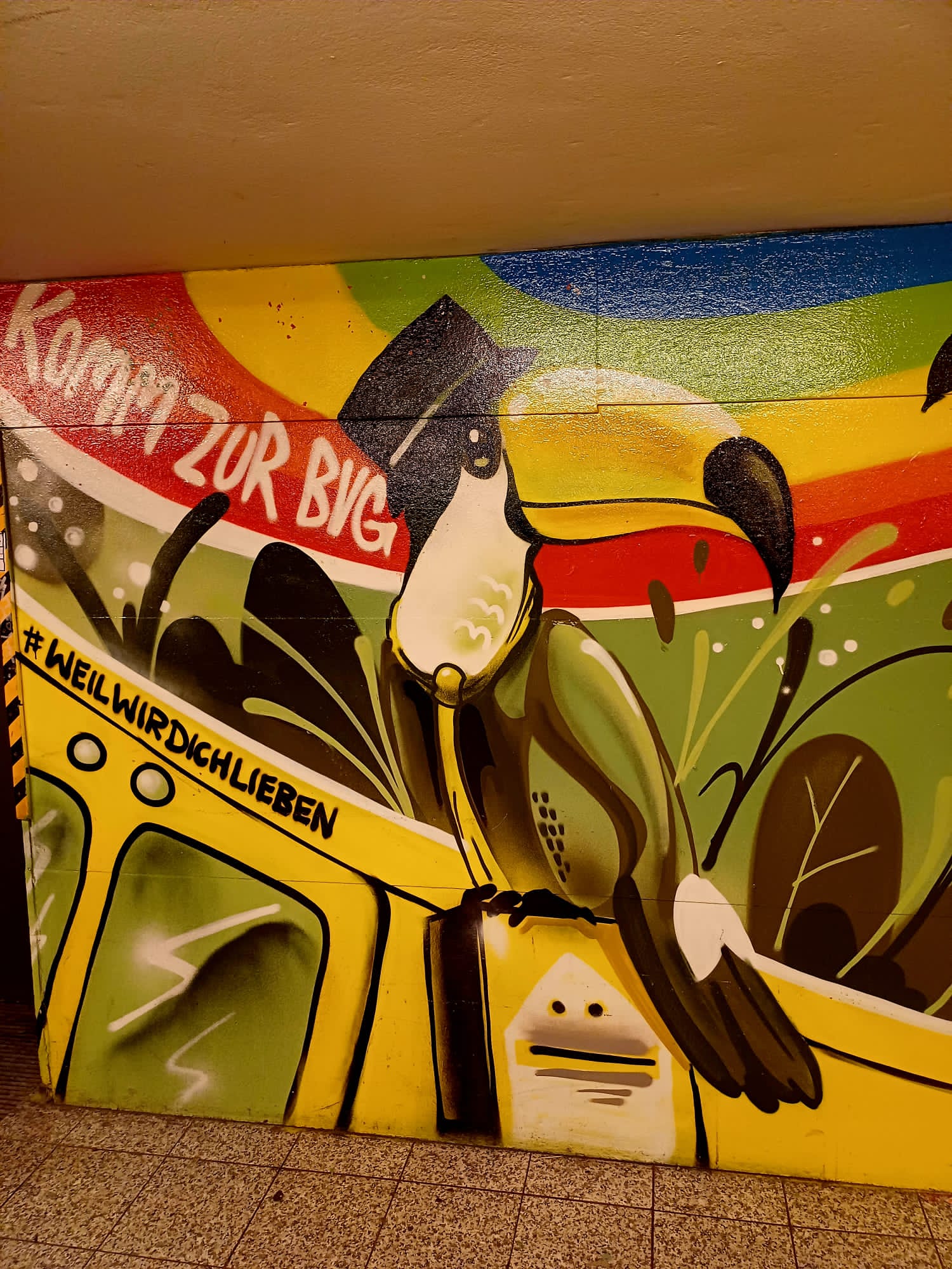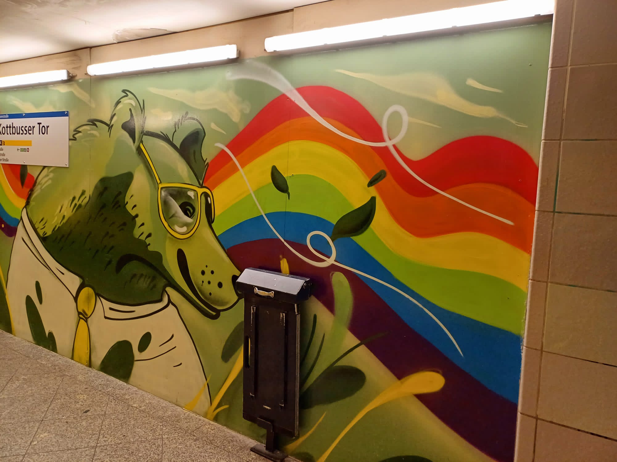 The Kottbusser Tor train station consists of several levels and floors, which were colorfully designed by the artist collective URBAN ARTISTS BERLIN for the Berliner Verkehrsbetriebe (BVG), which is the local public transport department. There are several large-scale concept walls in various locations throughout the underground section which are themed and named „Urban Jungle“.
